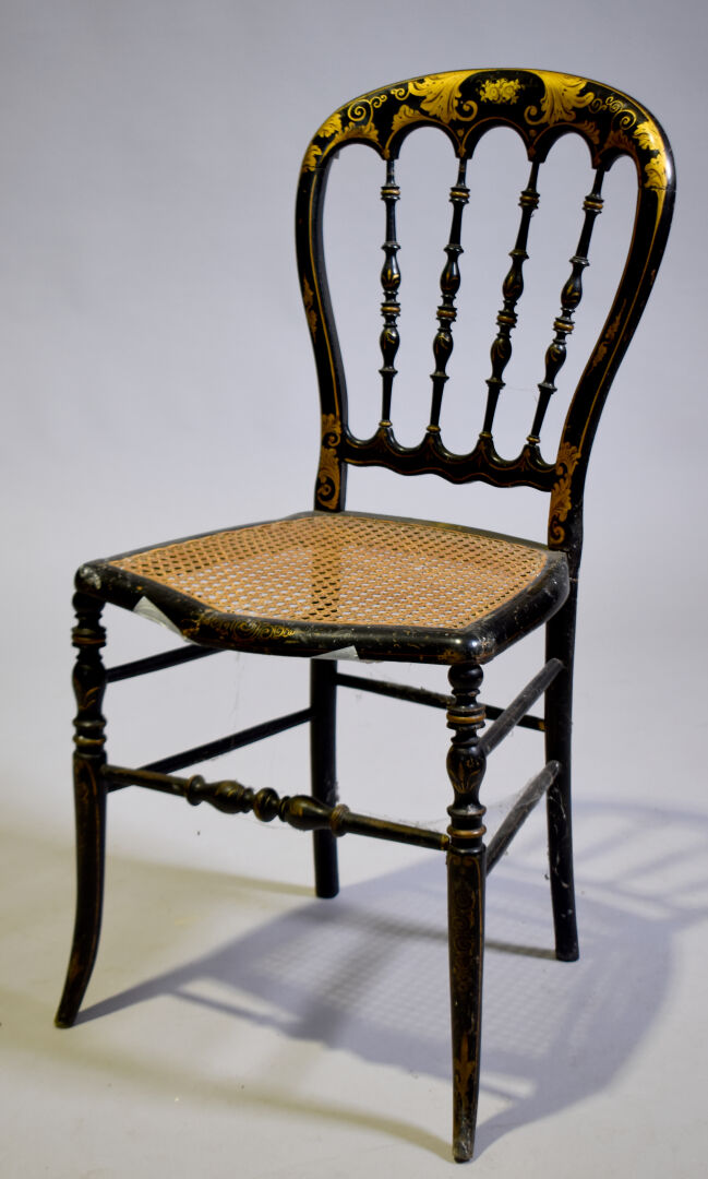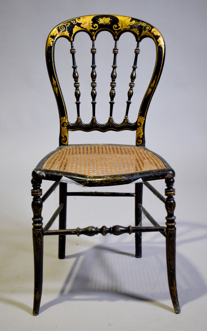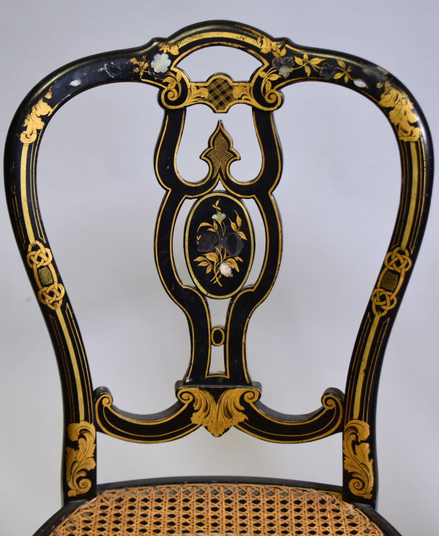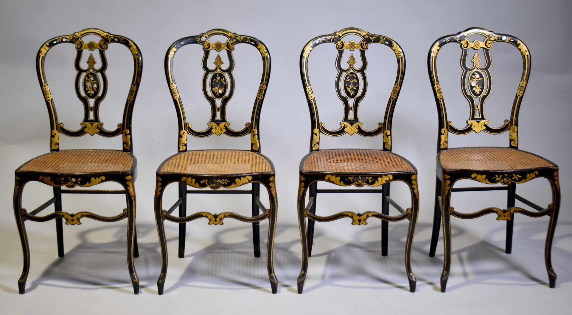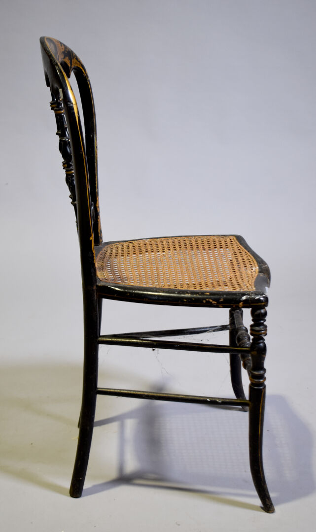Quatre chaises en bois noirci à décor en dorure et incrustations de nacre, les assises cannées (enfoncements, petits manques et usures). Epoque Napoléon III. 85 cm. On en joint une cinquième à assise cannée. Haut. : 87 cm.