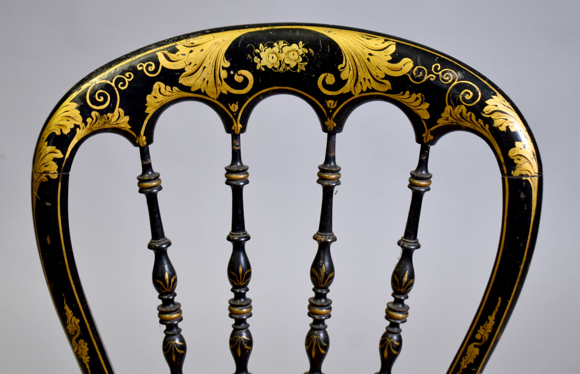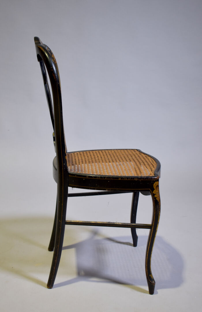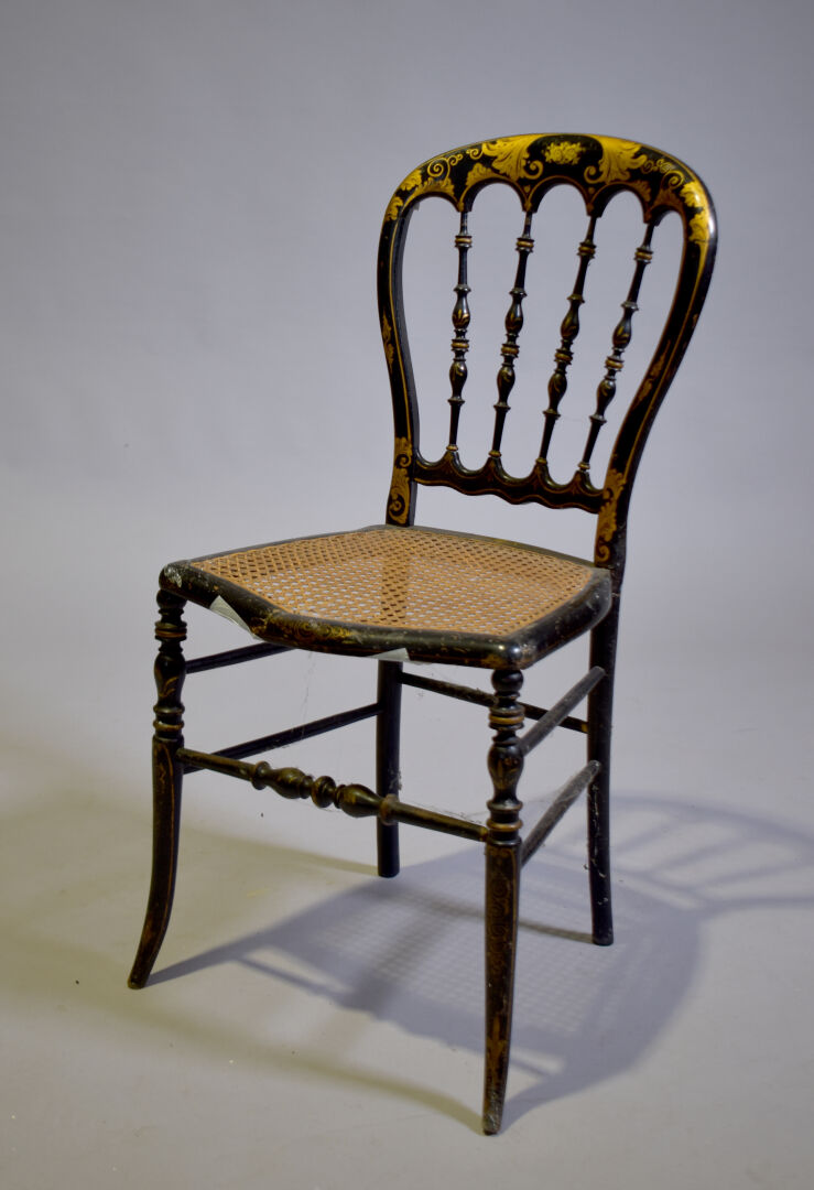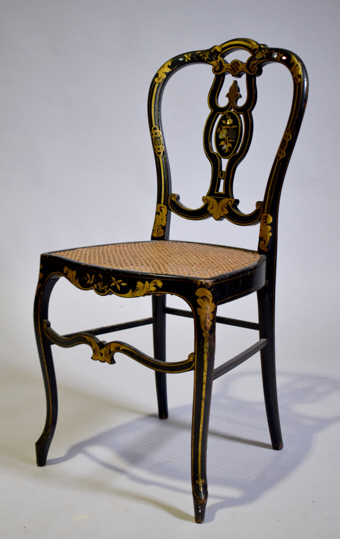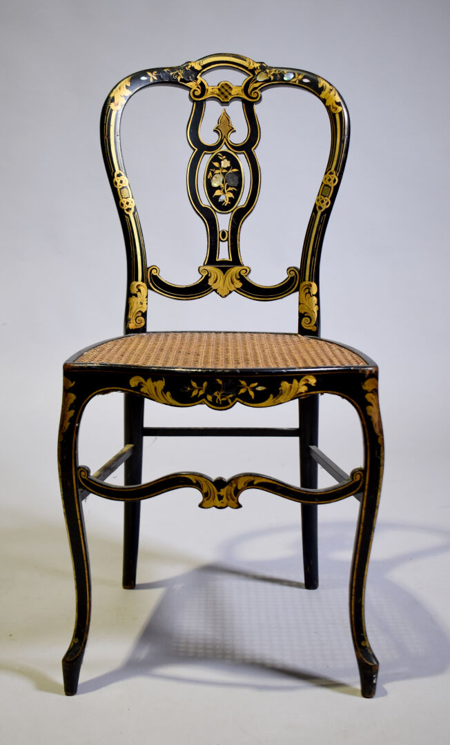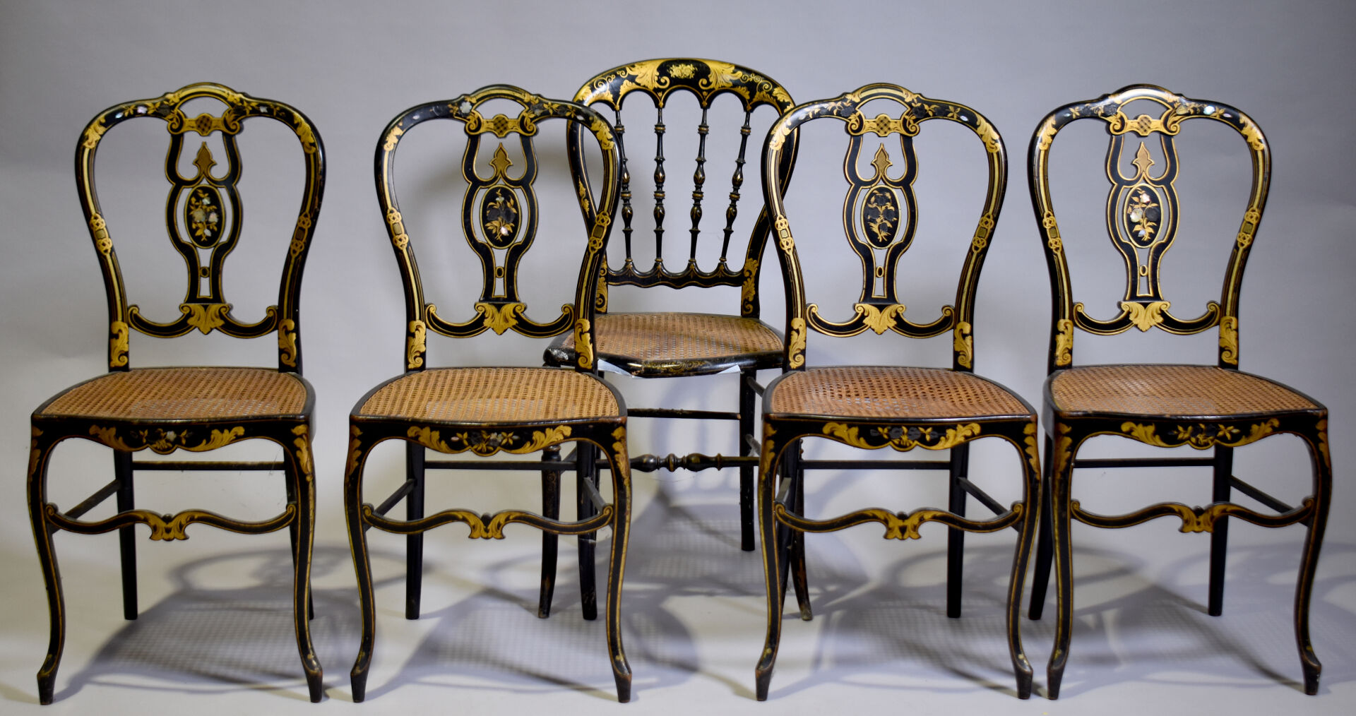 Quatre chaises en bois noirci à décor en dorure et incrustations de nacre, les assises cannées (enfoncements, petits manques et usures). Epoque Napoléon III. 85 cm. On en joint une cinquième à assise cannée. Haut. : 87 cm.