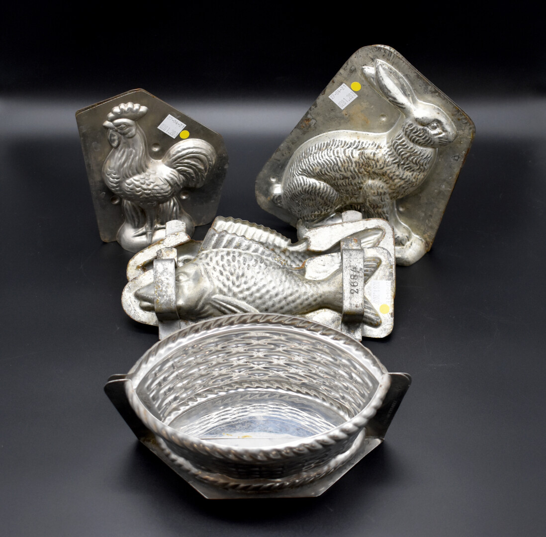 Quatre moules à chocolat en métal soit un panier, un lapin, un poisson et un coq.