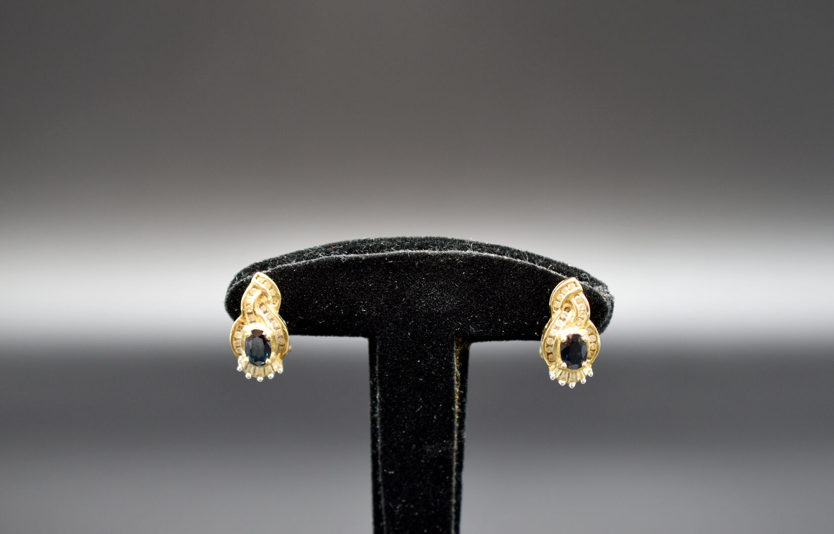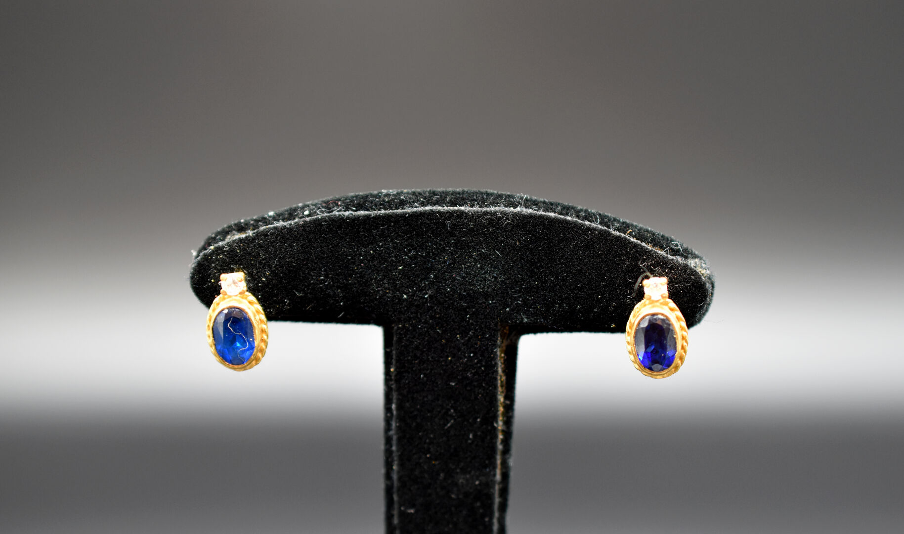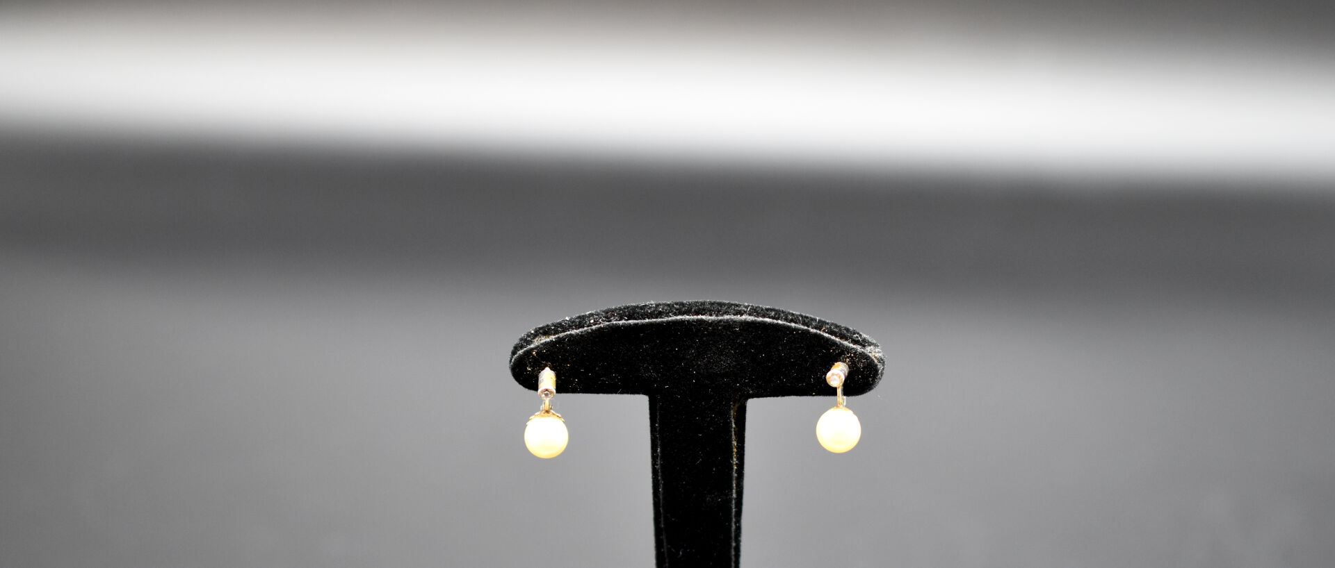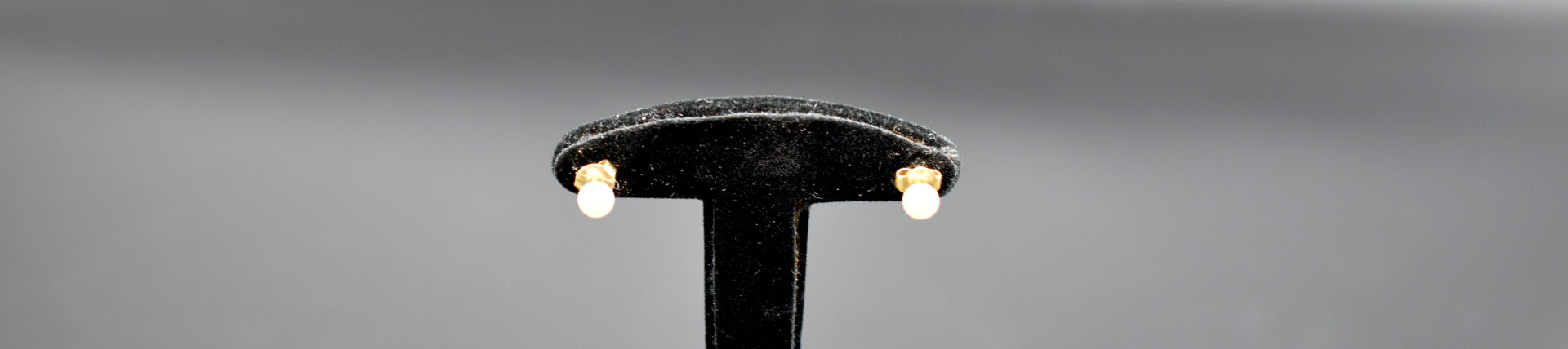 Quatre paires de puces d’oreilles en or jaune et gris 14k 585/1000e et 18K 750/1000e ornées de verroteries et pierres de couleur pour deux et perles synthétiques pour les deux autres. Poids brut 14K :4,48 g et Poids brut 18K : 6,94 g.