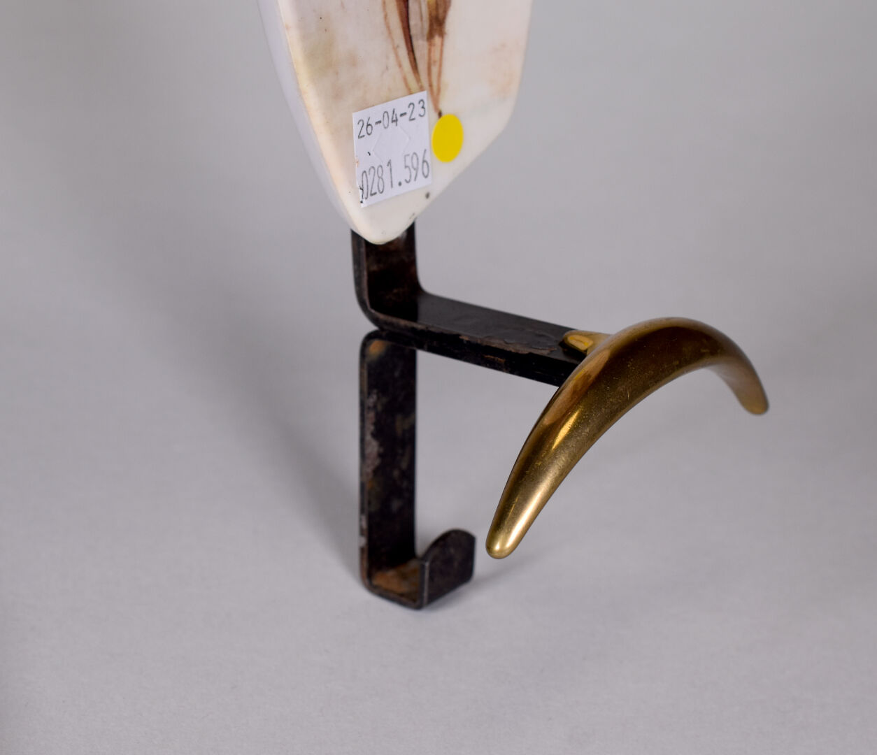 Quatre patères en résine à décor imprimé d’oiseaux et danseurs. Les montures en métal et laiton. Vers 1960. Haut. : 35,5 cm.