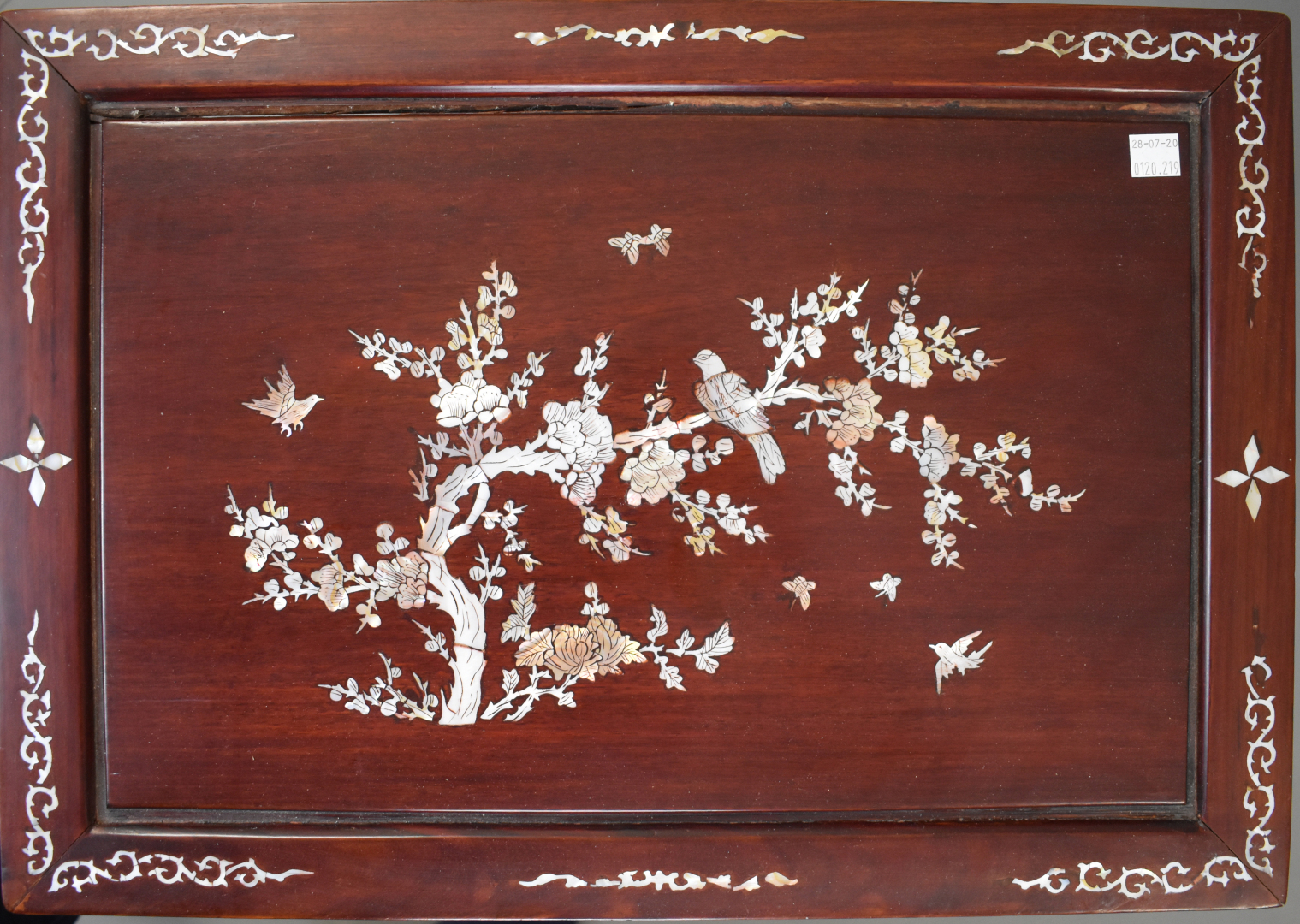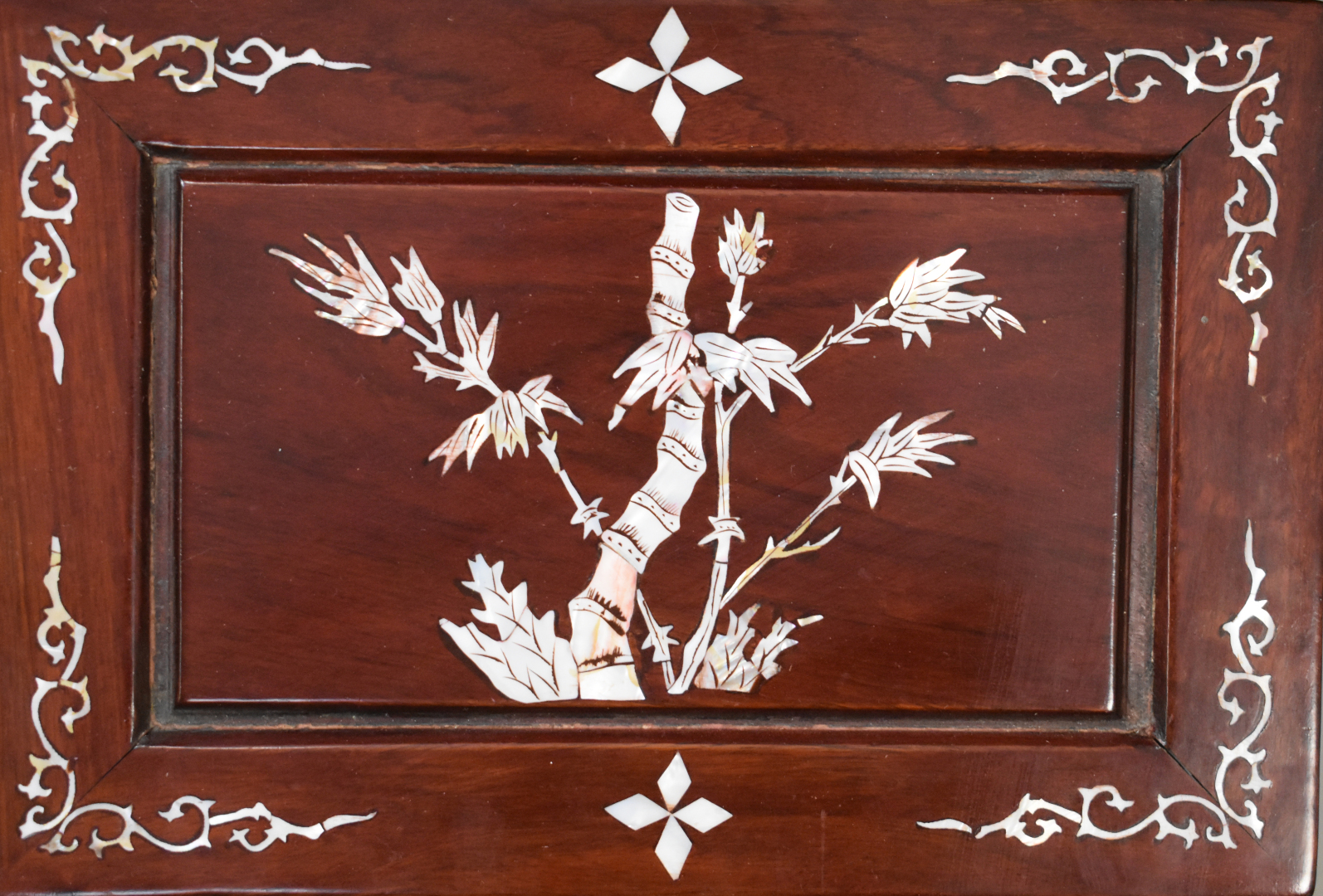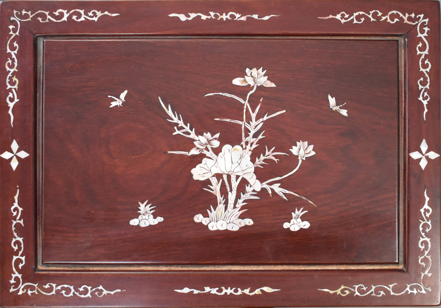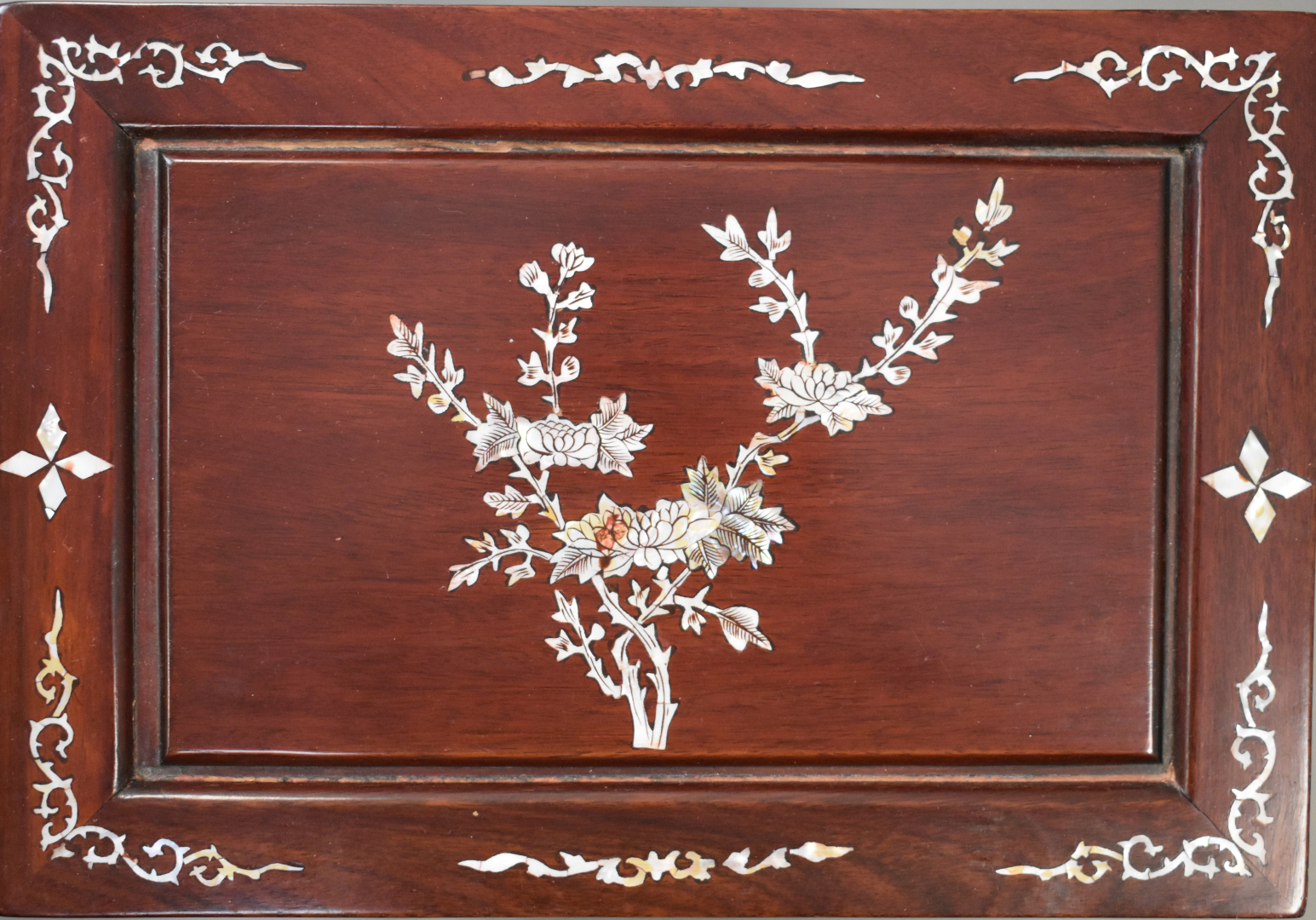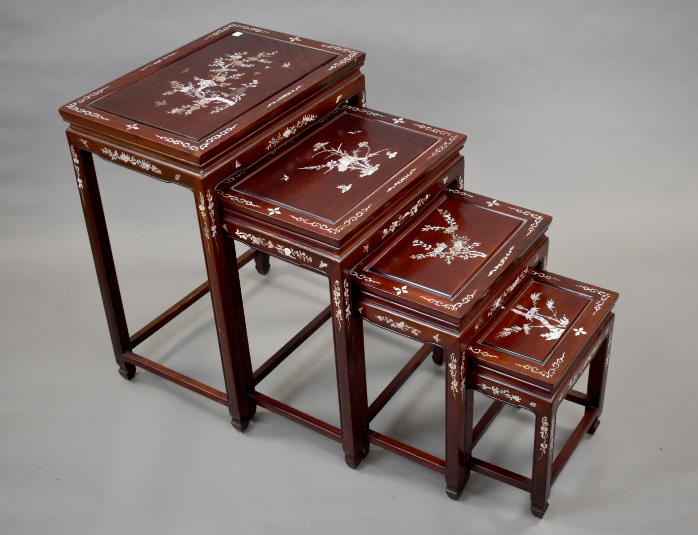 Quatre tables gigognes en bois laqué rouge à décor en nacre incrusté. Asie du Sud-Est. fin du XXe siècle.