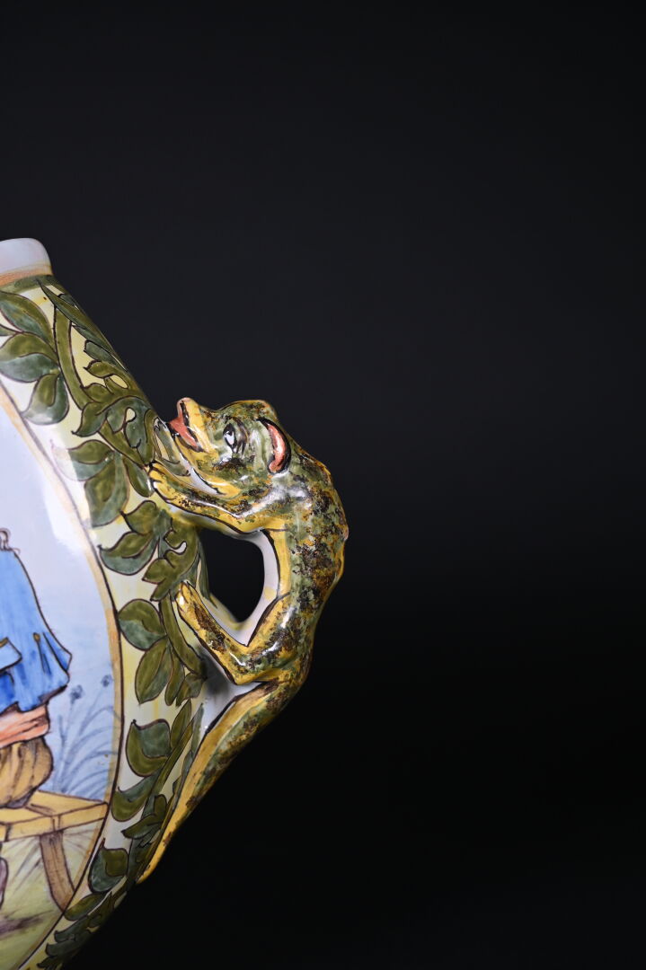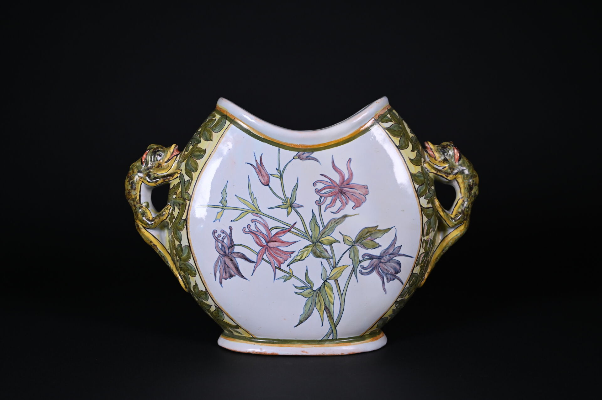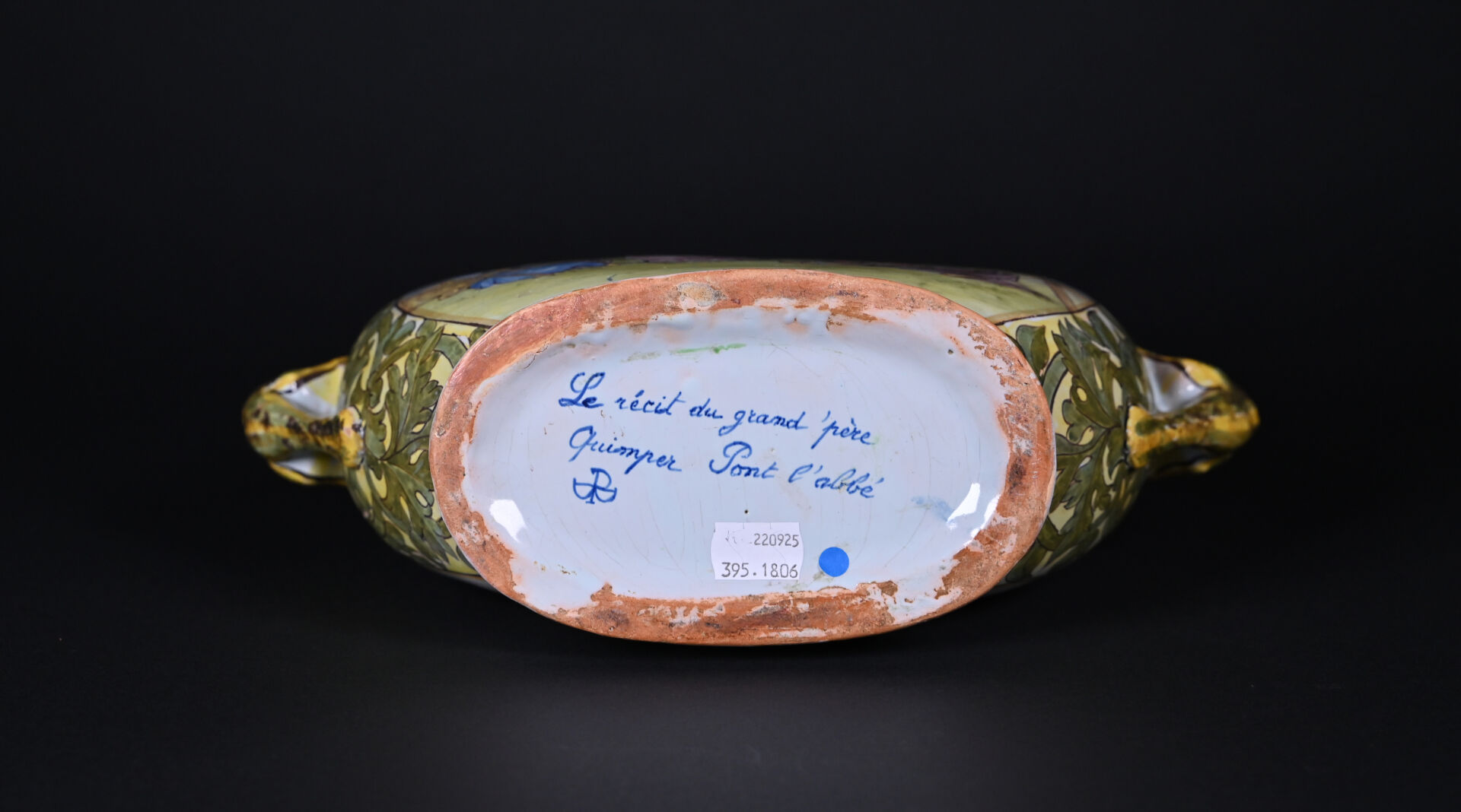 QUIMPER- PORQUIER BEAU. Vase gourde à panse aplatie et large col à décor d’une scène « Le récit du grand-père » sur une face, fleurs sur l’autre face. Les anses formées d’animaux fantastiques sur fond d’acanthes entrelacées (rétractions à l’émail, une restauration). Marqué et titré au dessous. Haut. : 25,5 cm – Larg. : 36 cm.