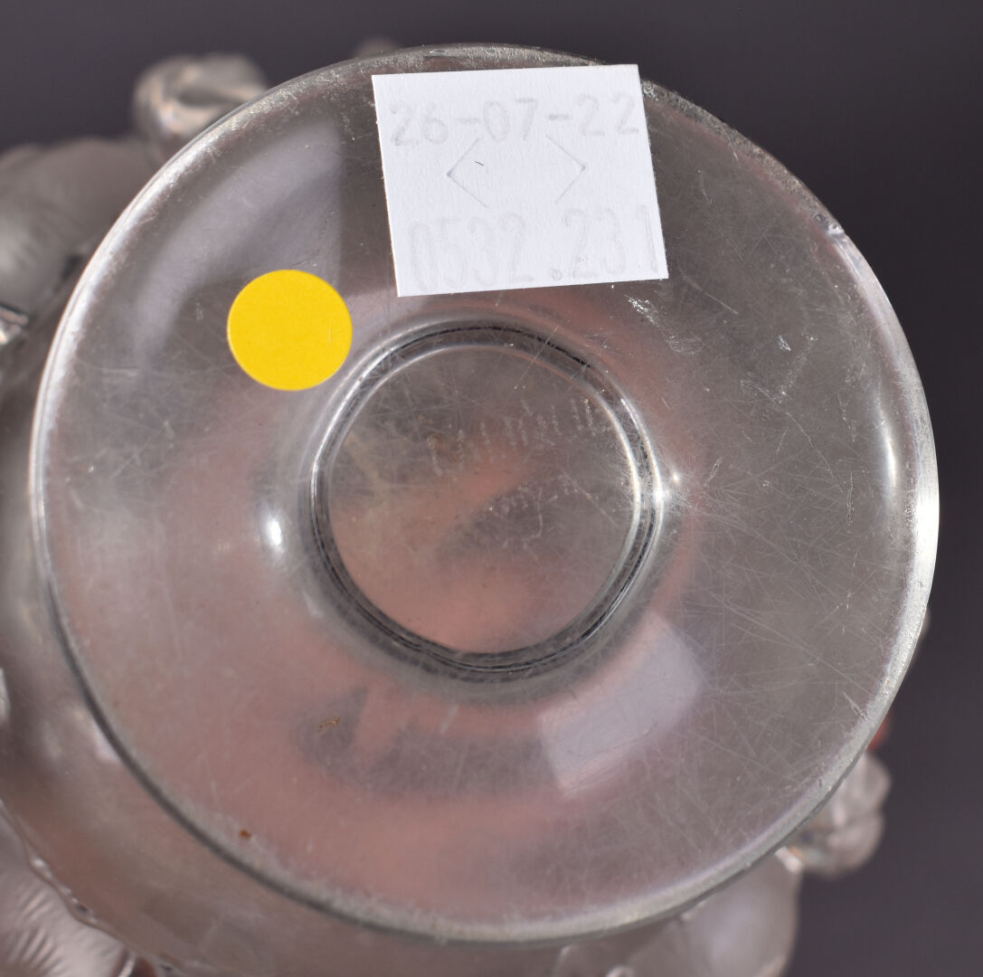 R. LALIQUE FRANCE. Vase en cristal pressé moulé modèle Dampierre (une égrenure au col, un éclat au dessous). Haut. : 12,5 cm.