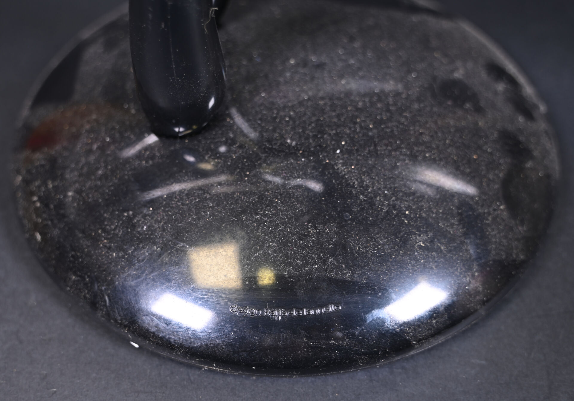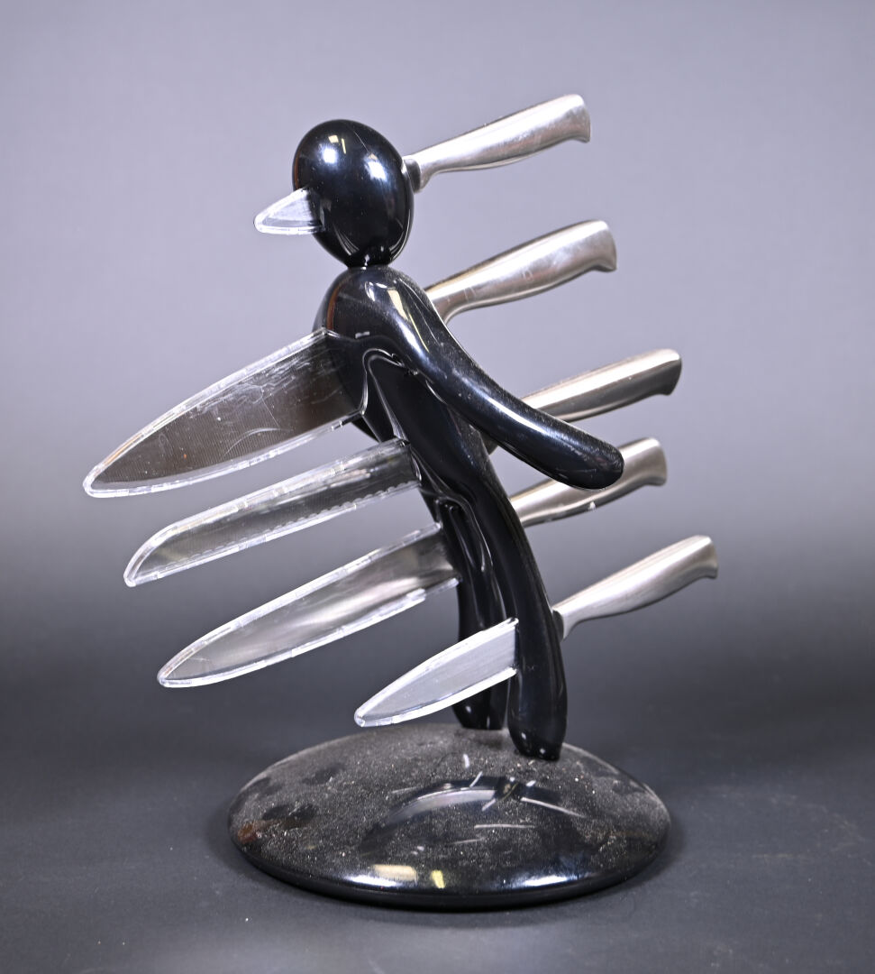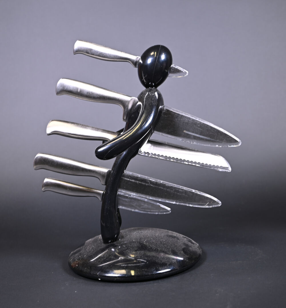 Raffaelle LANNELLO. Porte-couteaux en plastique noir représentant un personnage et un set de couteaux de cuisine. Marqué. Haut. : 37 cm.
