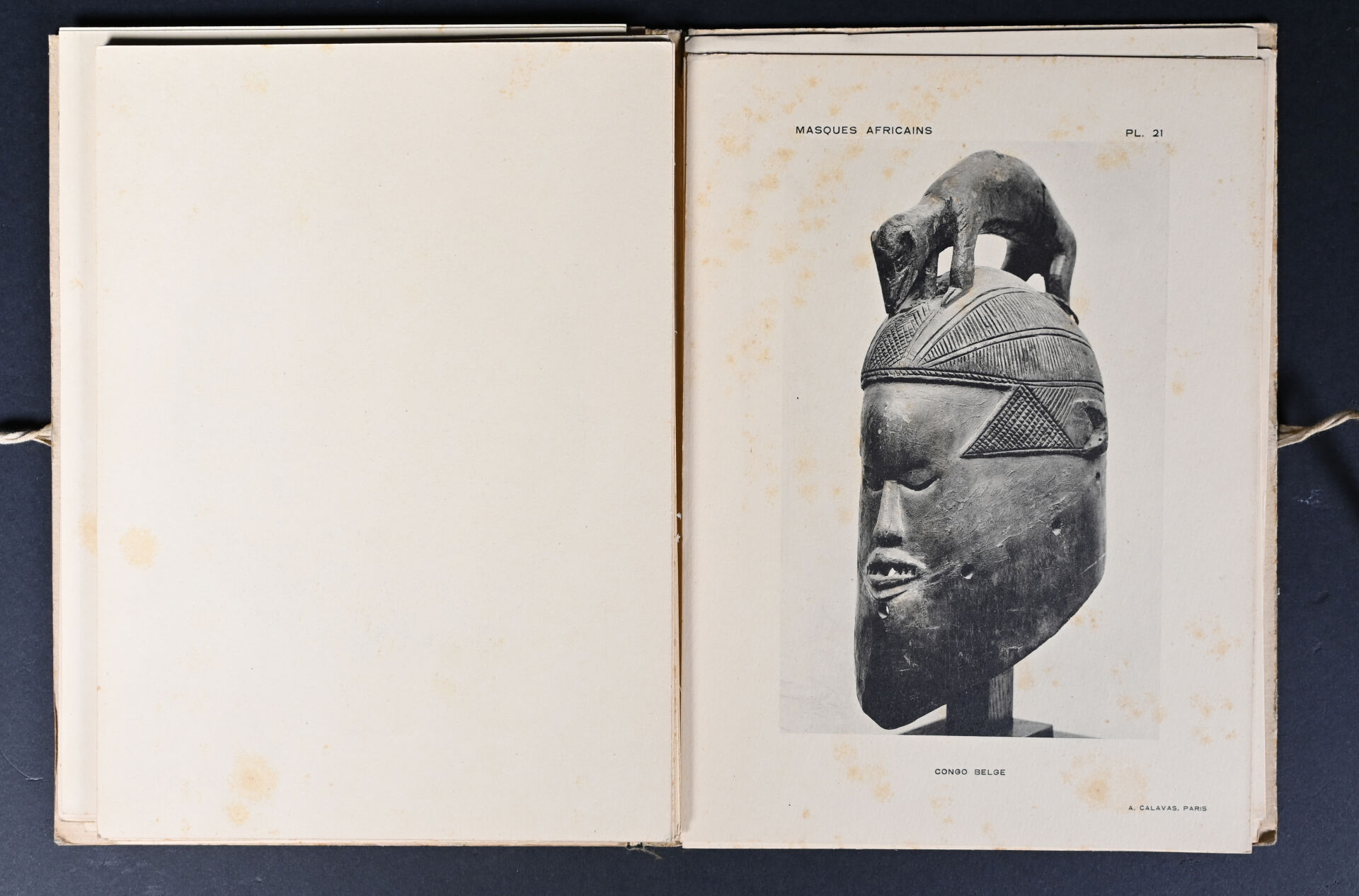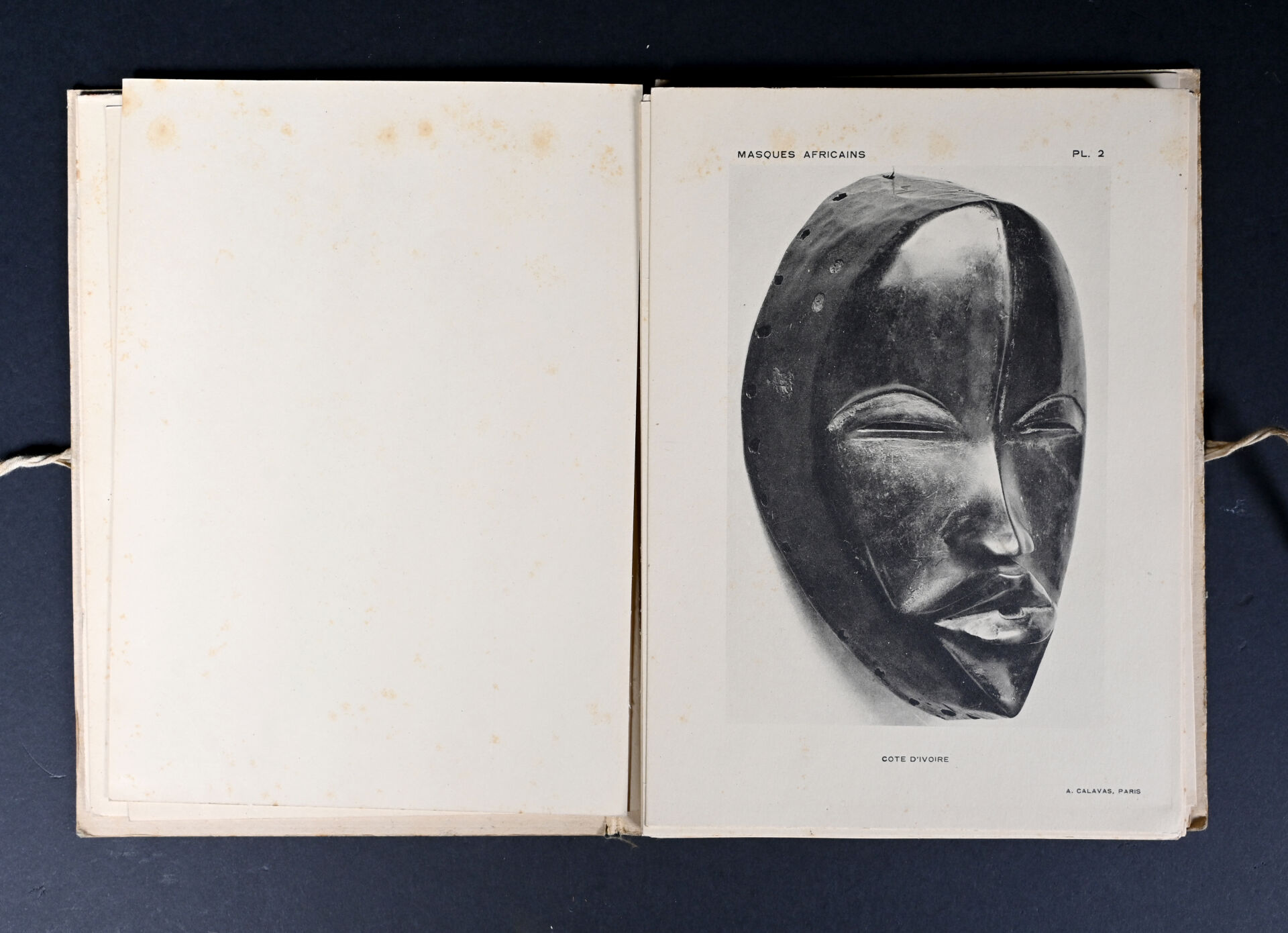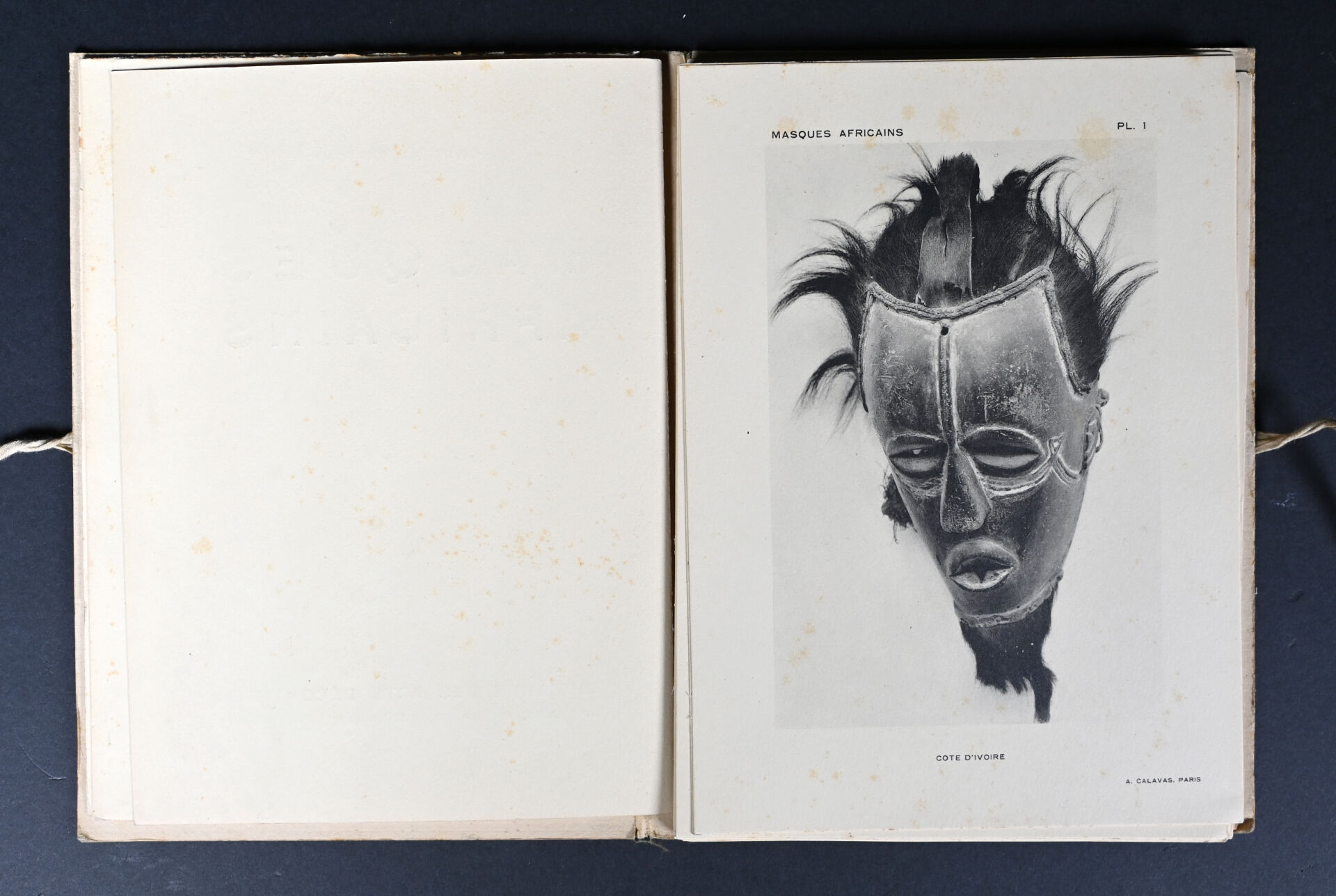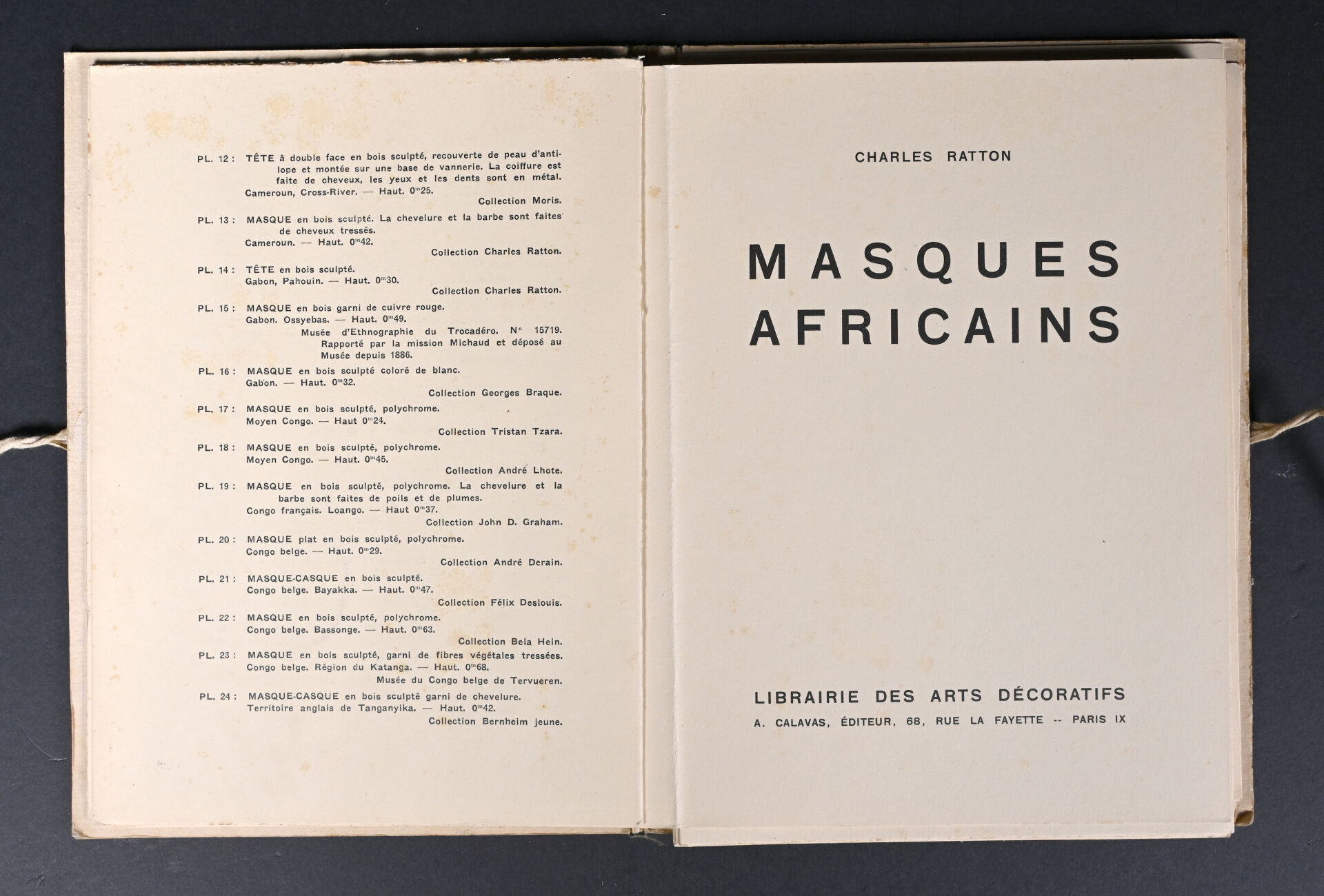 RATTON (Ch.). MASQUES AFRICAINS. P., Librairie des Arts Décoratifs, [1931]. Petit in-4 en ff. sous chemise à lacets de l’éditeur ½ toile grège, plats de papier décoré ; (6) ff., 24 pl. Rousseurs claires. ÉDITION ORIGINALE contenant 6 pages de texte de Charles Ratton et 24 PLANCHES de reproductions de masques africains en héliogravure. Ces masques provenaient des collections Tristan Tzara, Louis Carré, Paul Morand, Edouard Loeb, Moris, Charles Ratton, Georges Braque, André Lhote, André Derain, Bernheim jeune, etc.