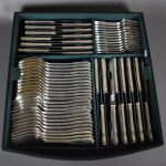 RAVINET D’ENFERT. Ménagère en métal argenté comprenant trois dessous de carafe, douze grands couverts, douze grands couteaux, douze couteaux à entremets, treize fourchettes à gâteaux, douze couverts à entremets, douze couverts à poissons, douze fourchettes à mignardises, douze pelles à glace, douze cuillères à café et treize pièces de service. Boîtes. On joint un plateau en métal argenté de la maison GALLIA pour CHRISTOFLE.