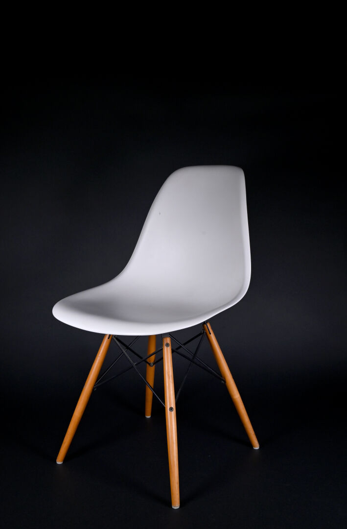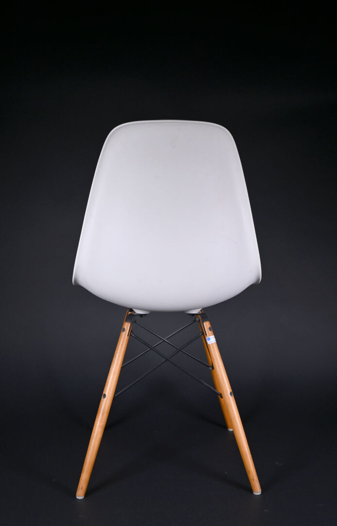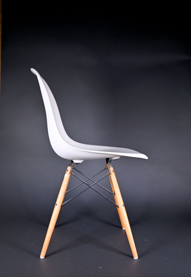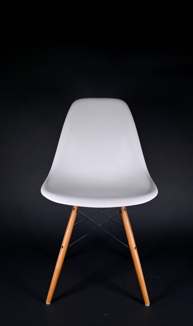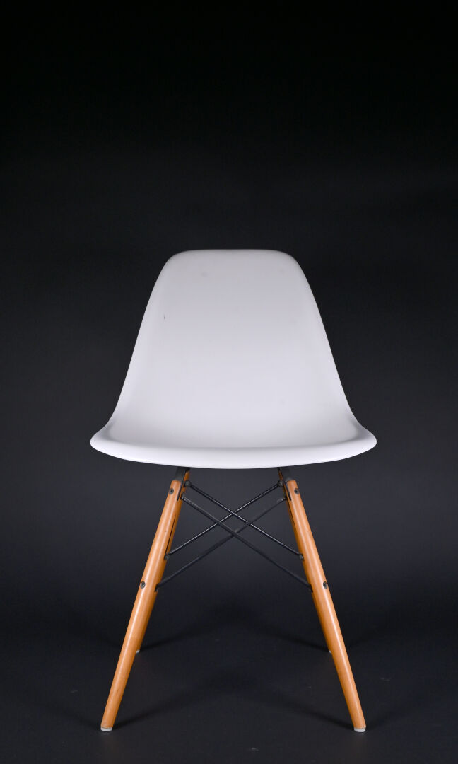 Ray & Charles EAMES (1912-1978 et 1907-1988), designers, & VITRA, éditeur. Quatre chaises modèle « plastic chair » à coque moulée crème et piètement bois et métal. Au dessous marquée et étiquette. Usures d’usage. Haut. : 80 cm.