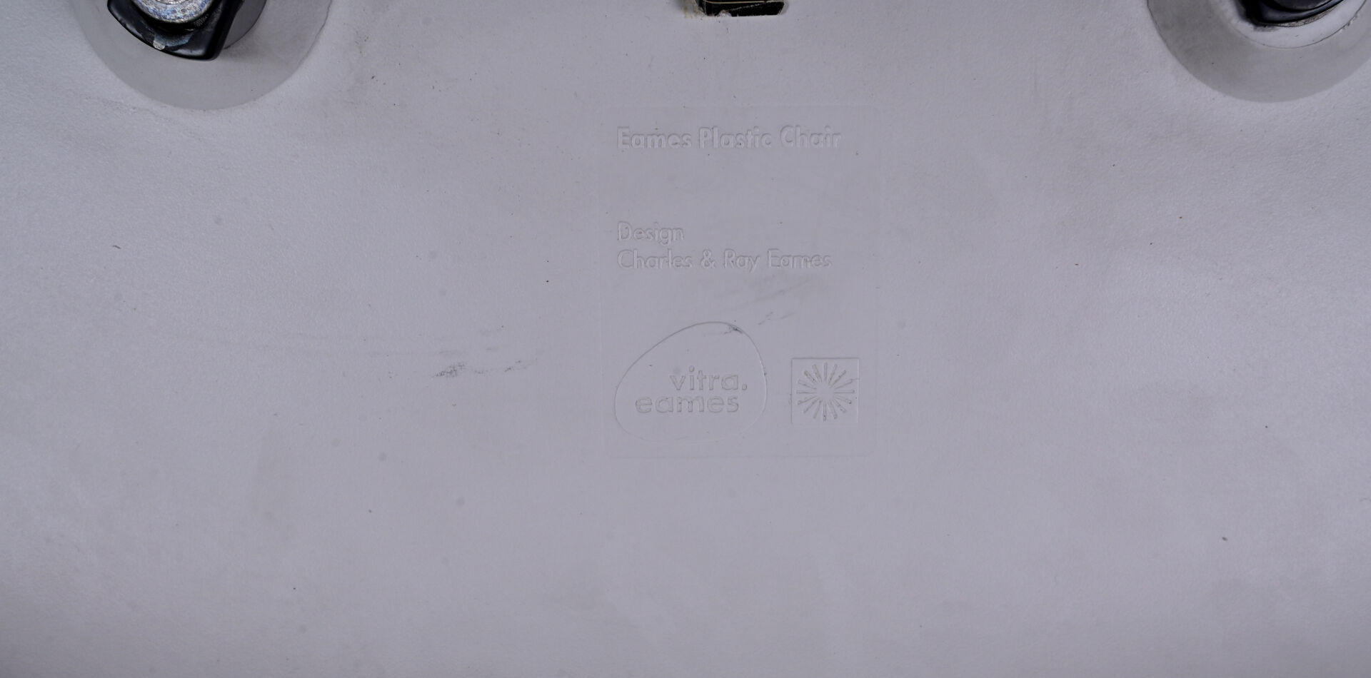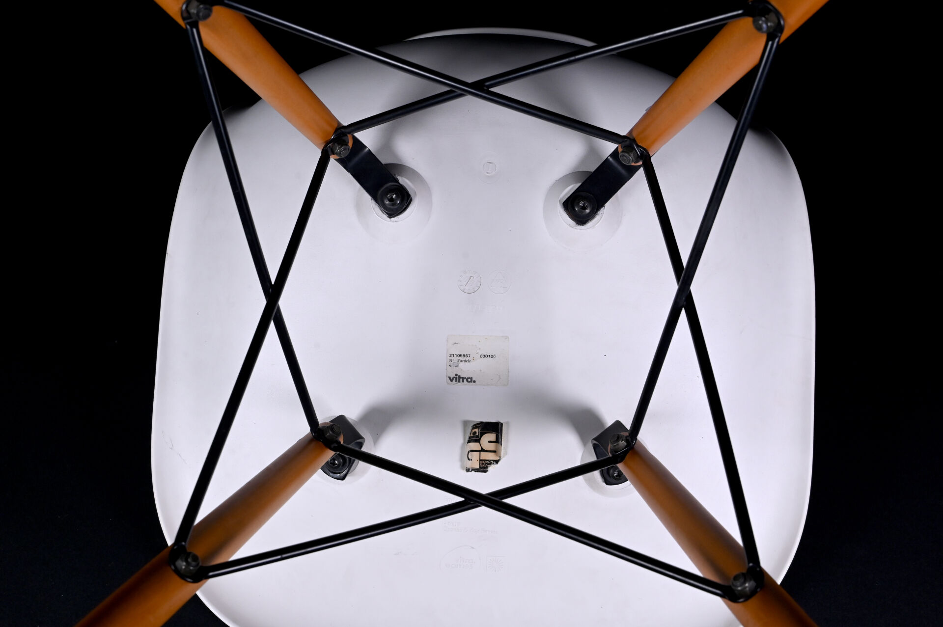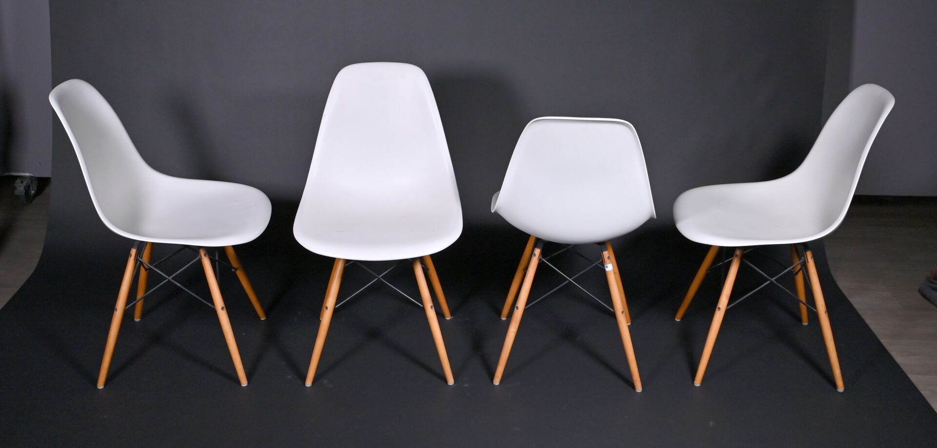 Ray & Charles EAMES (1912-1978 et 1907-1988), designers, & VITRA, éditeur. Quatre chaises modèle « plastic chair » à coque moulée crème et piètement bois et métal. Au dessous marquée et étiquette. Usures d’usage. Haut. : 80 cm.