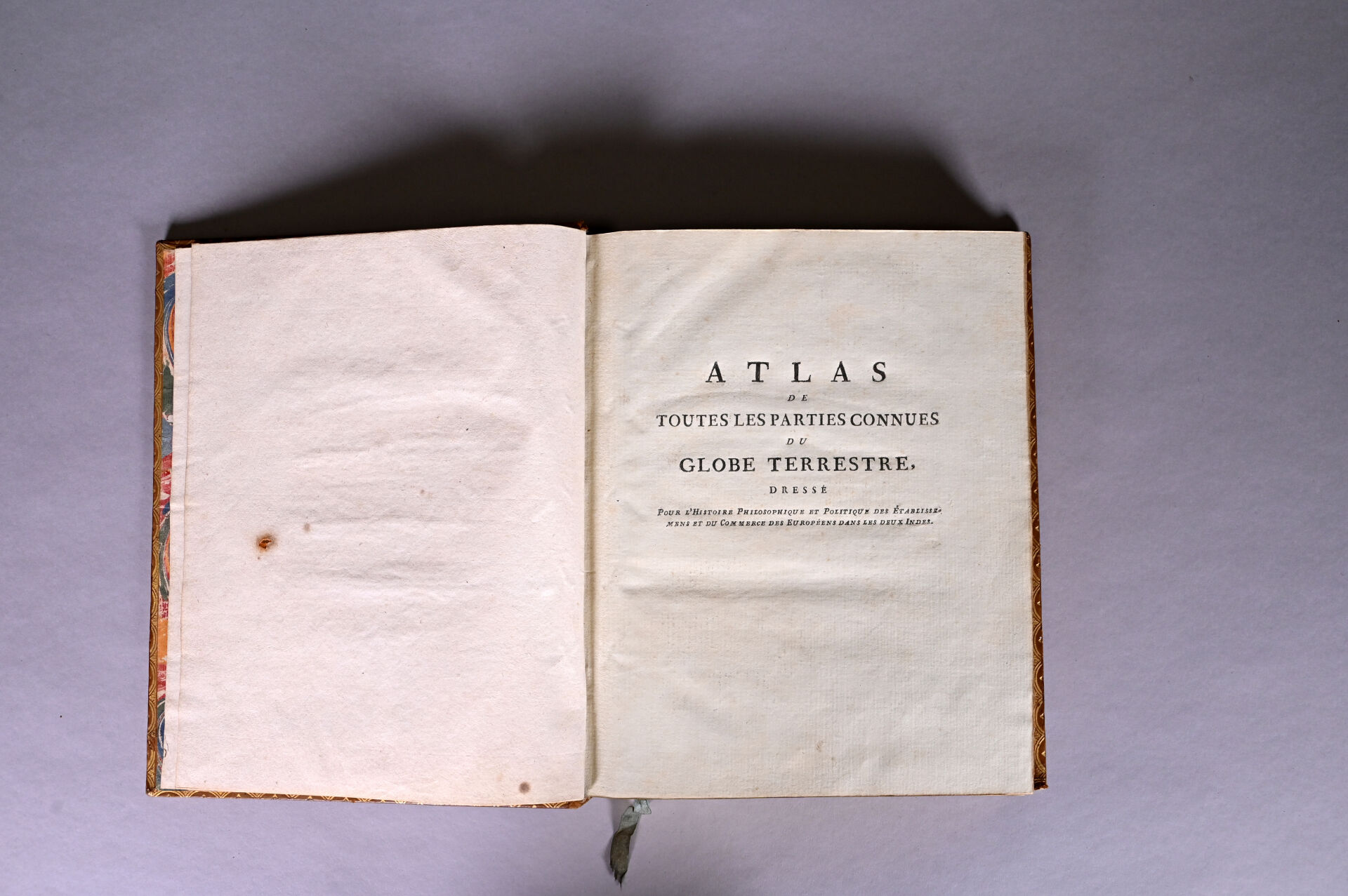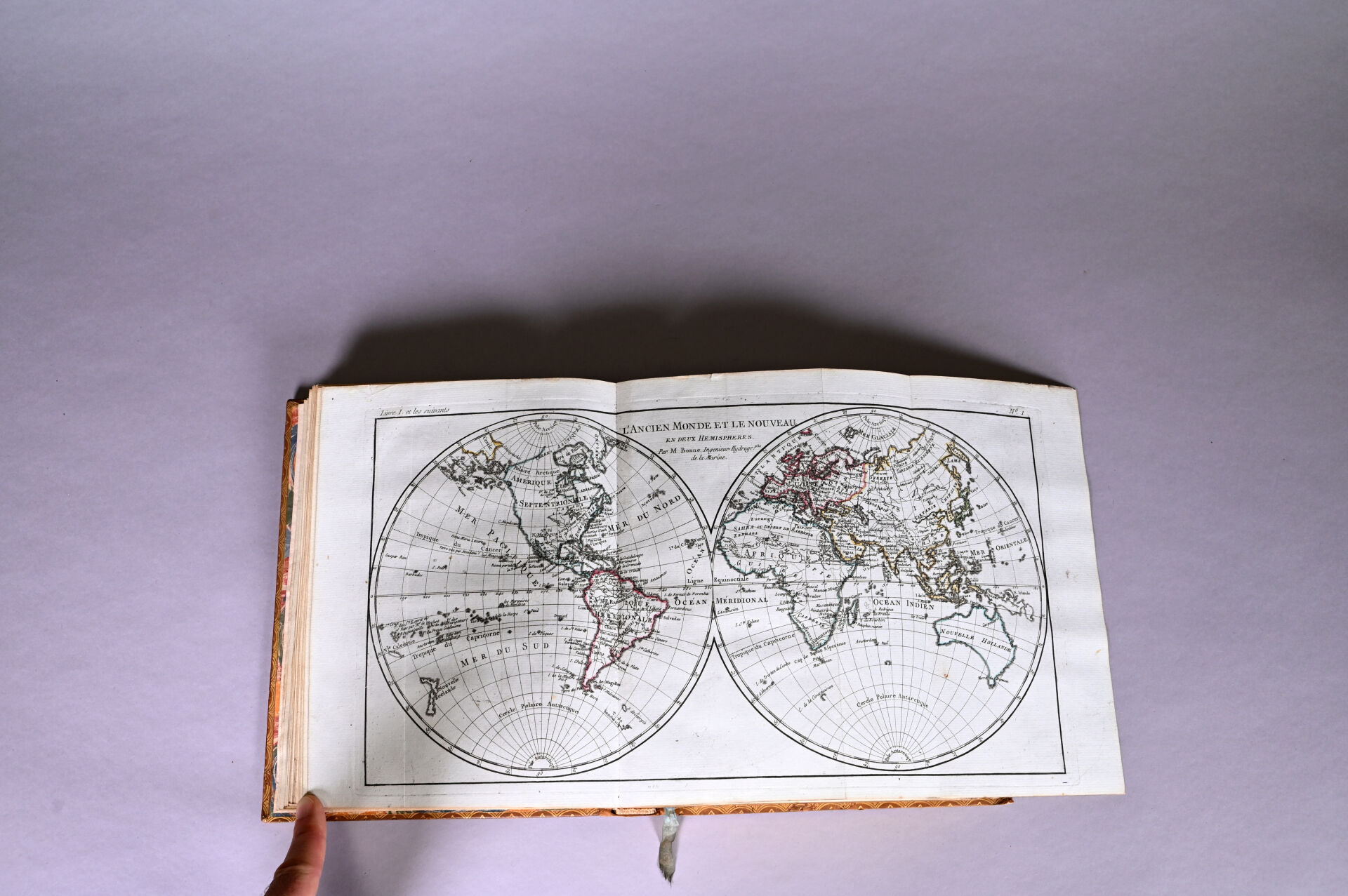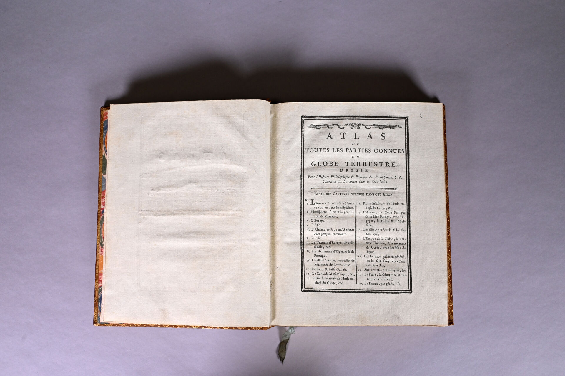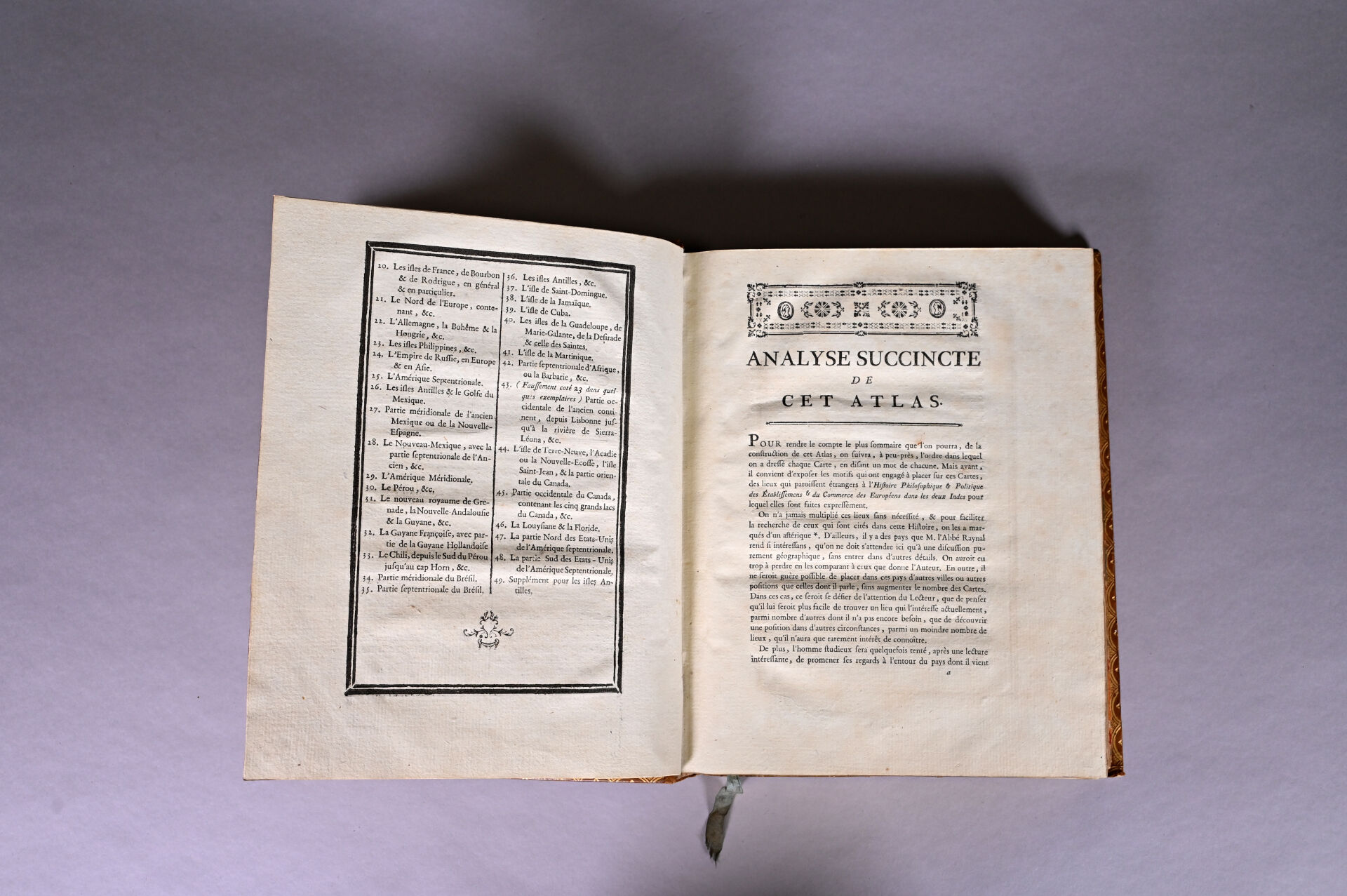 [RAYNAL (Abbé)]. ATLAS DE TOUTES LES PARTIES CONNUES DU GLOBE TERRESTRE dressé pour l’Histoire Philosophique et Politique des Établissemens et du Commerce des Européens dans les Deux Indes. [Genève, J.-L. Pellet, 1780]. In-4 veau blond, triple encadrement de filet doré sur les plats, dos à nerfs orné, pièce de titre, roulette intérieure, tranches dorées (Reliure de l’époque) ; (2) ff. de titre et table des cartes, 28 pages d’ « Analyse succincte de cet Atlas », 50 cartes + 2 tableaux dépliants montés sur onglets. Petit accroc avec infime manque à la coiffe supérieure, 2 coins émoussés. ATLAS COMPLET des 50 CARTES gravées et soigneusement aquarellées à l’époque, numérotées de 1 à 49 (une carte « 17 bis ») la plupart à double page et toutes montées sur onglets, ainsi que les 2 grands TABLEAUX dépliants in fine. Cet atlas vient en complément des volumes du texte de l’Abbé Raynal. BEL EXEMPLAIRE, frais : les cartes sont gravées sur un beau vergé légèrement bleuté. ¶ Sabin, 68081. Dimensions du livre fermé : 26 x 21 x 3,5 cm. Dimensions d’une carte : 25 x 47,5 cm.