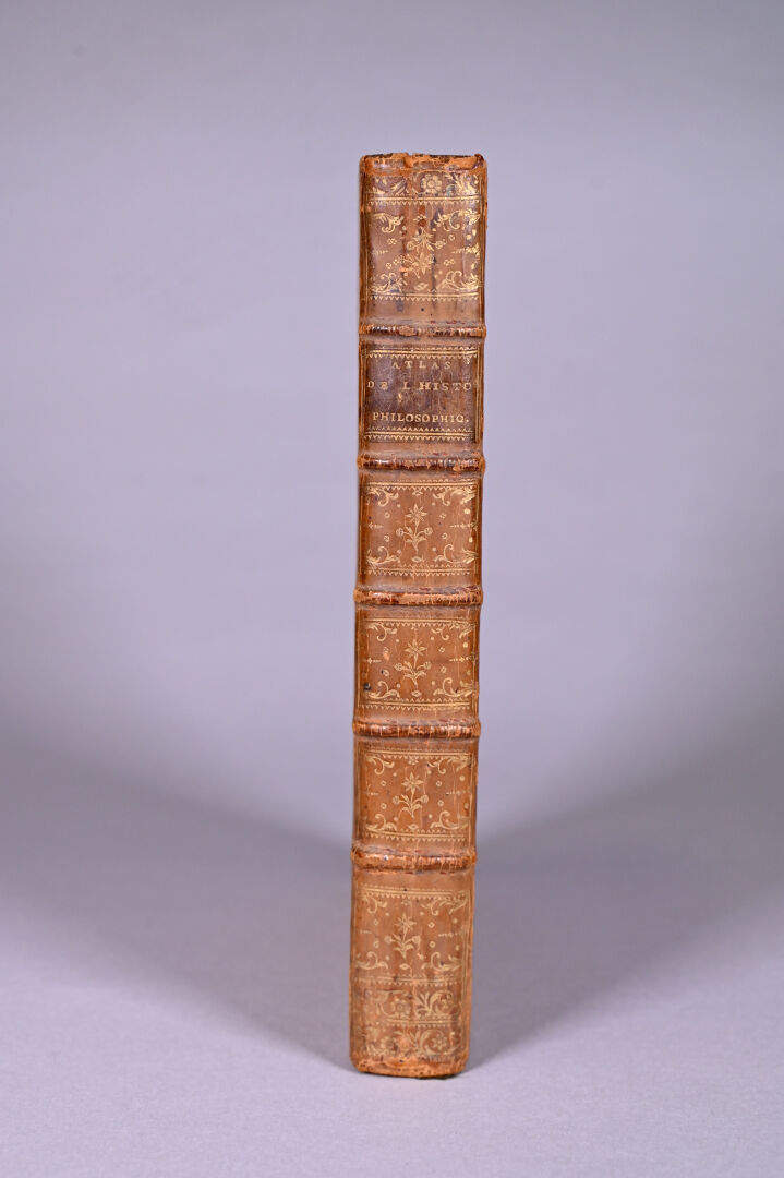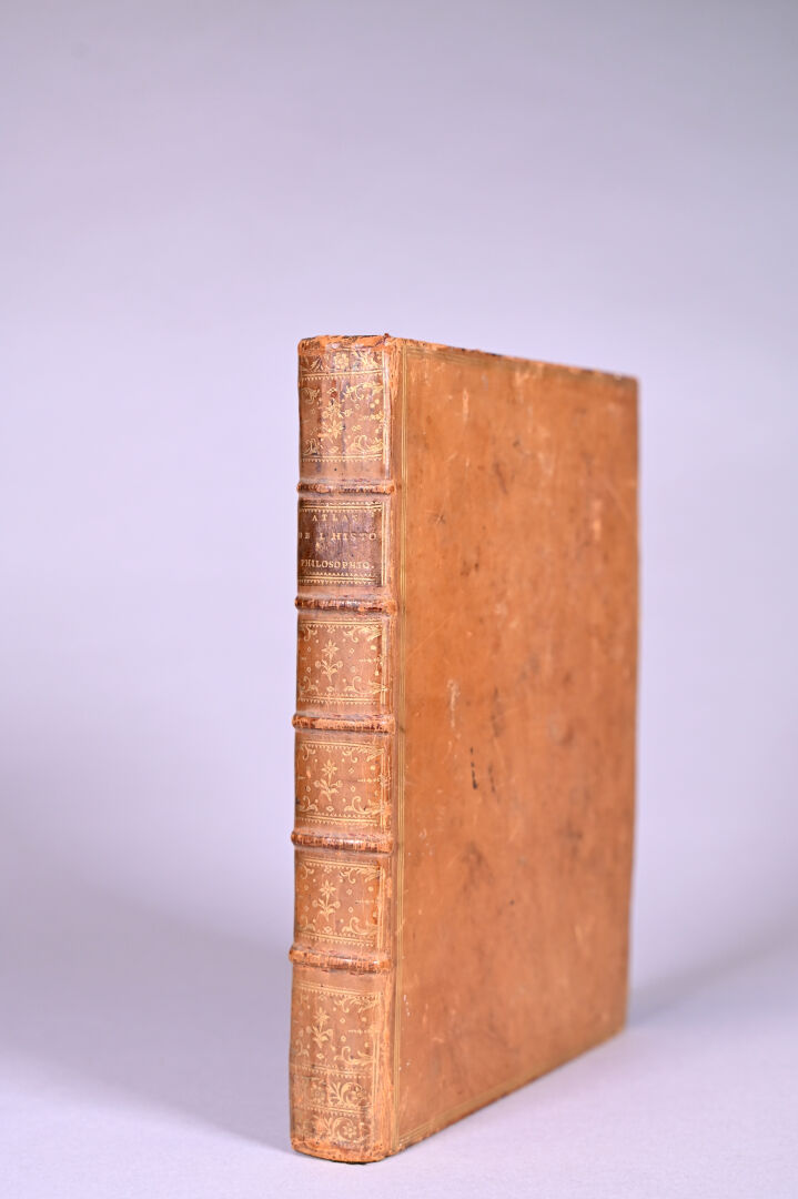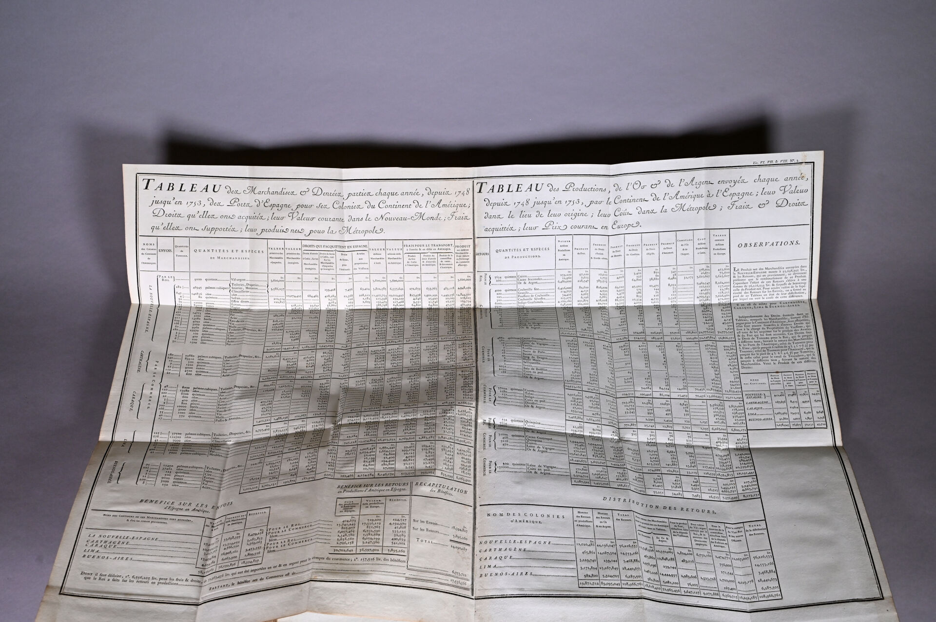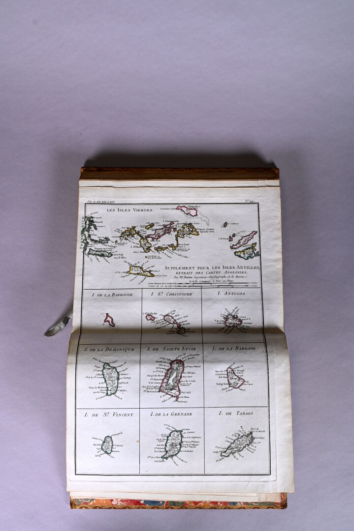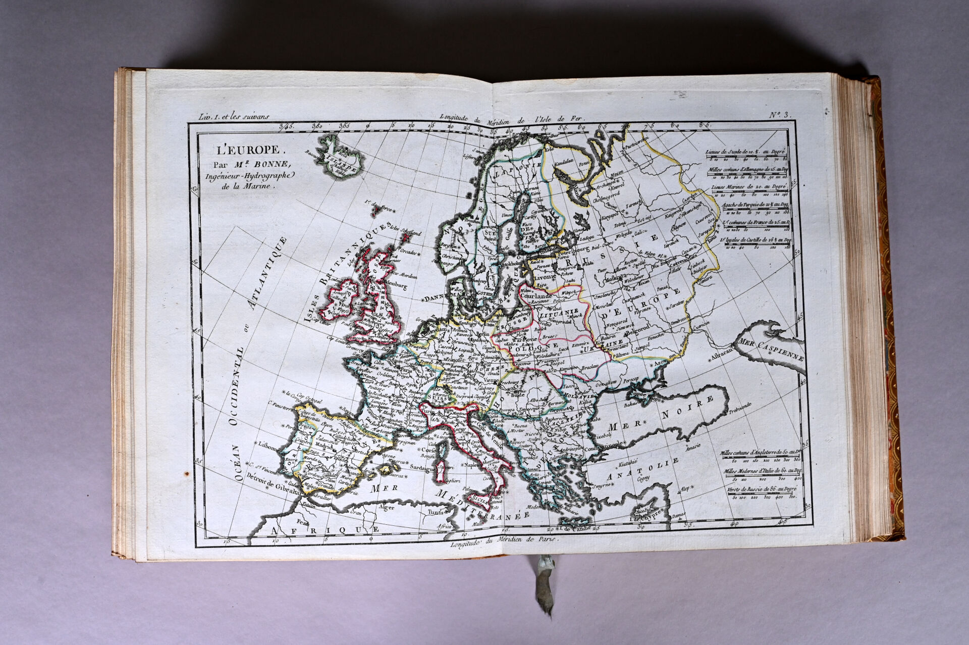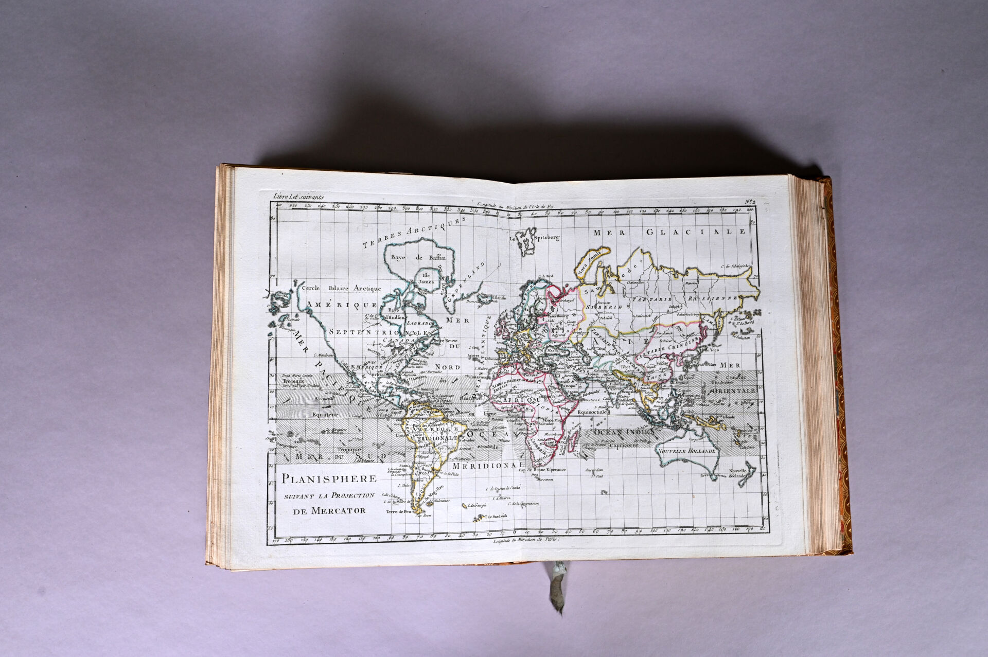 [RAYNAL (Abbé)]. ATLAS DE TOUTES LES PARTIES CONNUES DU GLOBE TERRESTRE dressé pour l’Histoire Philosophique et Politique des Établissemens et du Commerce des Européens dans les Deux Indes. [Genève, J.-L. Pellet, 1780]. In-4 veau blond, triple encadrement de filet doré sur les plats, dos à nerfs orné, pièce de titre, roulette intérieure, tranches dorées (Reliure de l’époque) ; (2) ff. de titre et table des cartes, 28 pages d’ « Analyse succincte de cet Atlas », 50 cartes + 2 tableaux dépliants montés sur onglets. Petit accroc avec infime manque à la coiffe supérieure, 2 coins émoussés. ATLAS COMPLET des 50 CARTES gravées et soigneusement aquarellées à l’époque, numérotées de 1 à 49 (une carte « 17 bis ») la plupart à double page et toutes montées sur onglets, ainsi que les 2 grands TABLEAUX dépliants in fine. Cet atlas vient en complément des volumes du texte de l’Abbé Raynal. BEL EXEMPLAIRE, frais : les cartes sont gravées sur un beau vergé légèrement bleuté. ¶ Sabin, 68081. Dimensions du livre fermé : 26 x 21 x 3,5 cm. Dimensions d’une carte : 25 x 47,5 cm.