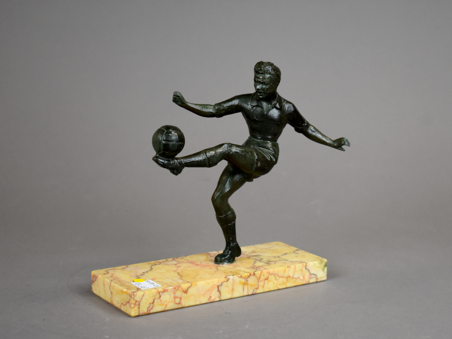 Régule patiné figurant un footballeur en plein tir (restauration). Socle de pierre dure jaune. Haut. : 18 cm.