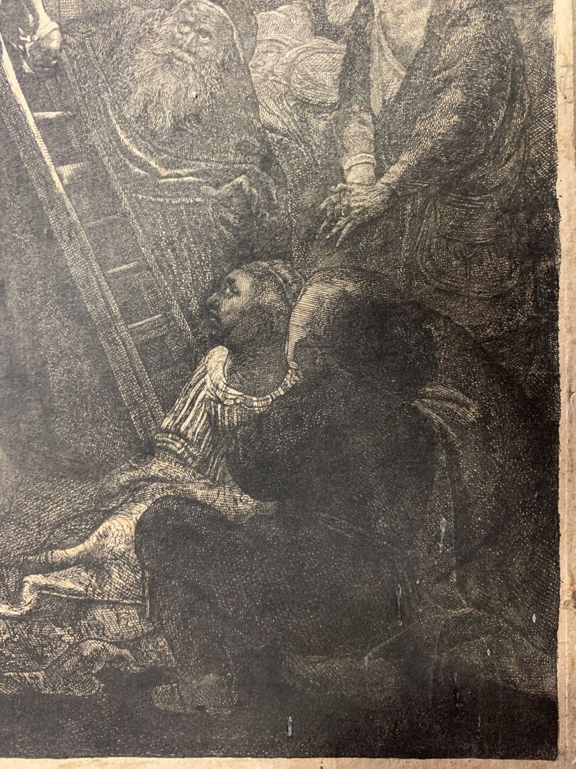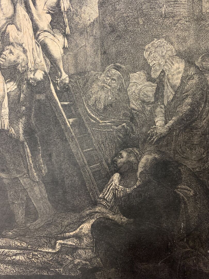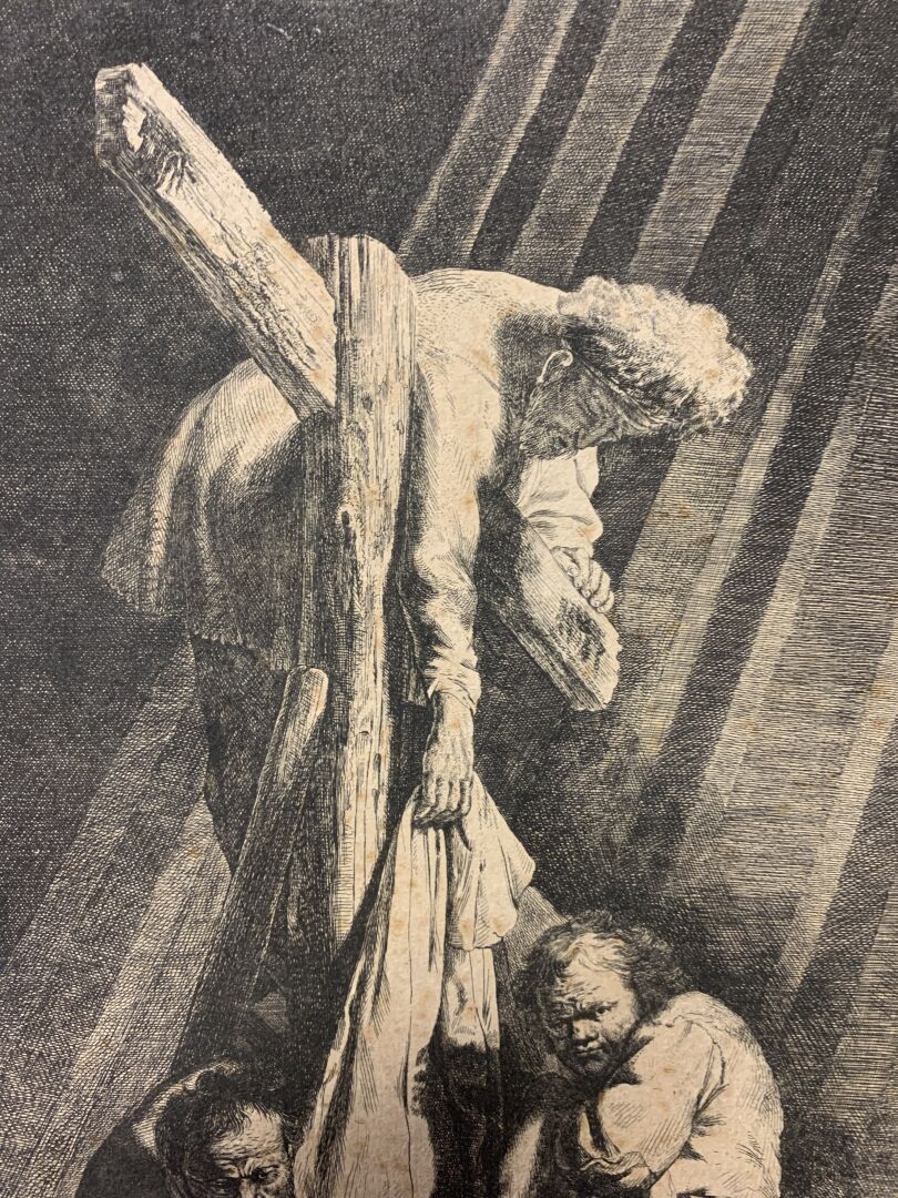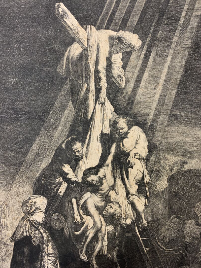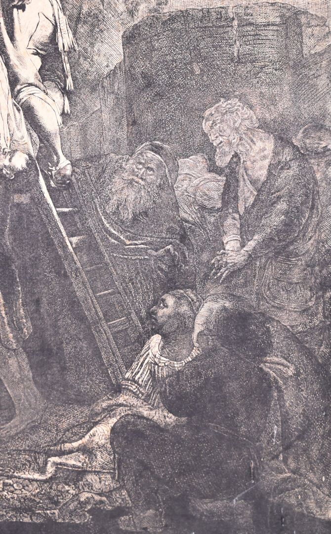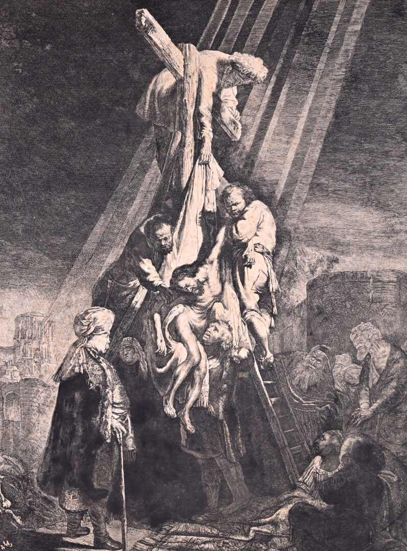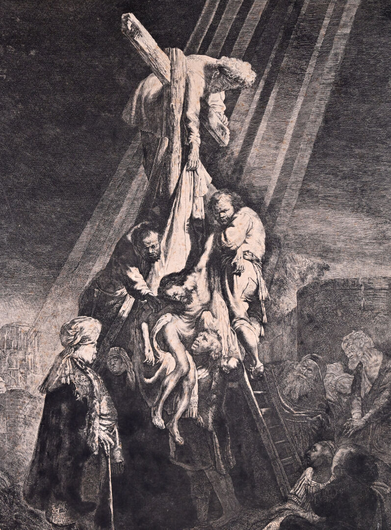 REMBRANDT VAN RIJN (1606 – 1669). Grande Descente de croix (2nde planche). Eau-forte, burin. Très belle épreuve en tirage un peu tardif coupée sur le cuivre, les bords collés, petites déchirures, petits manques, rousseurs, tâches. (K.G.Boon 81, New Hollstein 119 VI/VIII) 53 x 41cm.