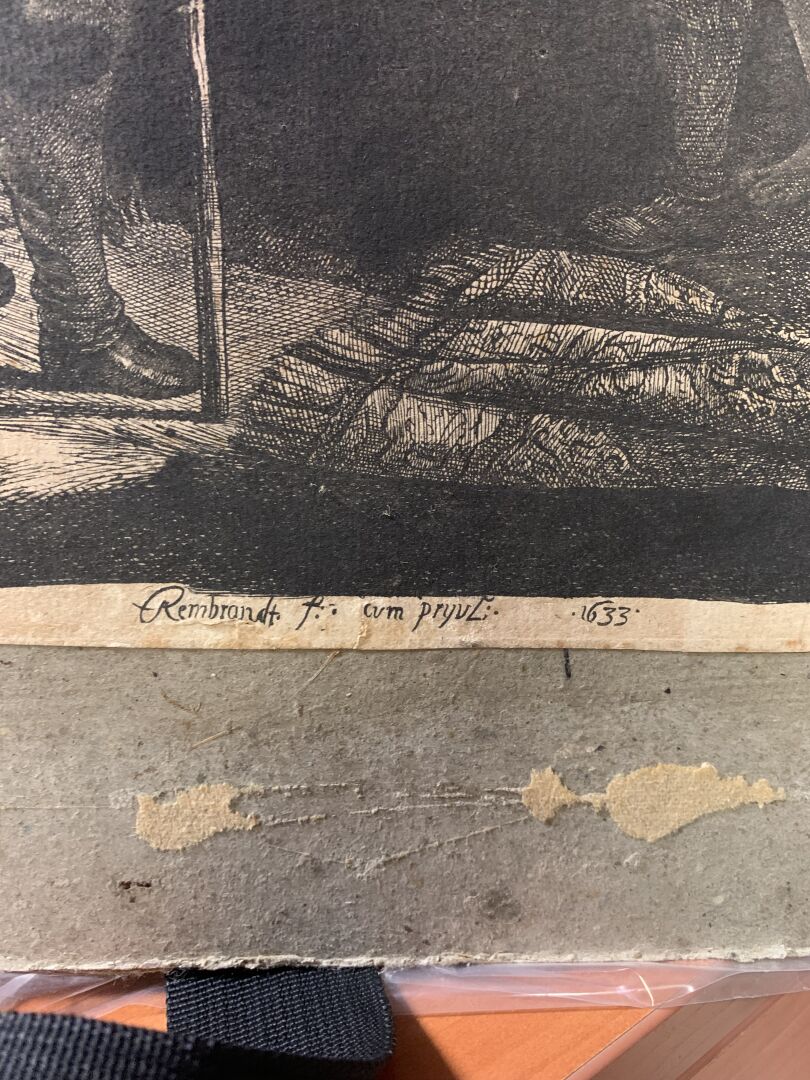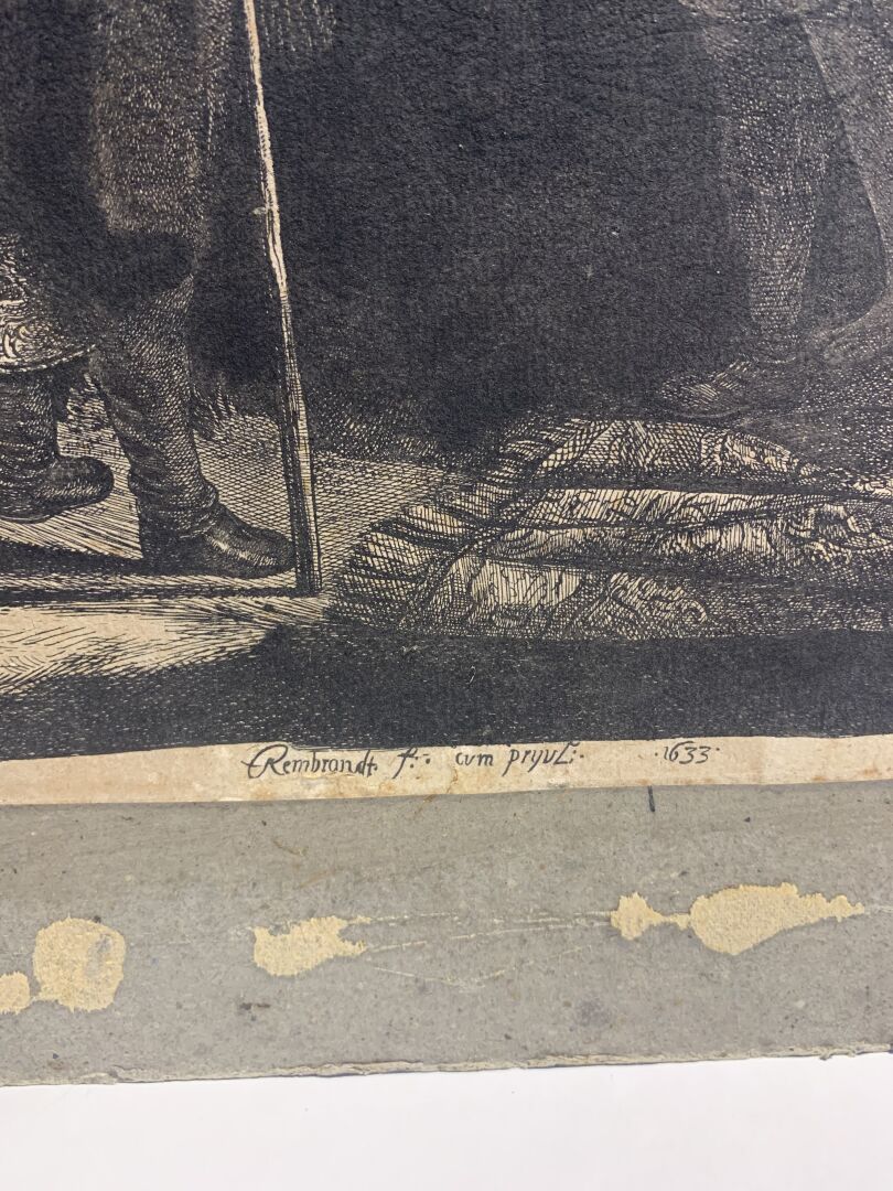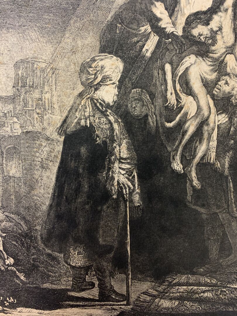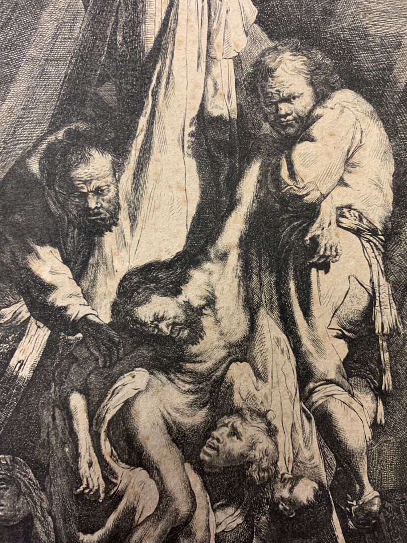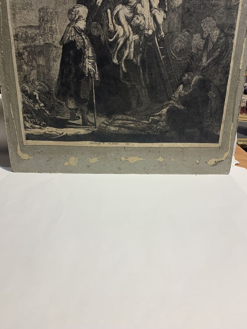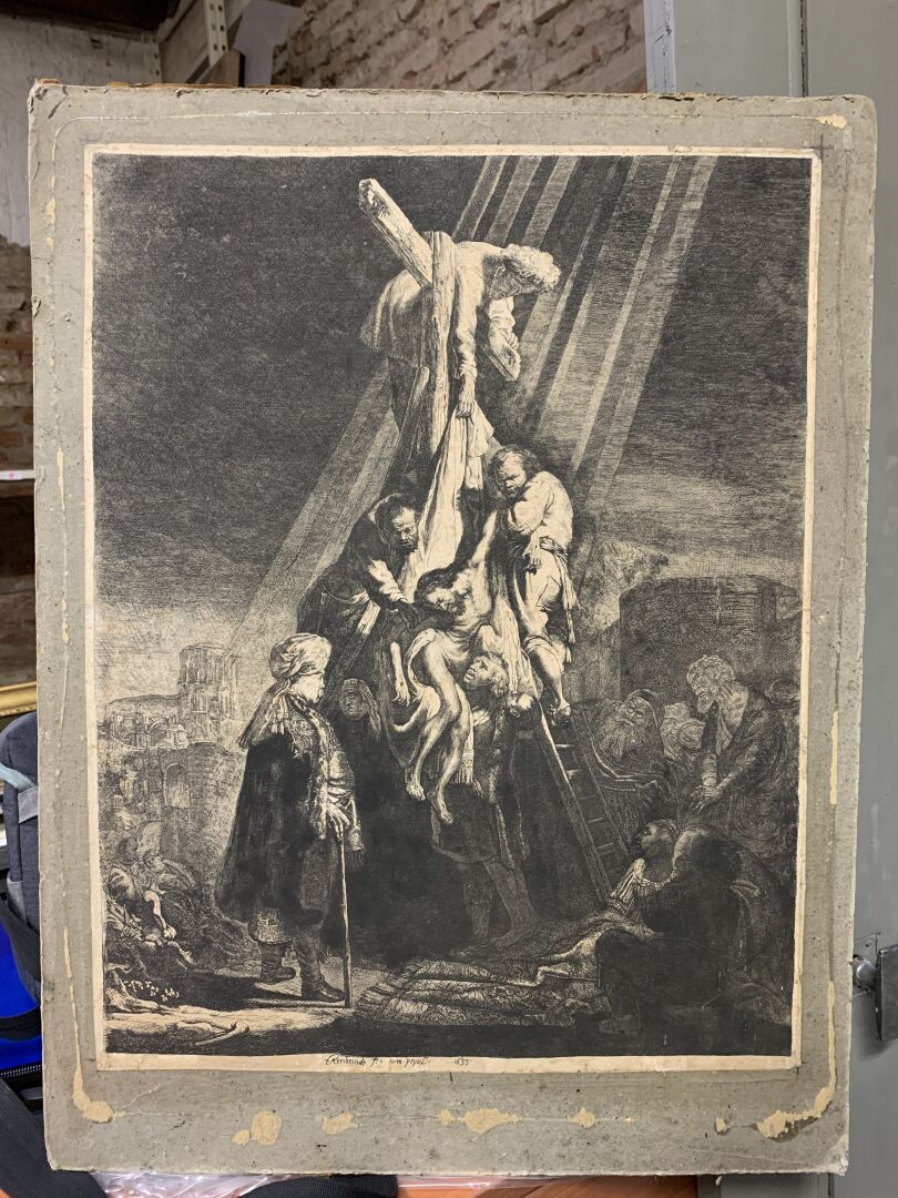 REMBRANDT VAN RIJN (1606 – 1669). Grande Descente de croix (2nde planche). Eau-forte, burin. Très belle épreuve en tirage un peu tardif coupée sur le cuivre, les bords collés, petites déchirures, petits manques, rousseurs, tâches. (K.G.Boon 81, New Hollstein 119 VI/VIII) 53 x 41cm.