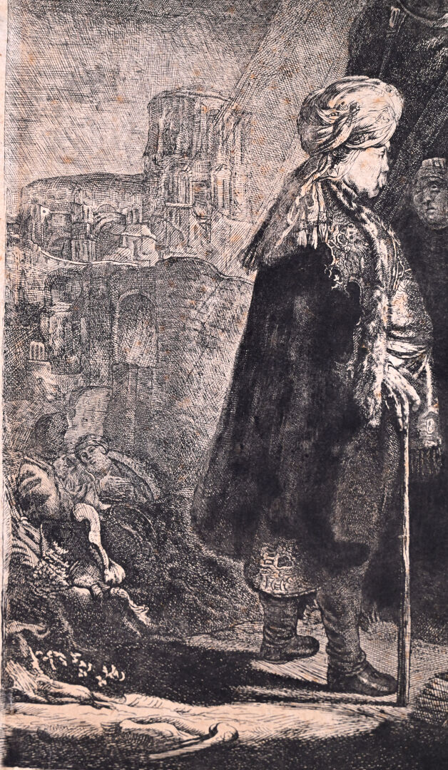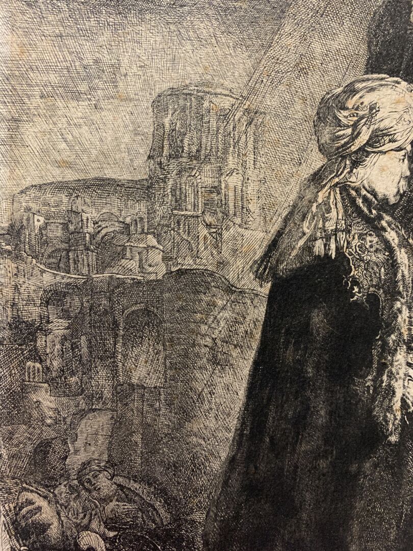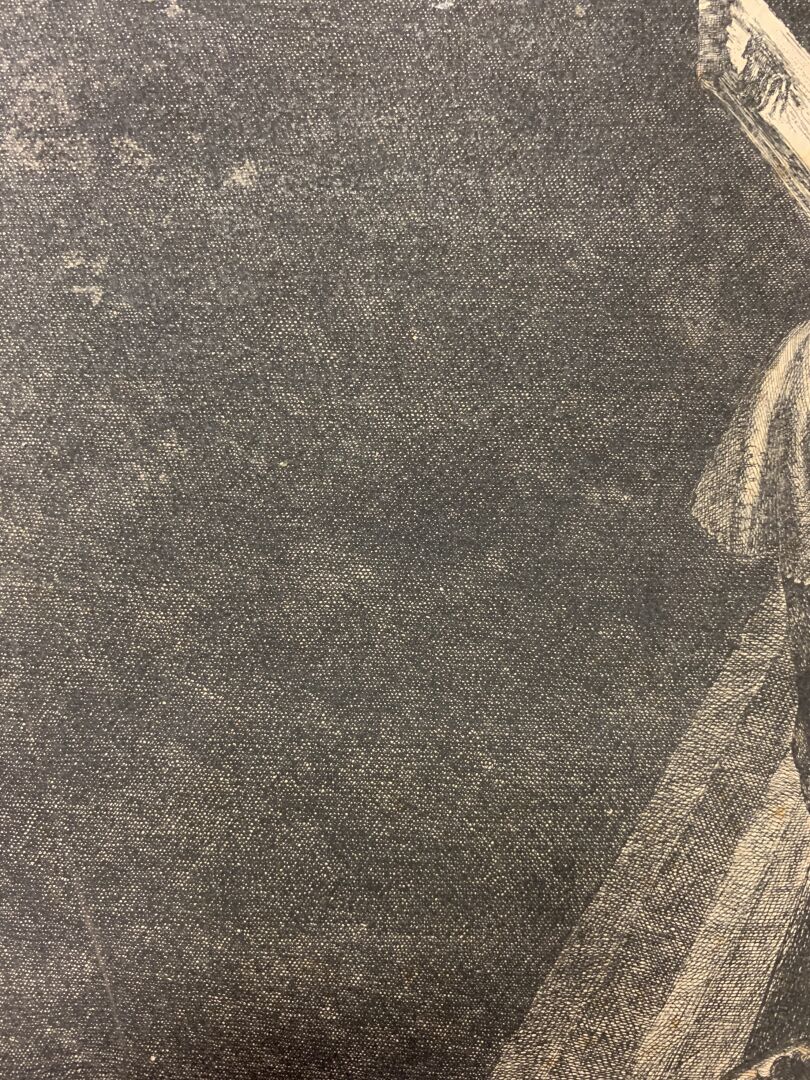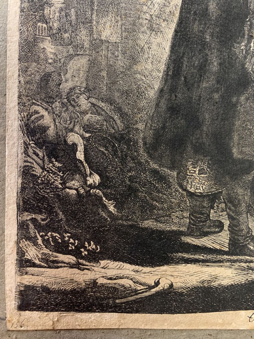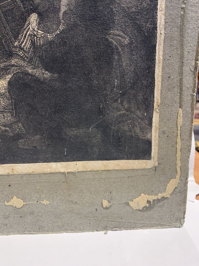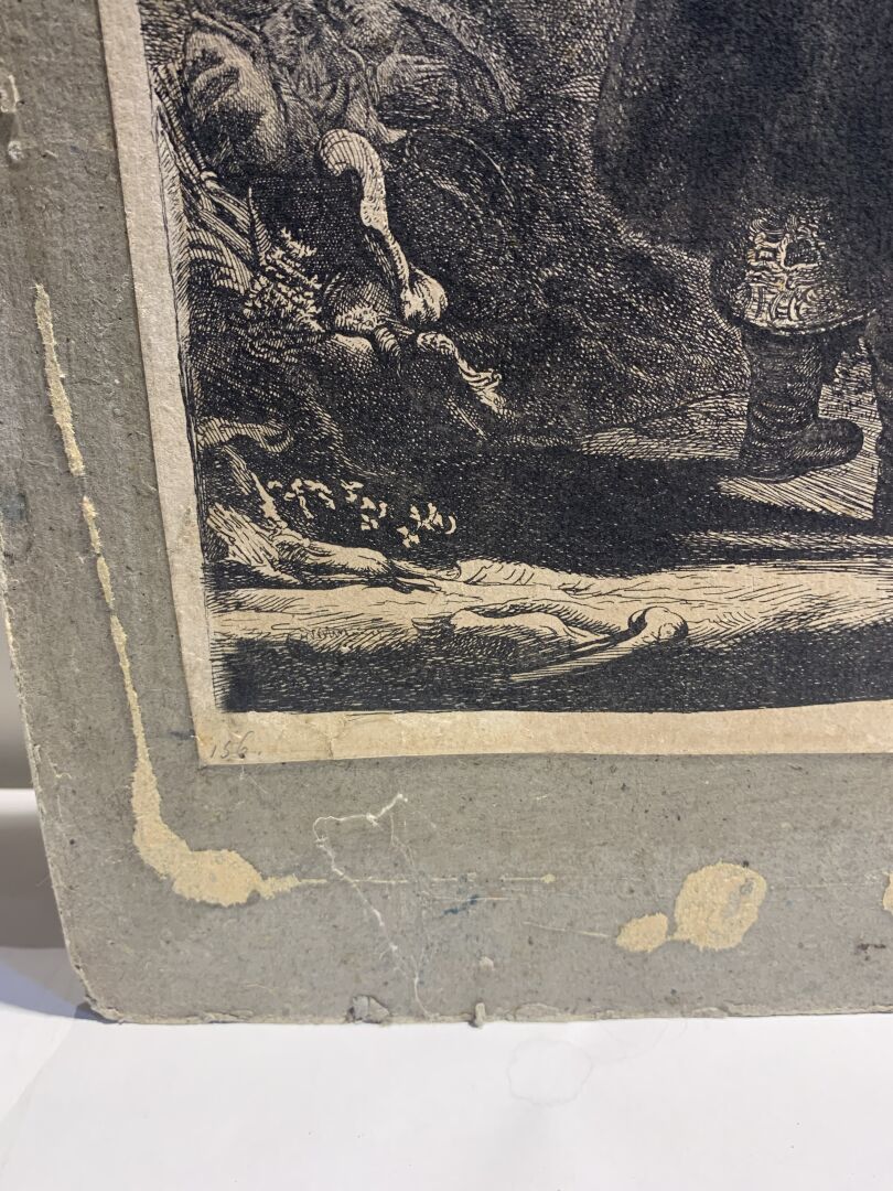Eau-forte, burin. Très belle épreuve en tirage un peu tardif coupée sur le cuivre, les bords collés, petites déchirures, petits manques, rousseurs, tâches.