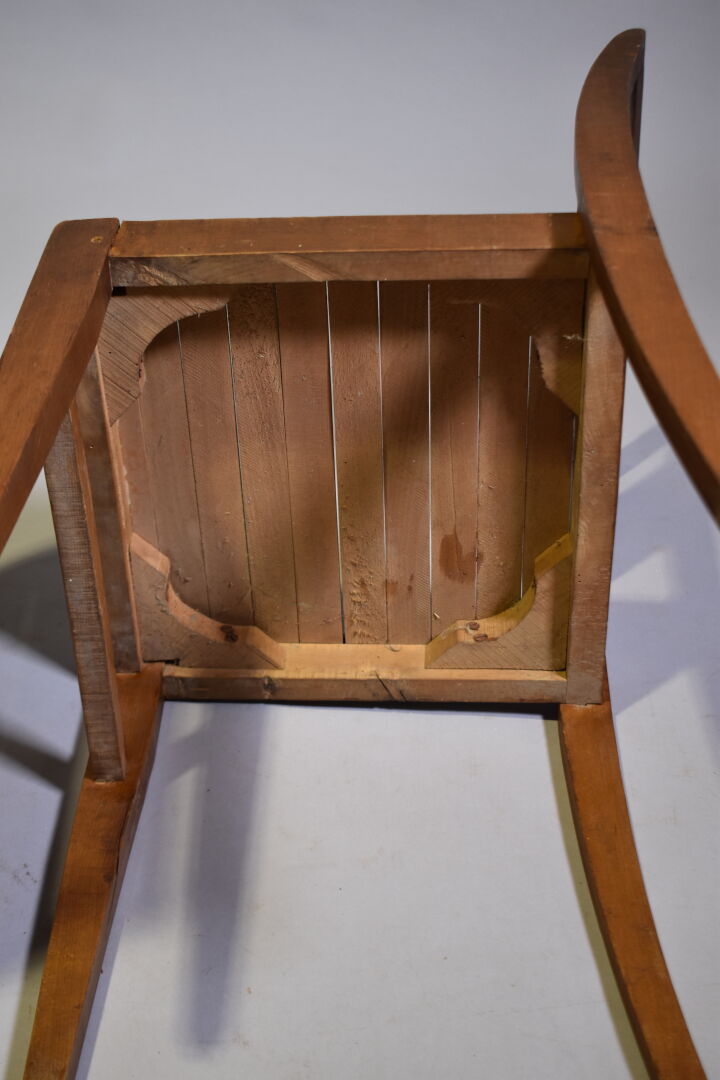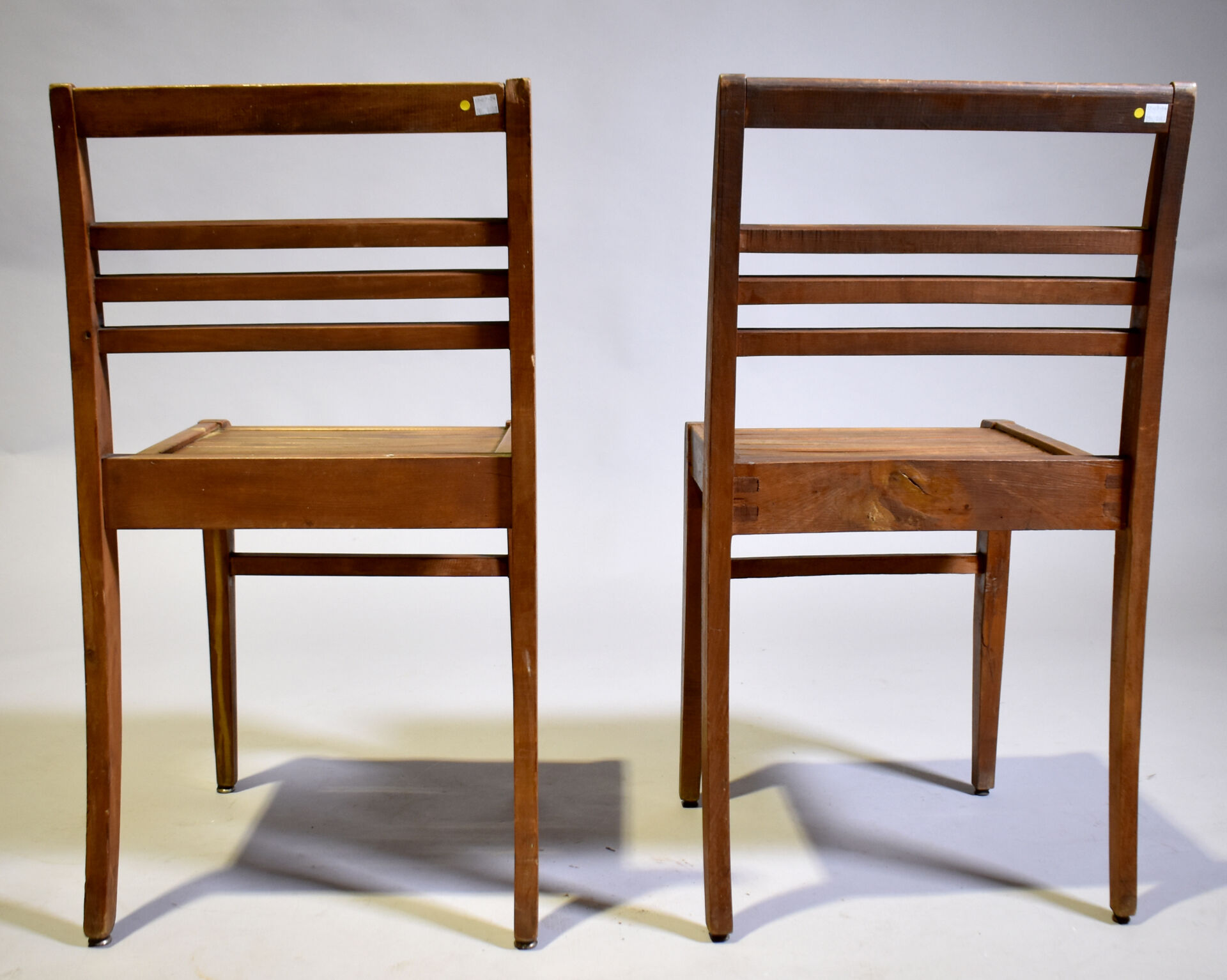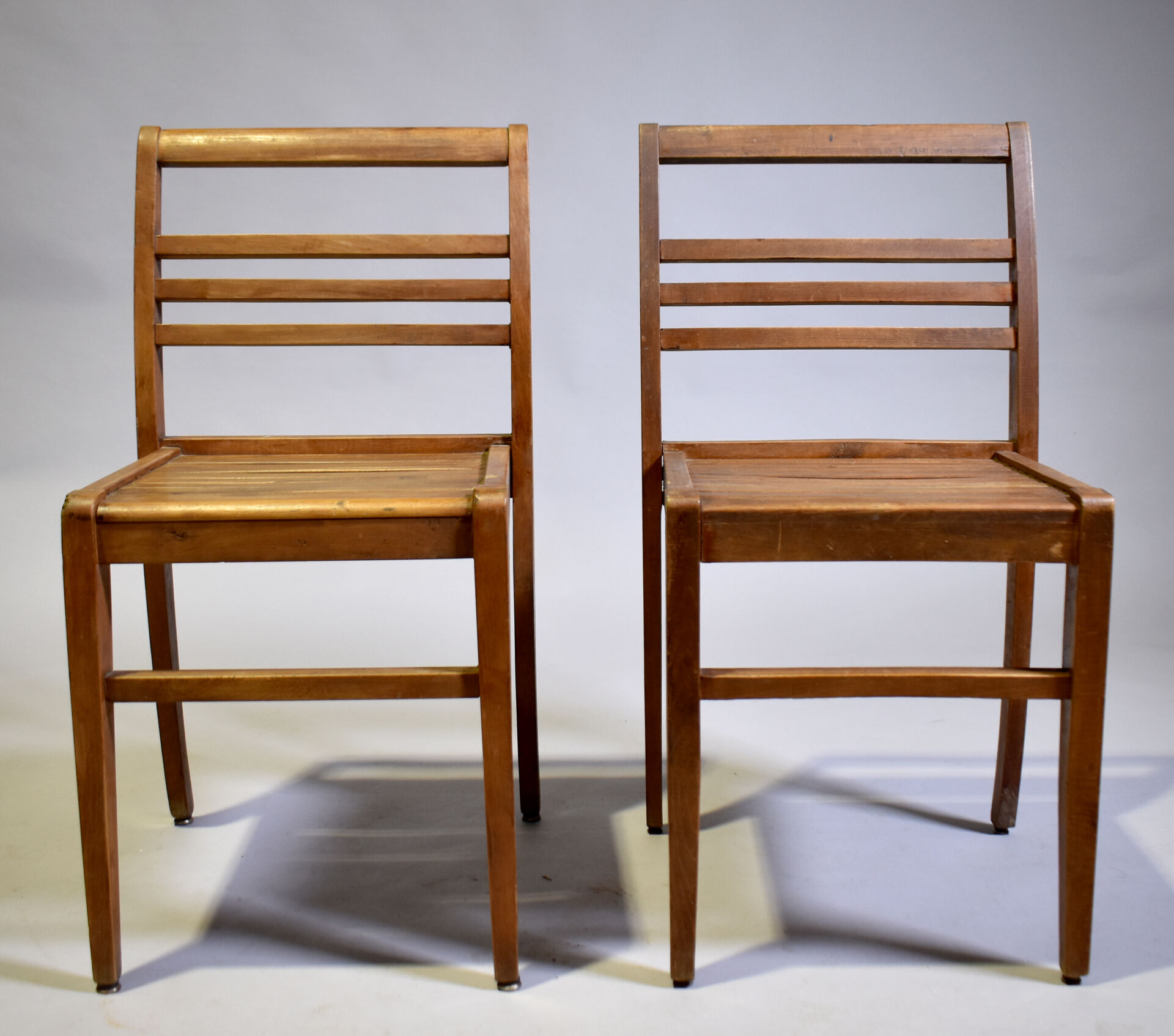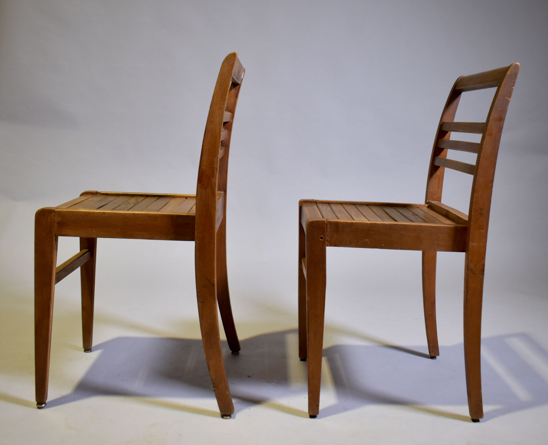 René GABRIEL (1890-1950) : Deux chaises modèle « 103 » à dossier incurvé à trois barres, assise en lattes dite caillebotis. Haut. : 81 cm.