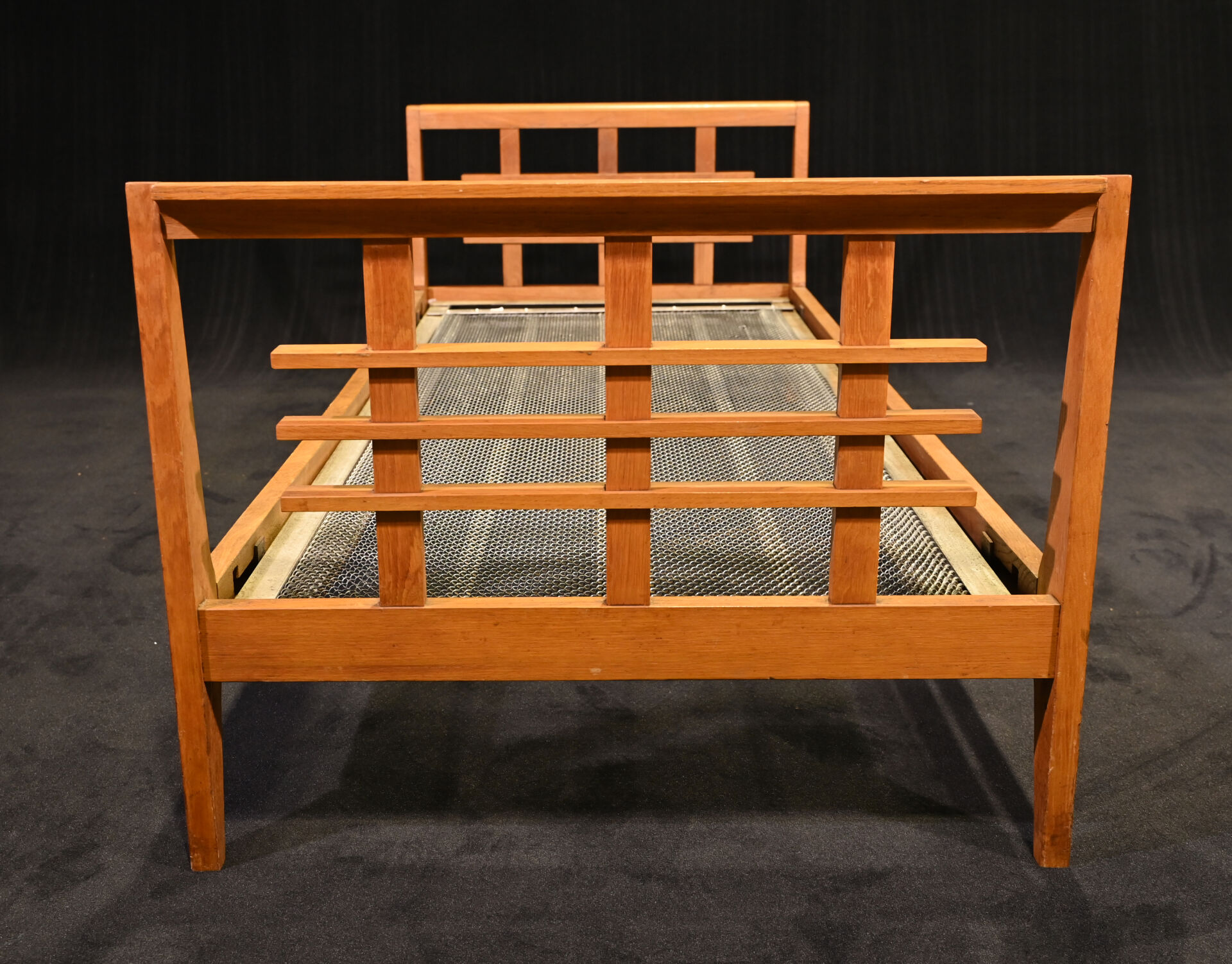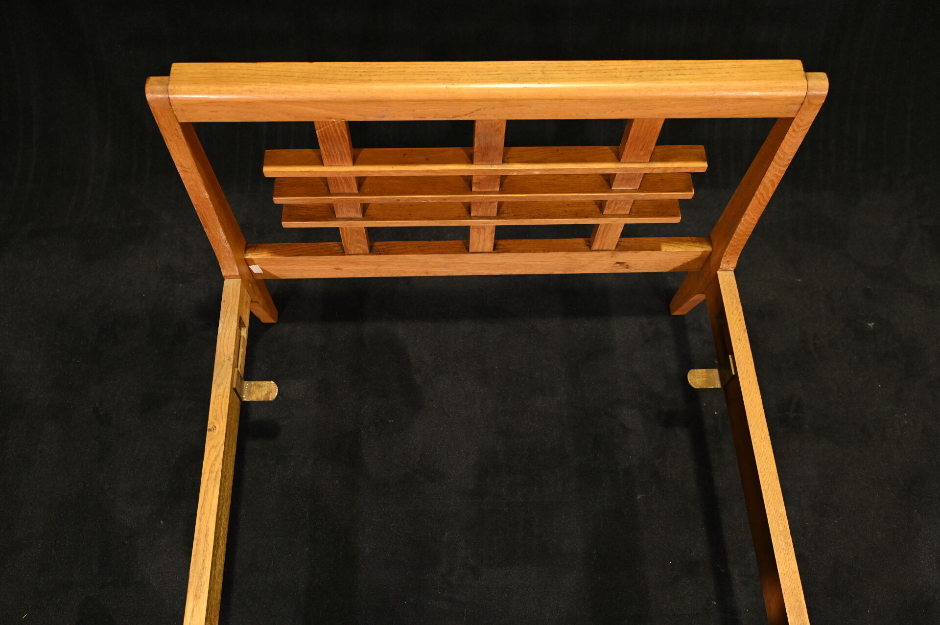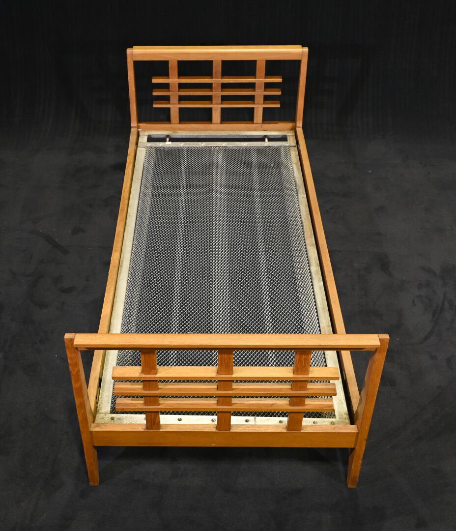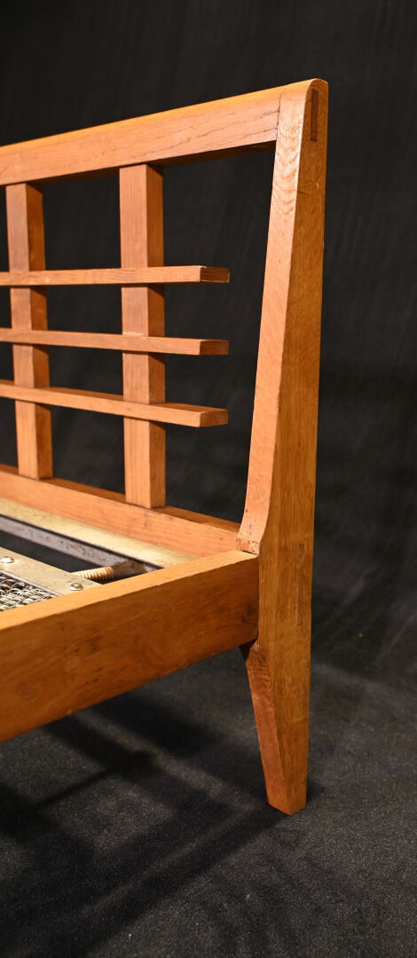 René GABRIEL (1890-1950). Lit une place en chêne , les montants légèrement en avion. Avec son sommier. Haut. du lit : 66 cm. Long. du lit : 199 cm. Prof. du lit : 86 cm. Long. du sommier : 187 cm. Larg. du sommier : 78,5 cm.
