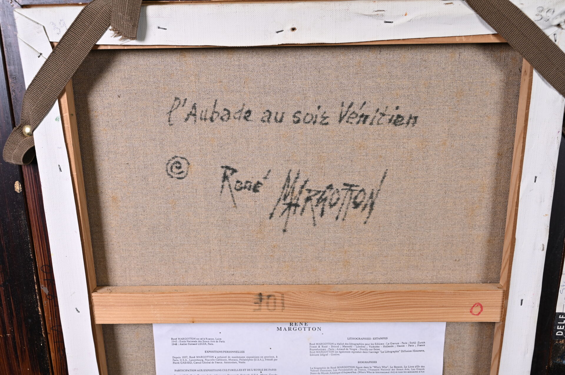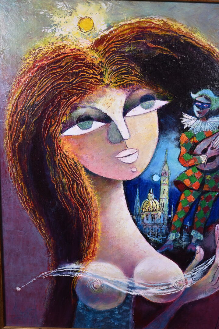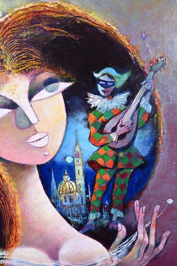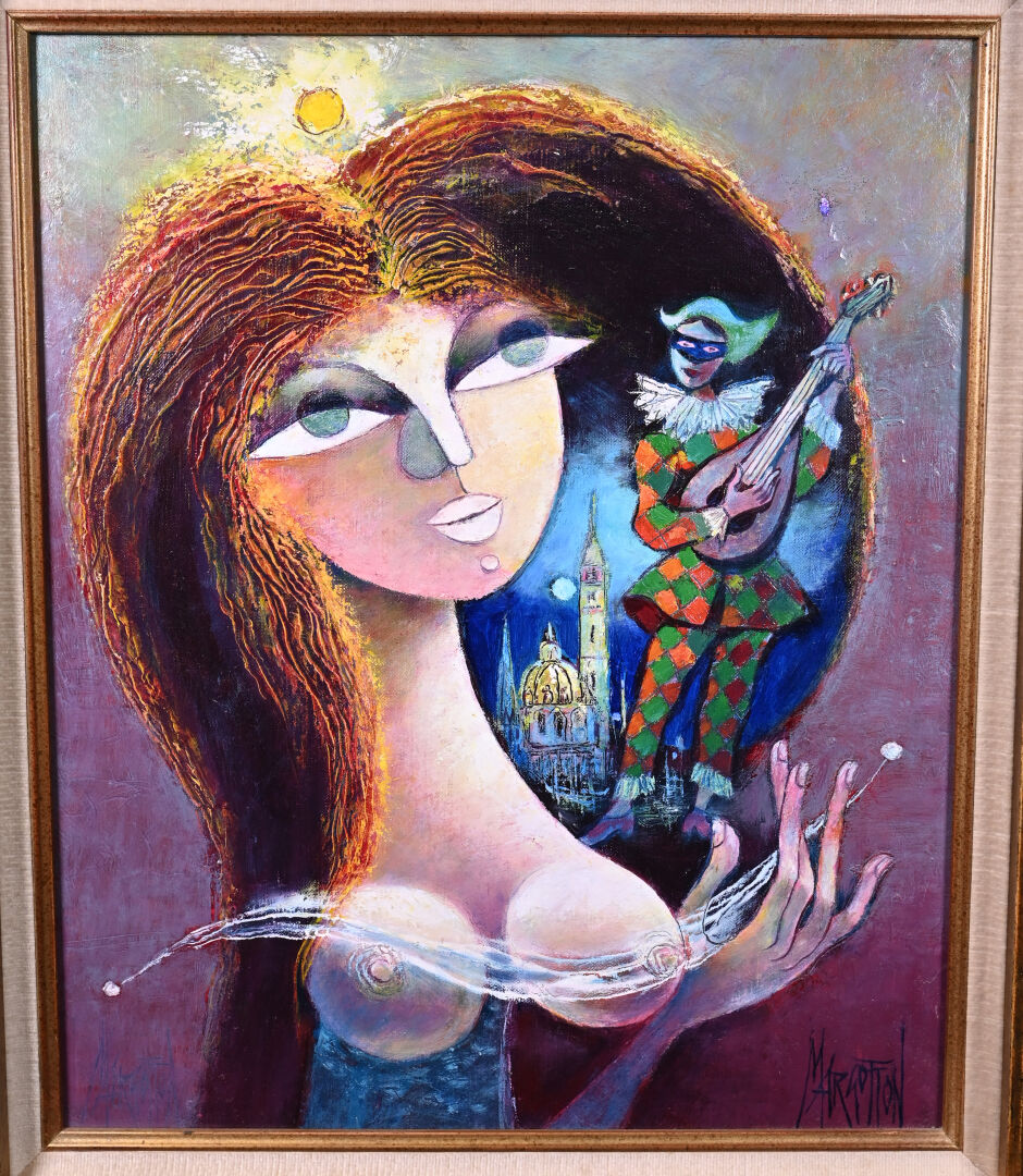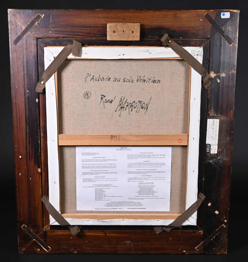 René MARGOTTON (1915-2009). « L’aubade au soir Vénitien ». Huile sur toile signée en bas à droite et en bas à gauche (un petit éclat restauré). Titré et contre signé au dos. 55 x 46 cm.