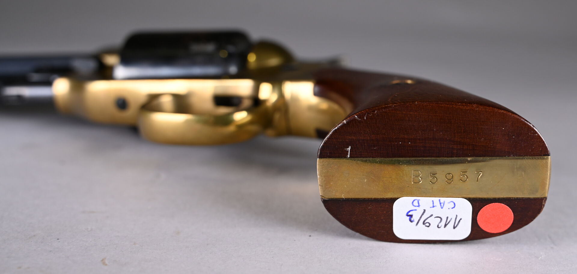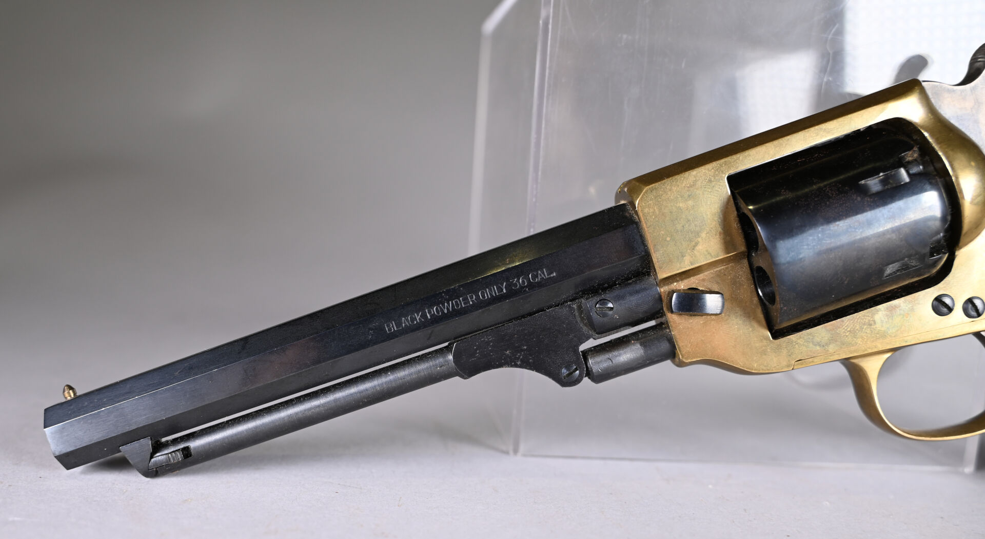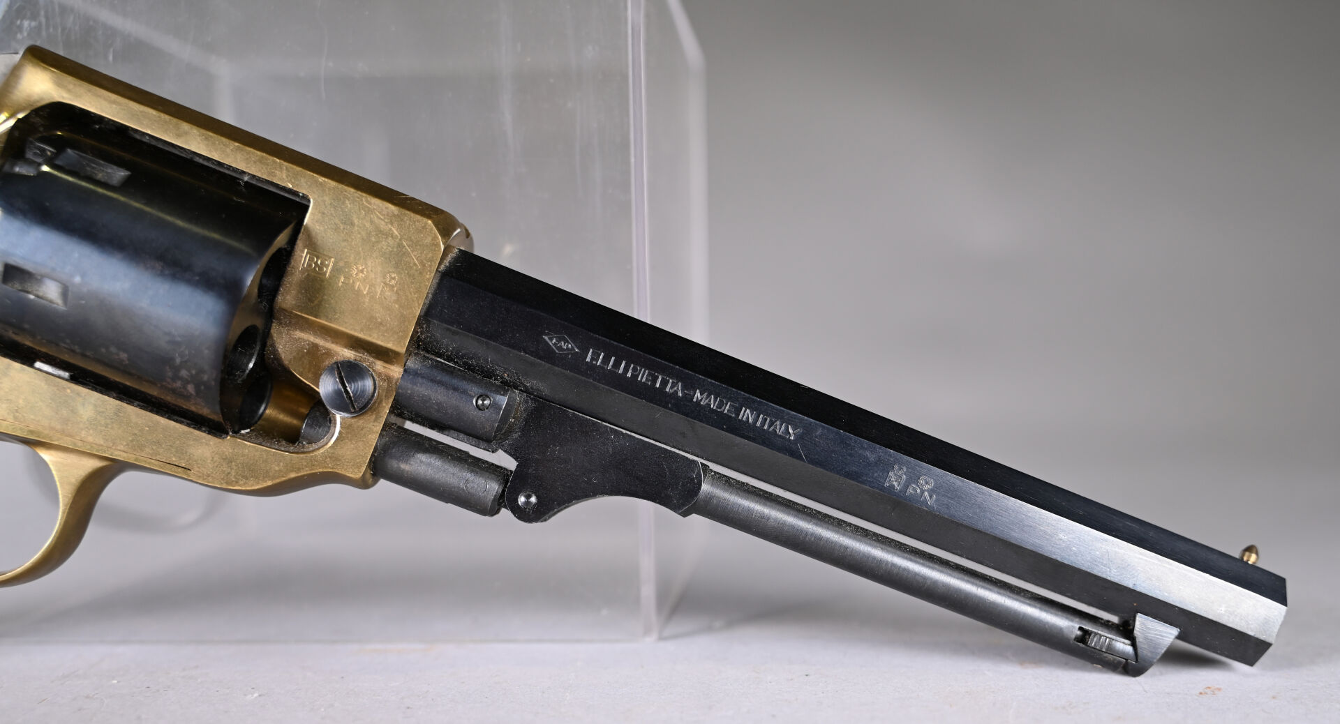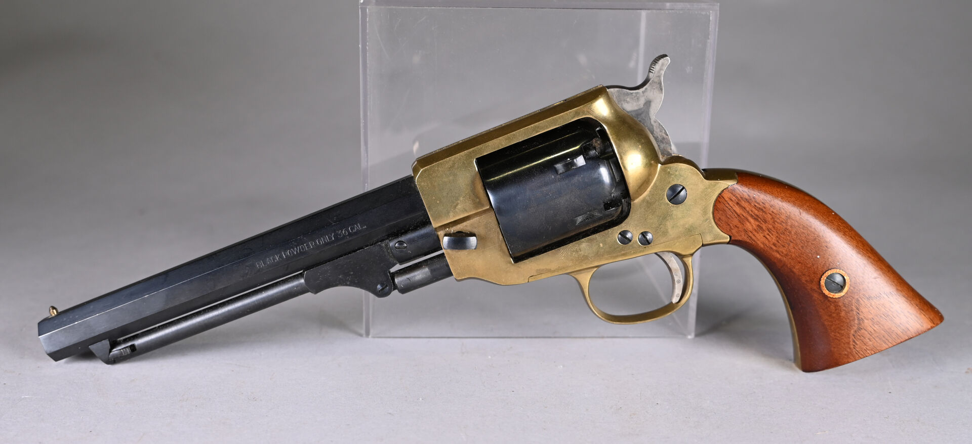 Réplique de révolver à percussion Spiller & Bur carcasse laiton, calibre 36, canon octogonal de 145 mm. Mécanisme simple action fonctionnel. État 1-. Cat D.