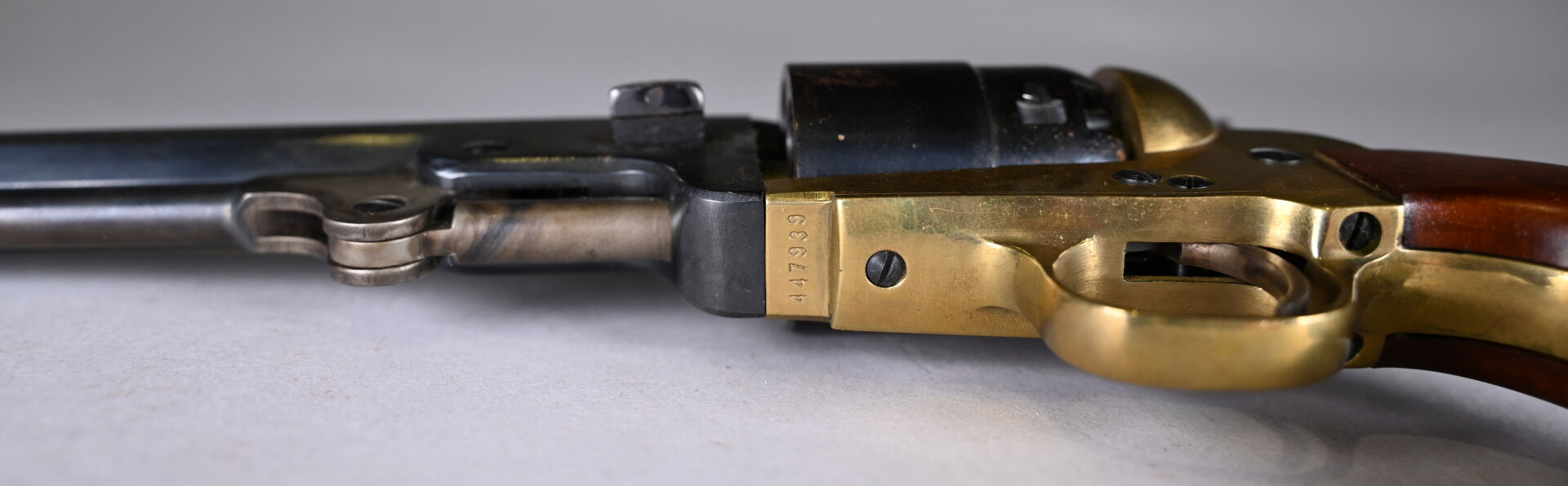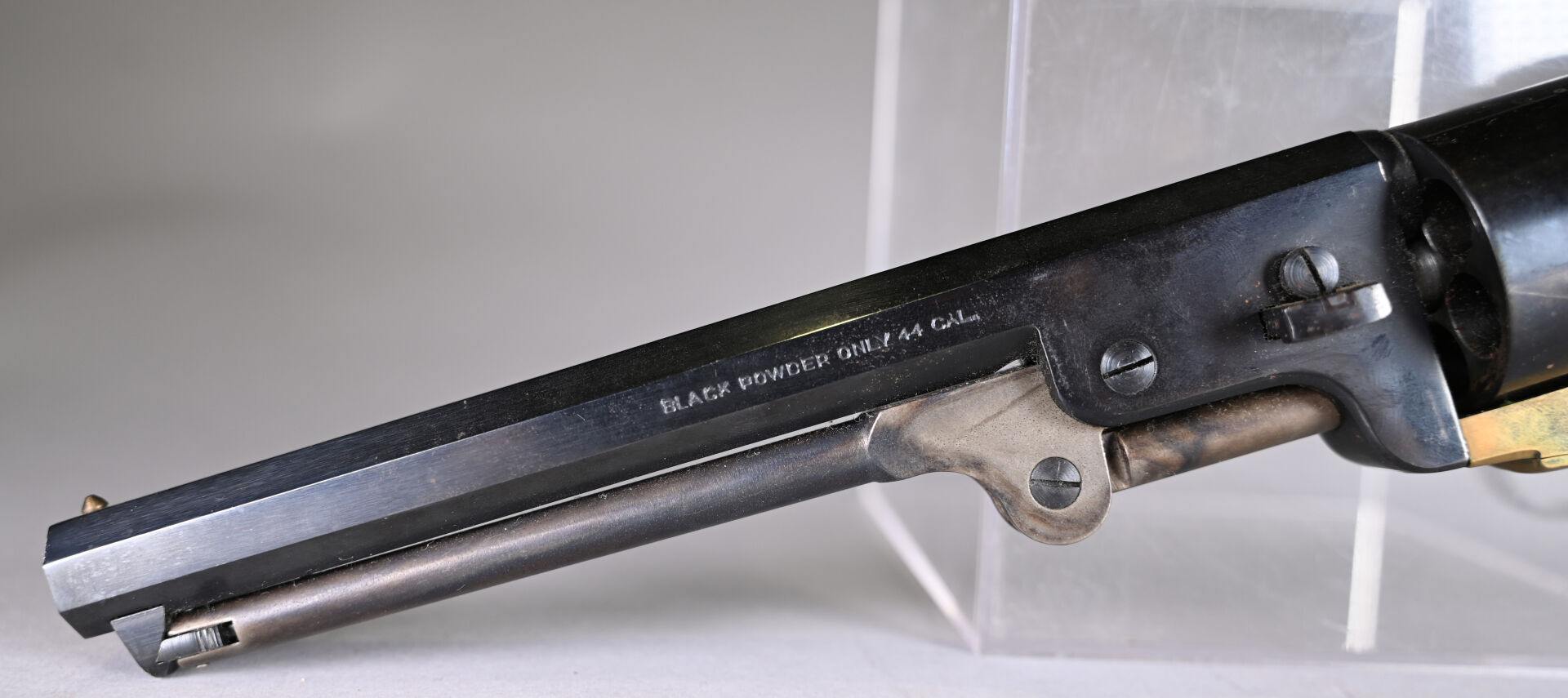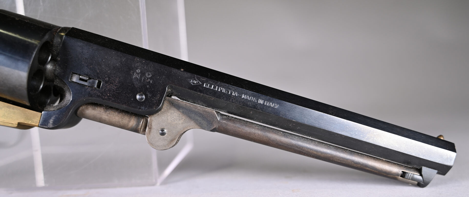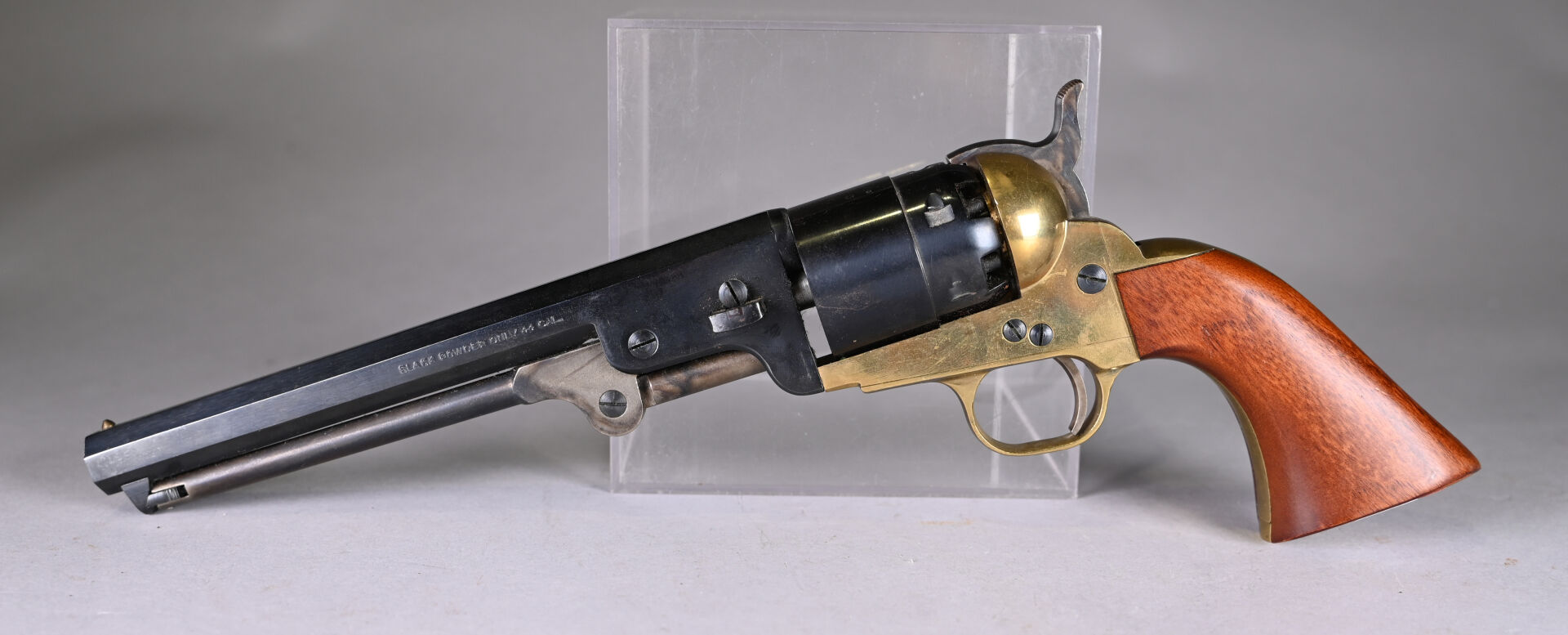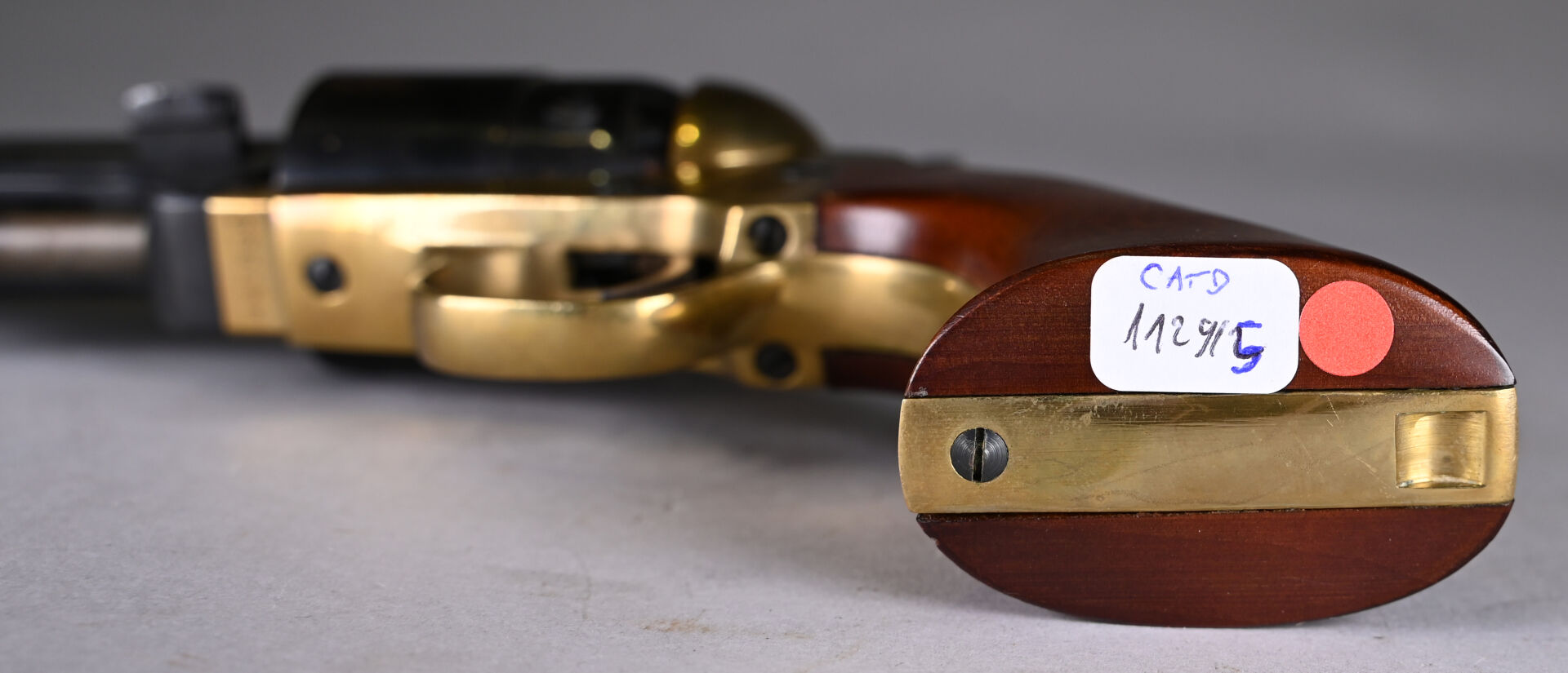 Réplique italienne d’un Colt 1851 calibre 44. Canon octogonal de 190 mm. Mécanisme fonctionnel. Très bon canon pour le tir. État 1-, état proche du neuf. Cat D.