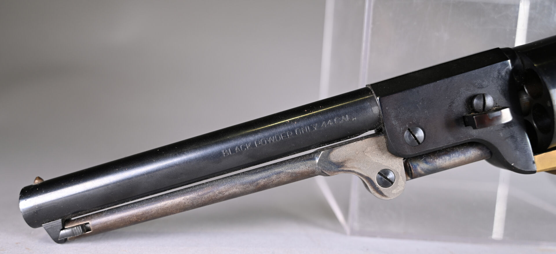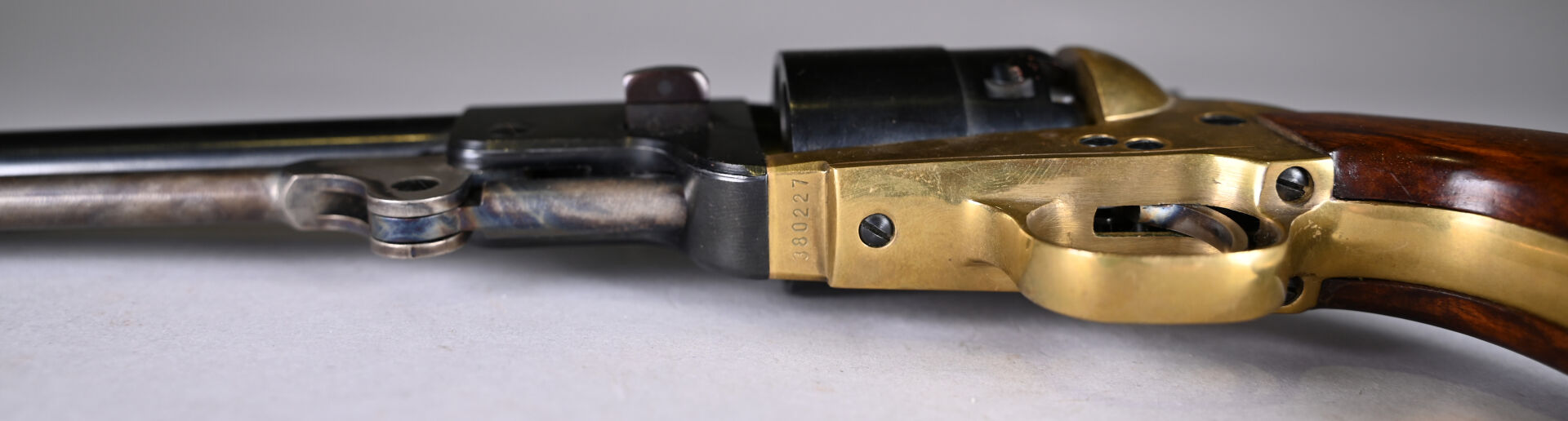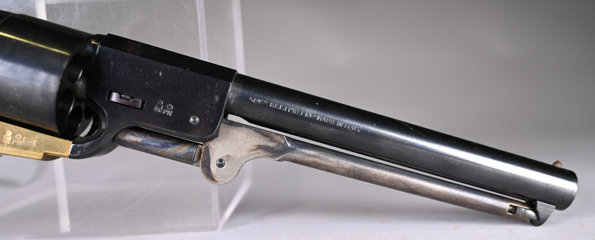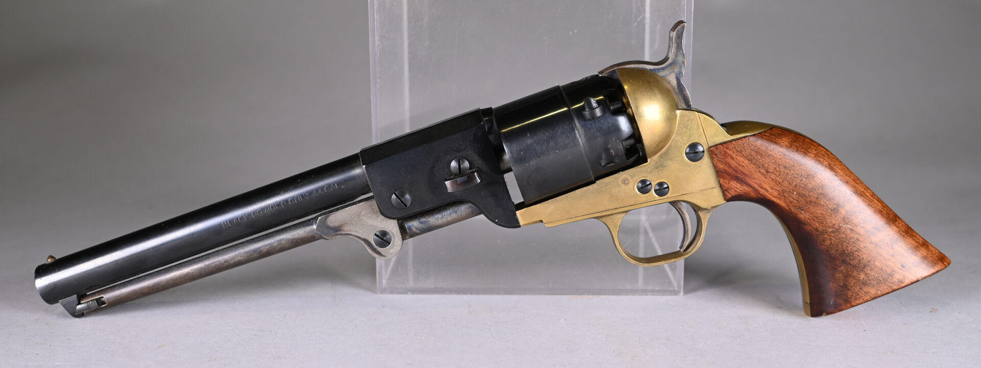 Réplique italienne d’un Colt 1851 calibre 44. Canon rond de 190 mm. Mécanisme fonctionnel. Très bon canon pour le tir. État 1-, état proche du neuf. Cat D.