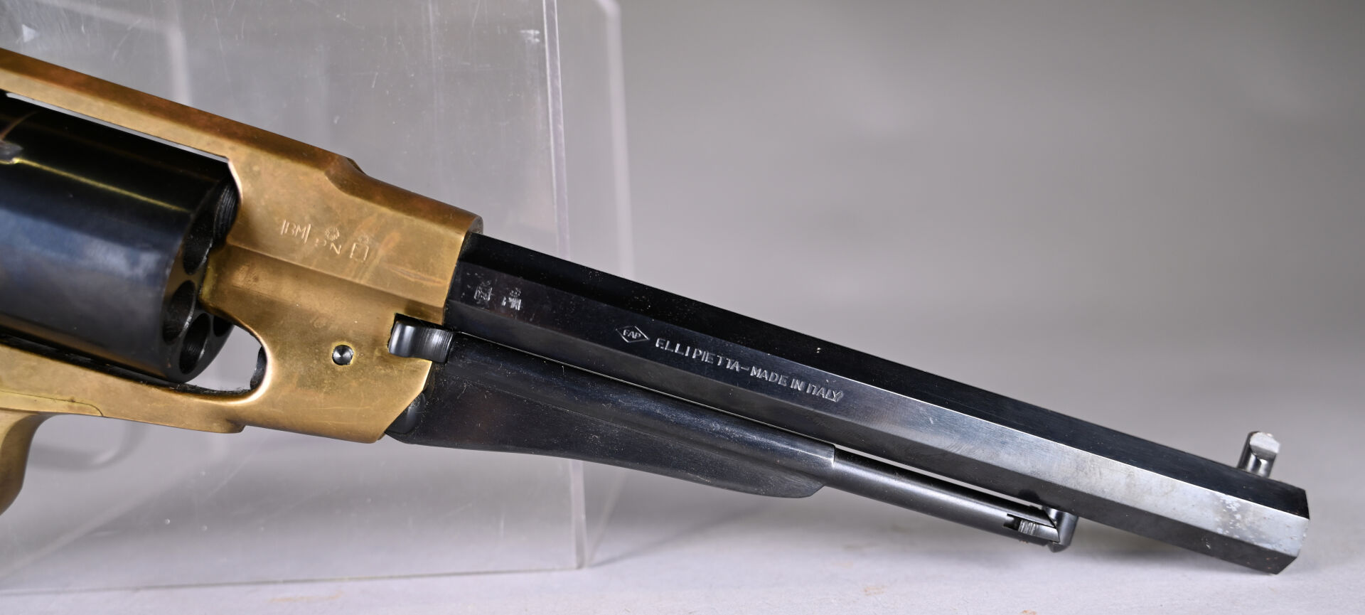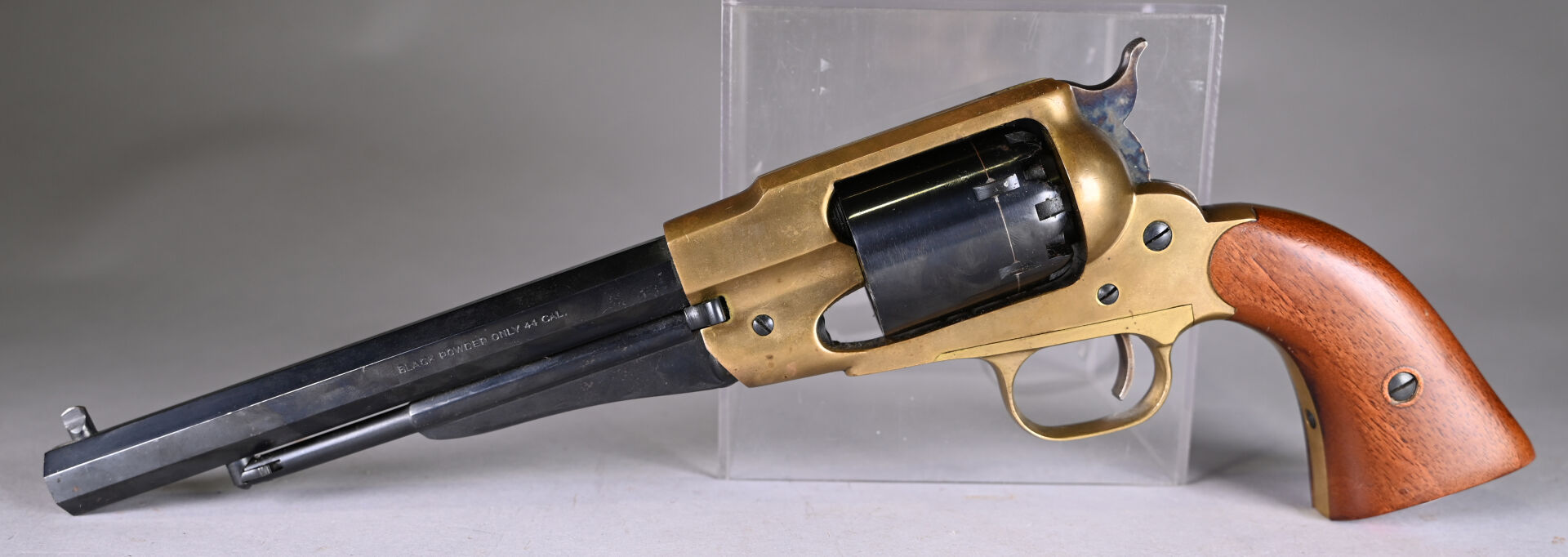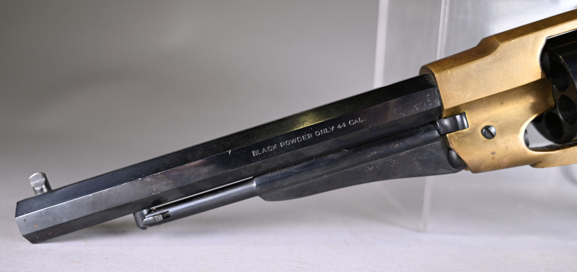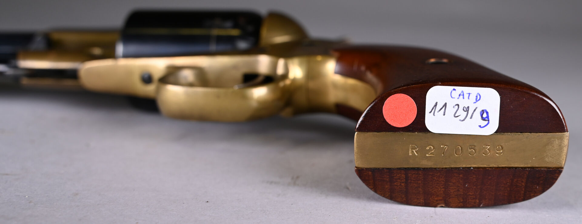 Réplique italienne d’un révolver Remington 1858, carcasse fermée, cadre en laiton calibre 44, canon octogonal de 205 mm. Rotation du barillet capricieuse. Très bon canon pour le tir. État 1-. Cat D.