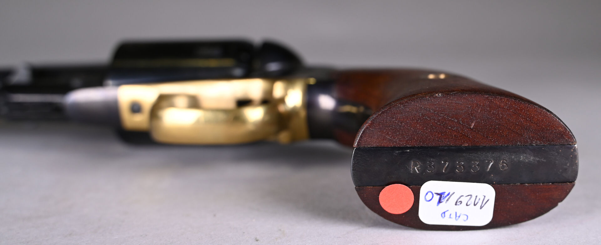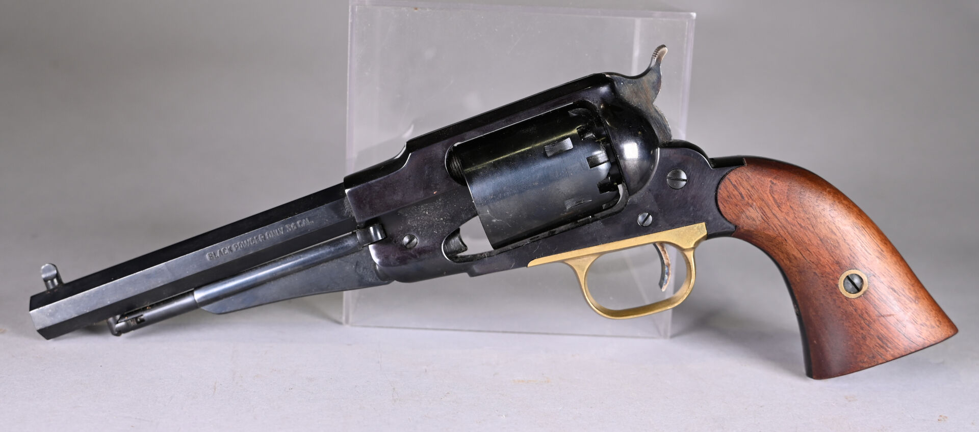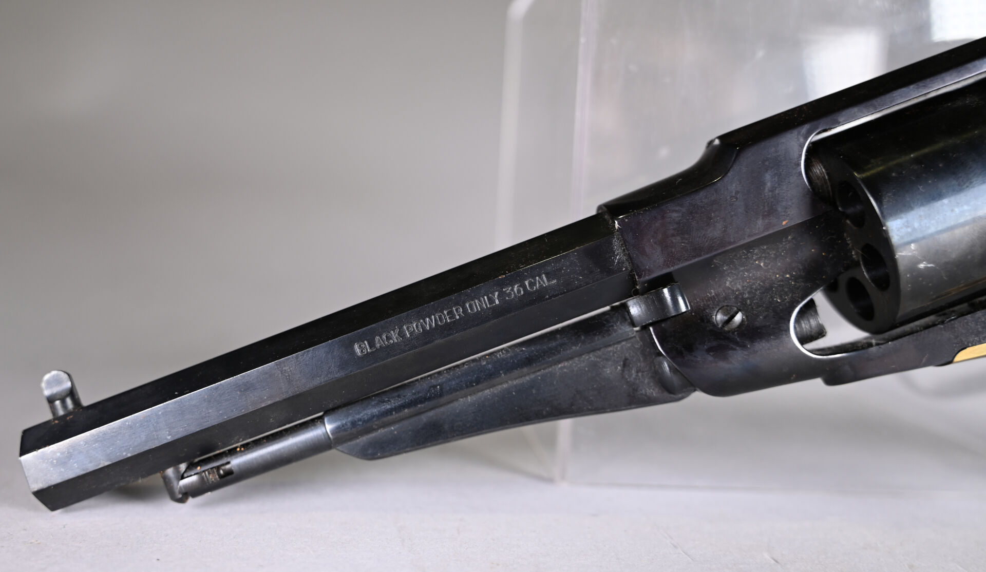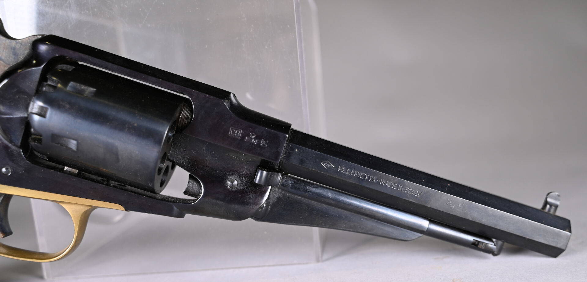 Réplique italienne d’un révolver Remington 1858, type « shérif » carcasse fermée, arme bronzée noir calibre 36, canon octogonal court de 165 mm. Mécanisme fonctionnel. Très bon canon pour le tir. État 1-. Cat D.