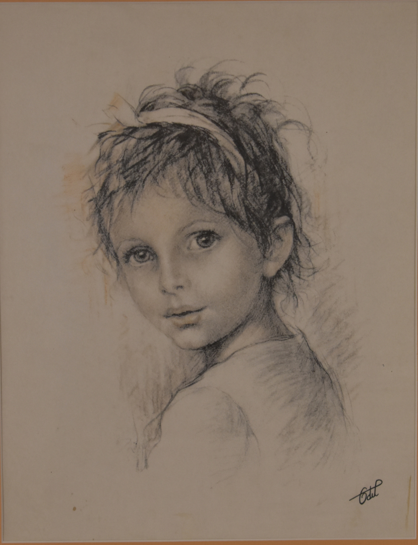 Reproduction encadrée signée ODIL et représentant une jeune fille.