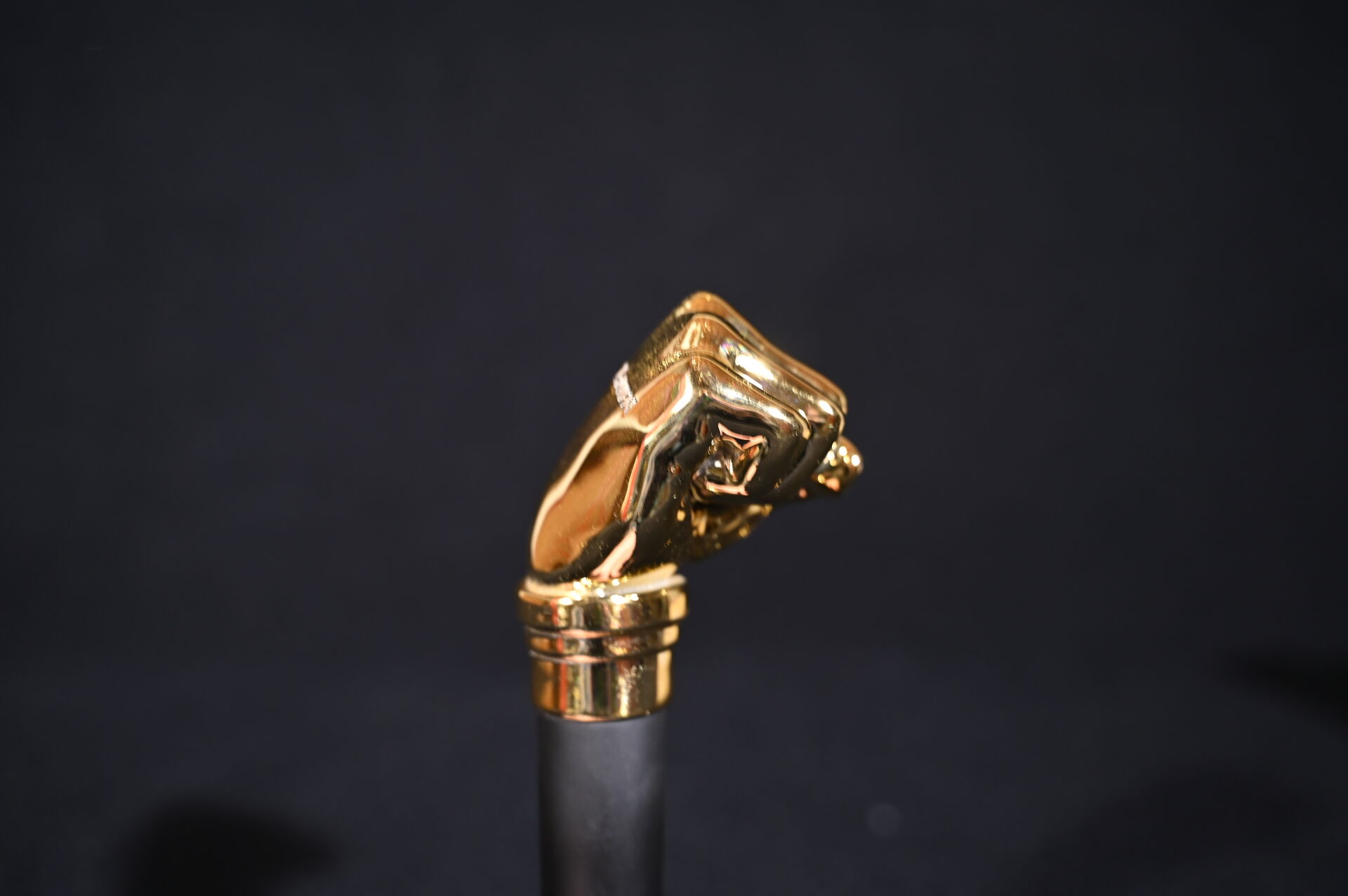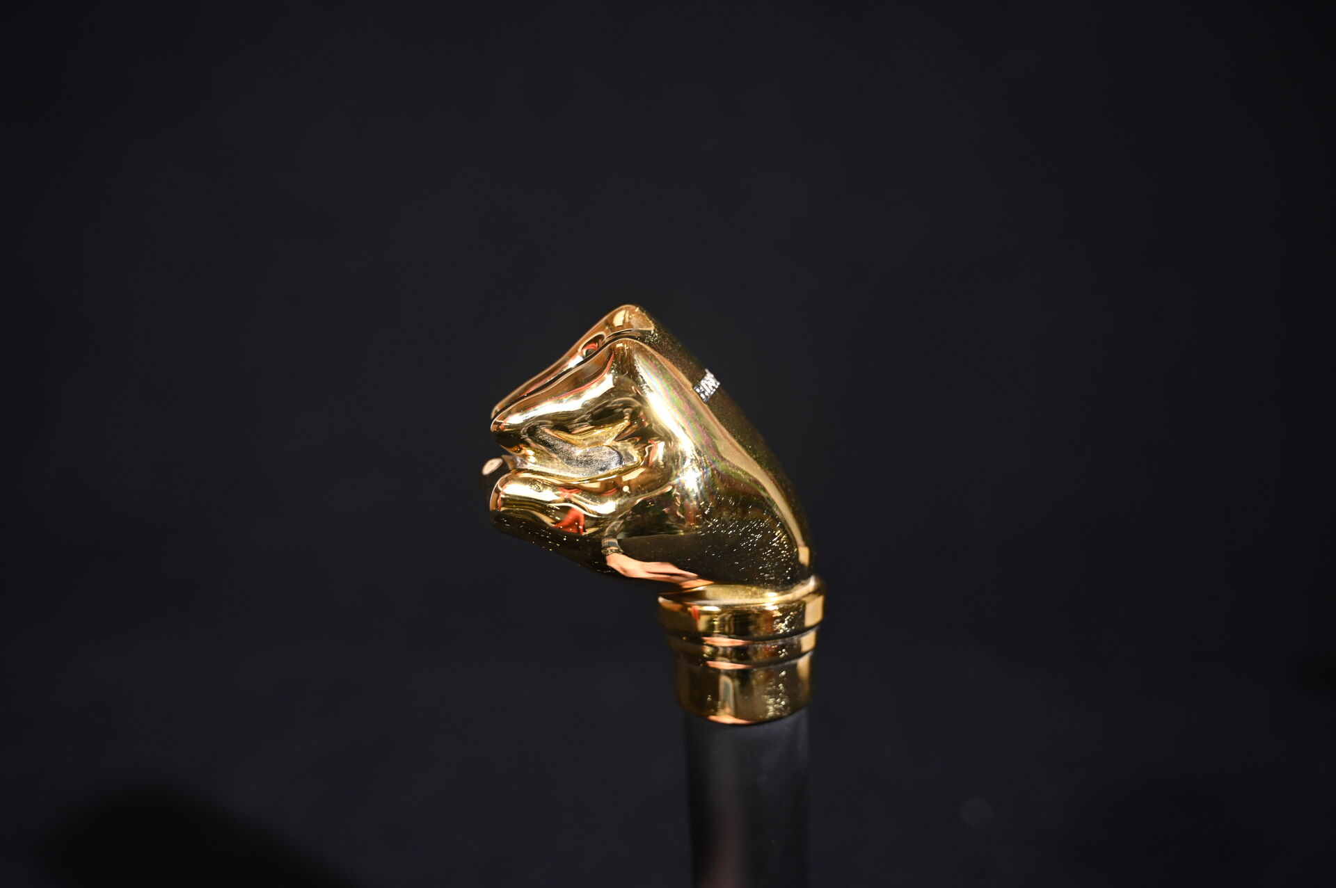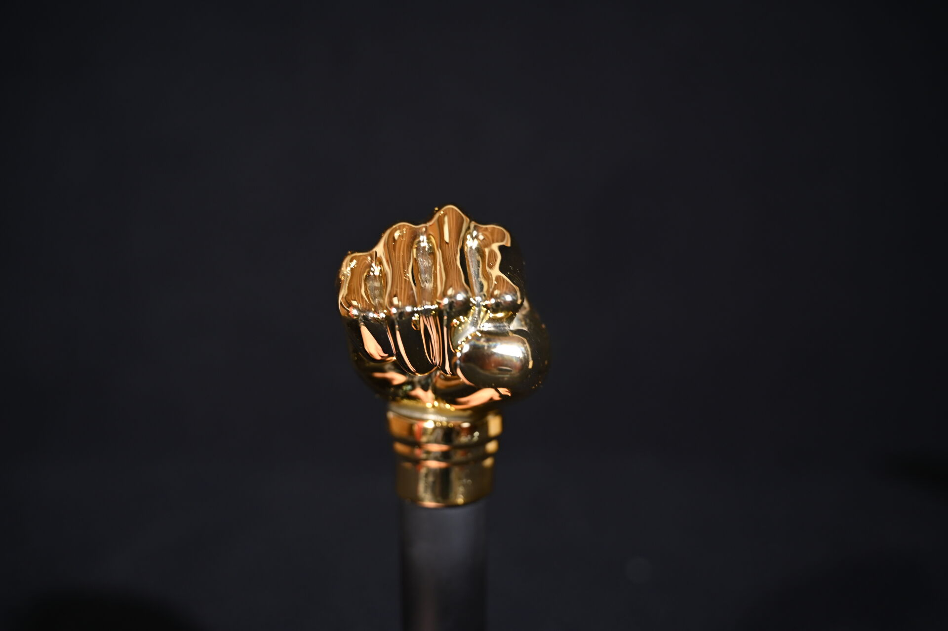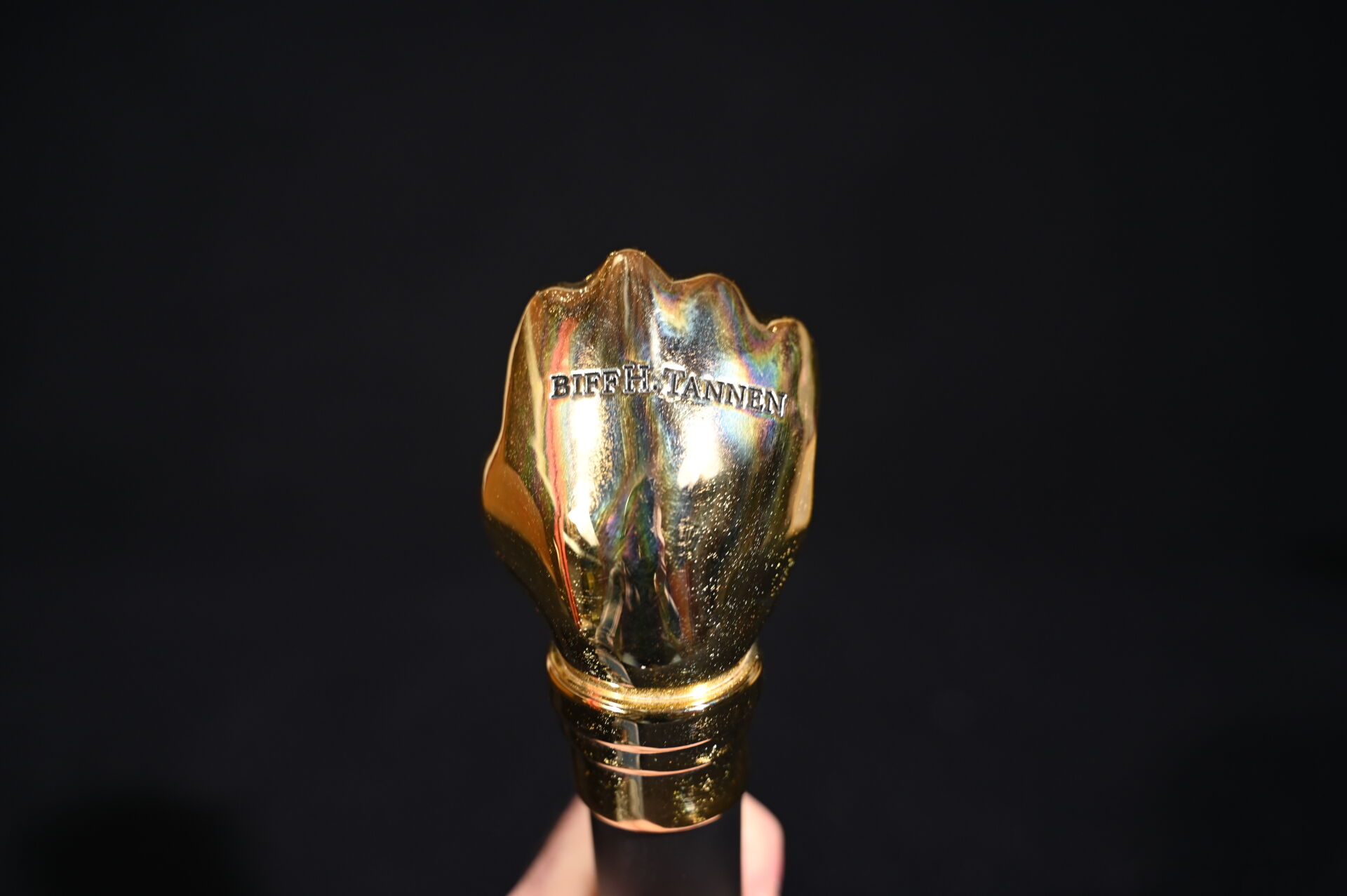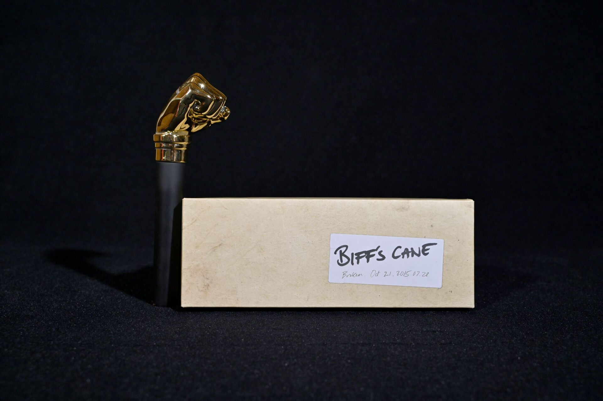 RETOUR VERS LE FUTUR – BACK TO THE FUTURE – DMC. Réplique la canne brisée de Biff H. Tannen avec le poing doré. Long. : 25 cm.