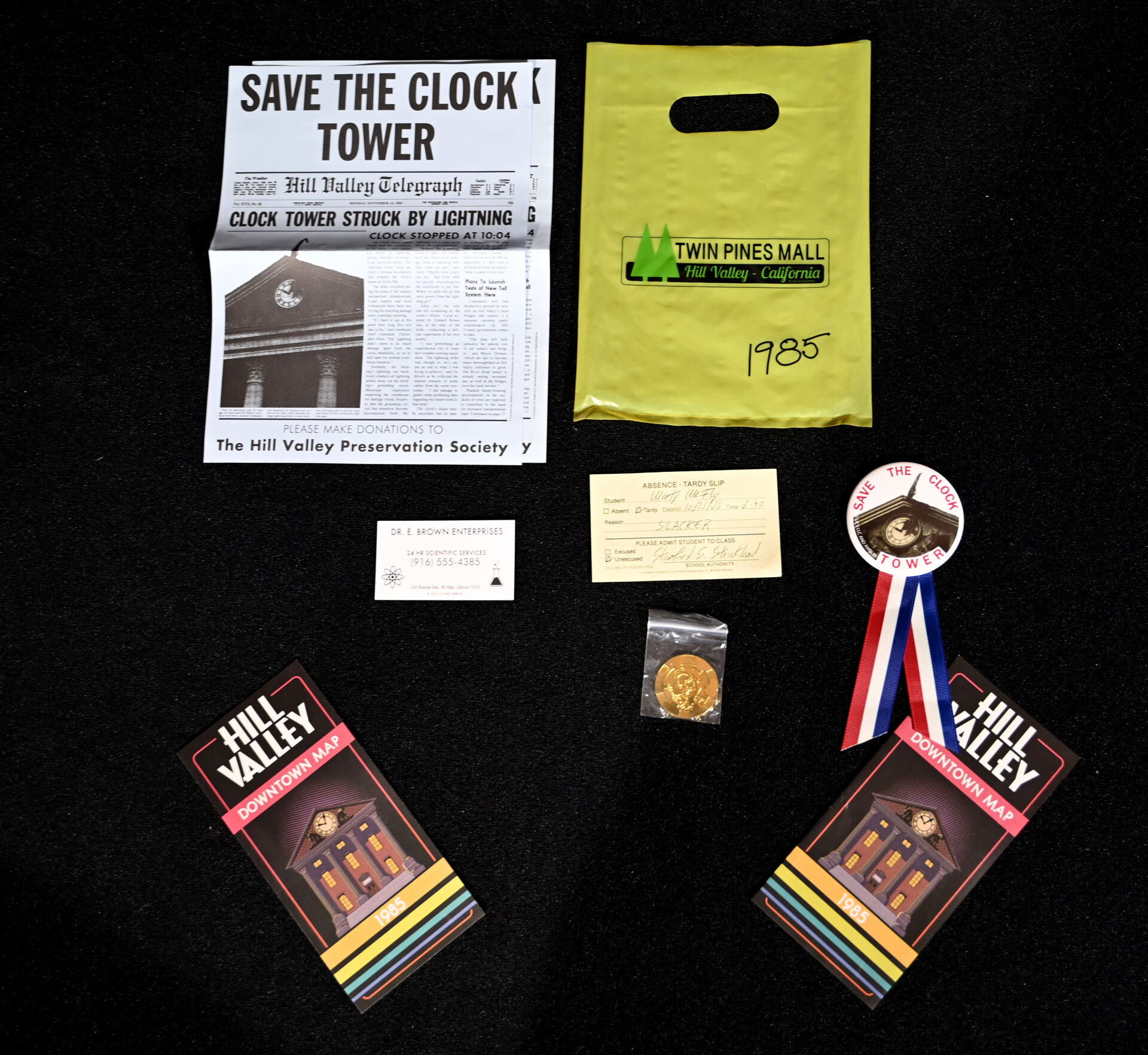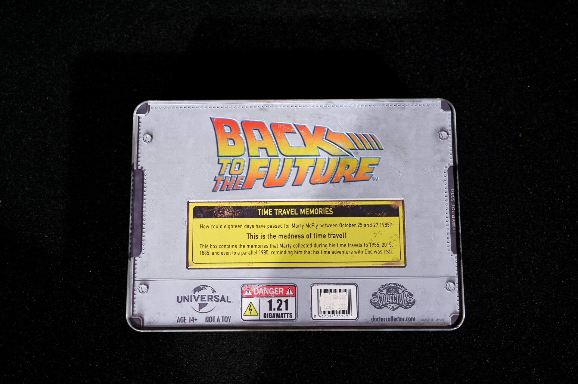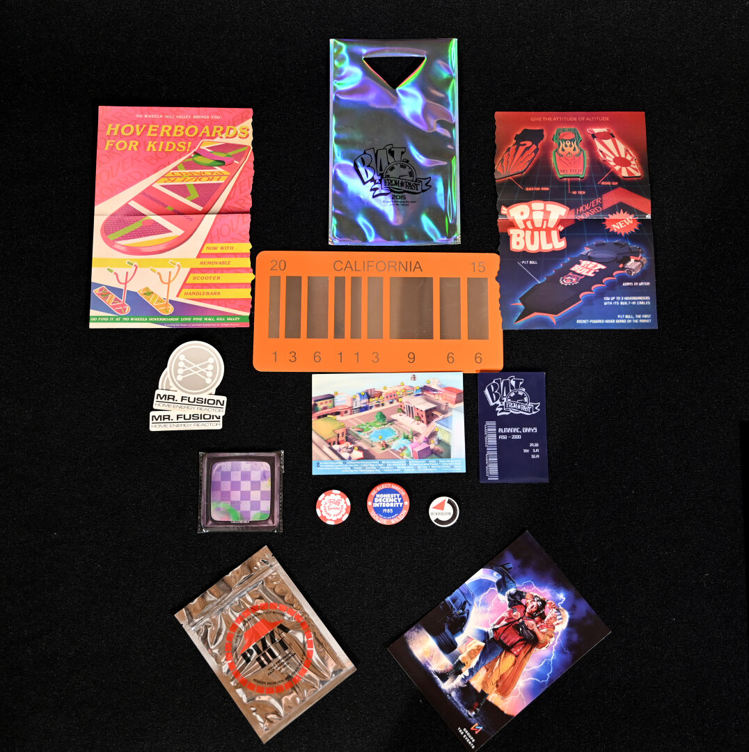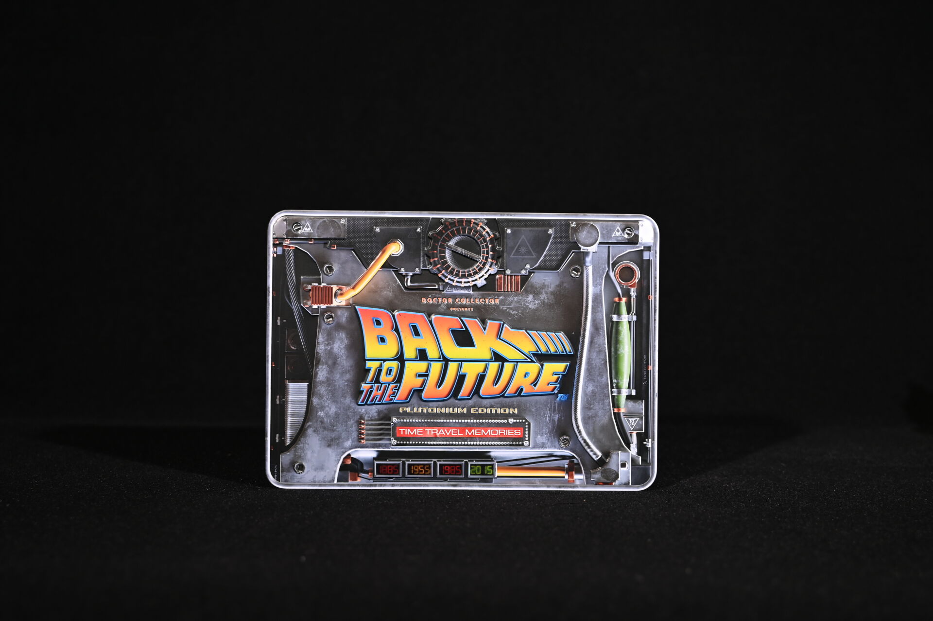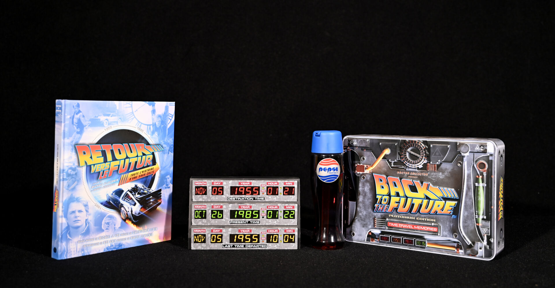 RETOUR VERS LE FUTUR – BACK TO THE FUTURE – DOCTOR COLLECTOR. Boîte « Back to The Future Plutonium Edition – Time Travel Editions » comprenant des goodies (aucune information sur la complétude). Dim de la boîte : 22 x 31 x 7 cm. On joint un livre « Retour vers le Futur – Toute l’Histoire d’une Saga Culte » Huginn & Muninn 2015, une bouteille PEPSI PERFECT et un compteur factice. Dim de la boîte : 22 x 31 x 7 cm.