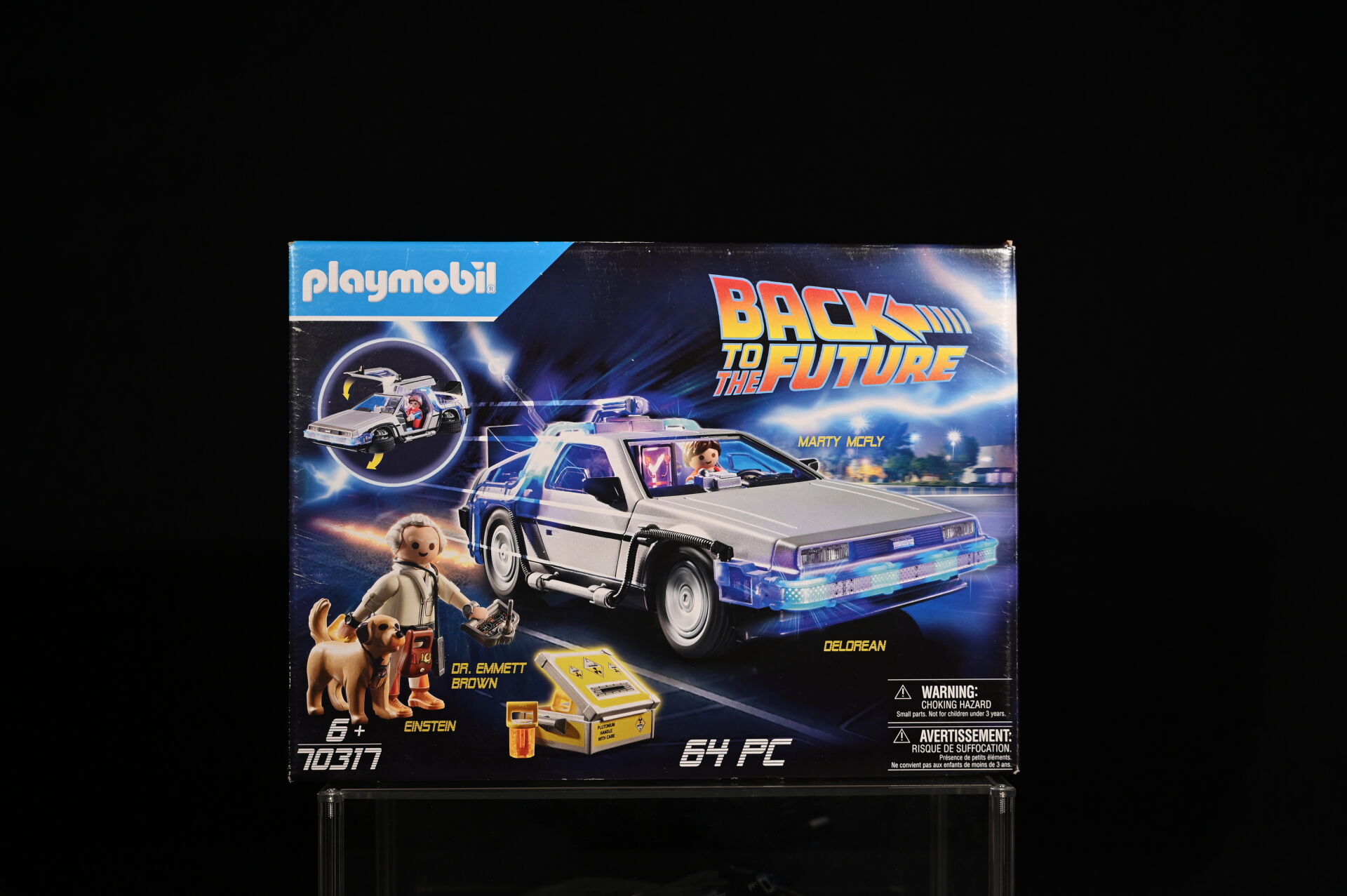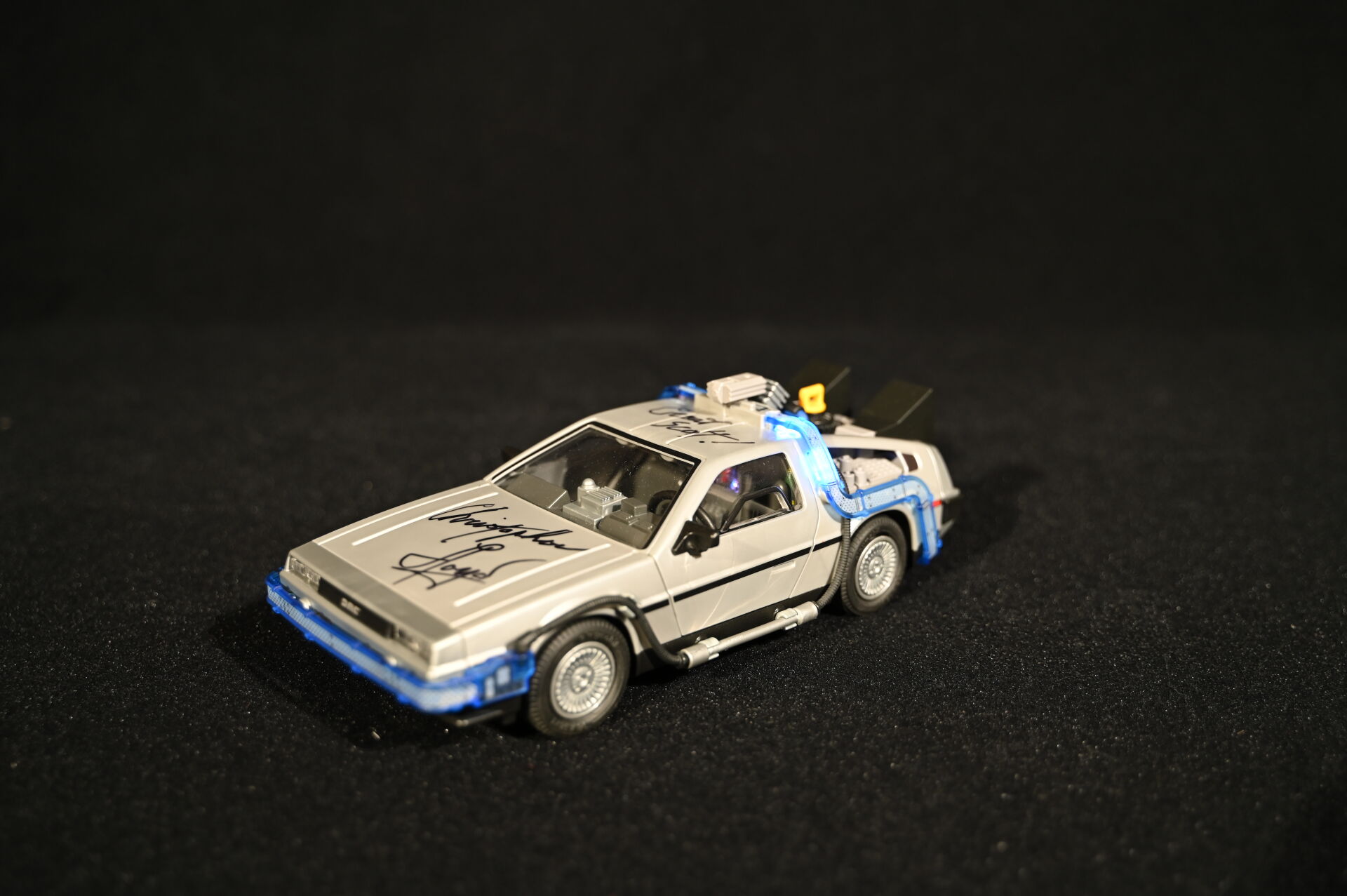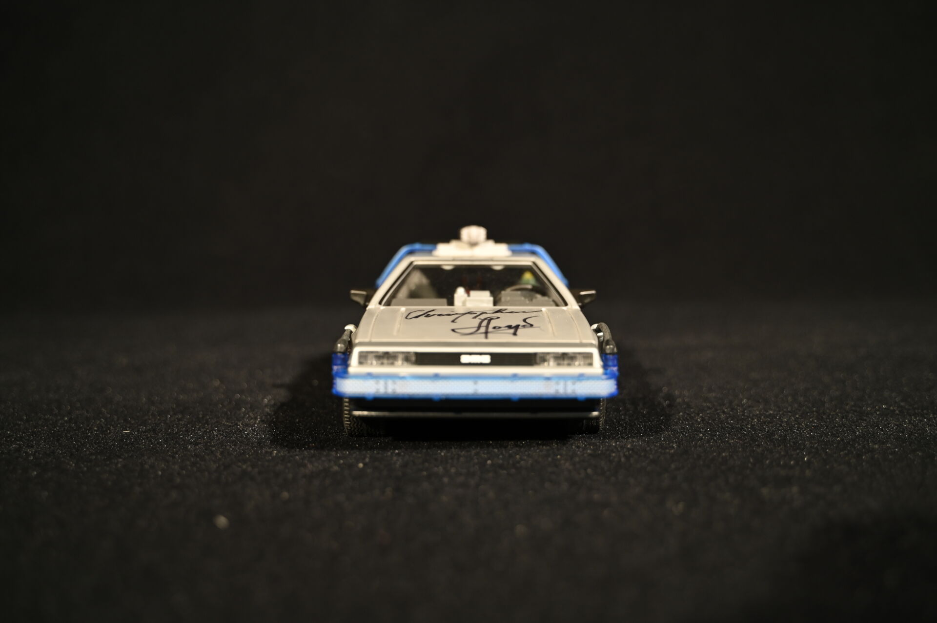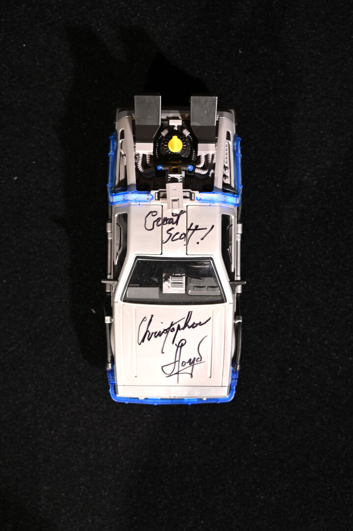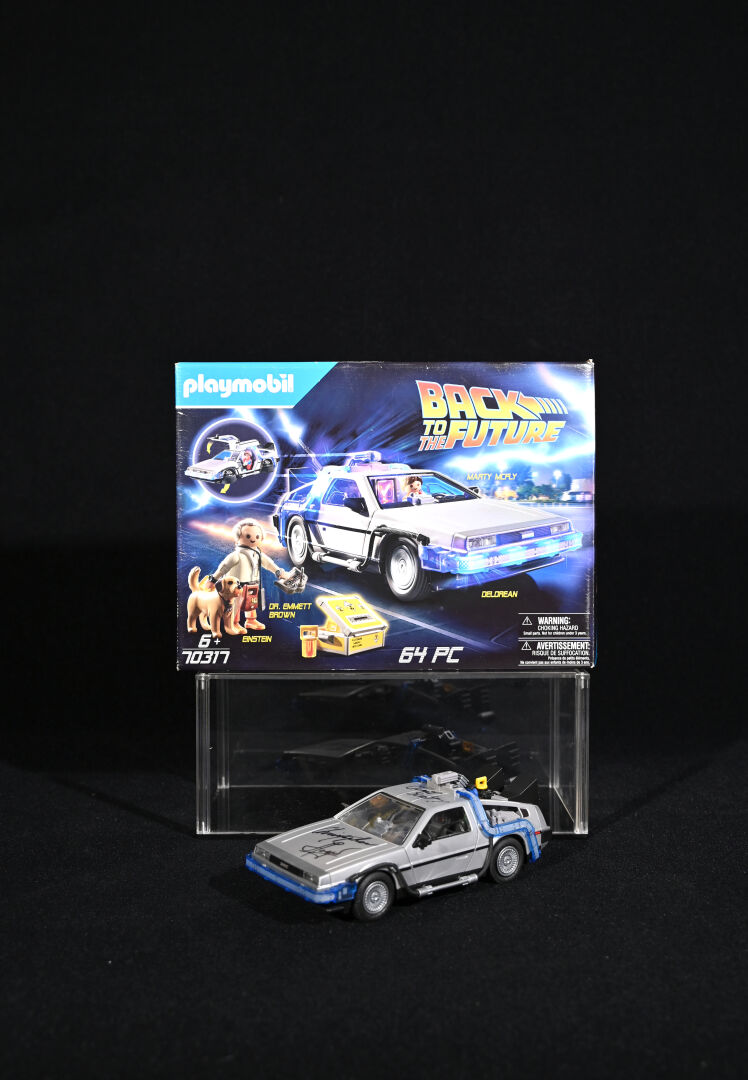 RETOUR VERS LE FUTUR – BACK TO THE FUTURE – PLAYMOBIL. Voiture modèle Delorean signée par l’acteur Christopher Lloyd et dédicacée « Great Scott ! ». Électrifiée. Référence 70317. 2020. Dim. de la vitrine en plexiglas : 15 x 35,5 x 16,5 cm. Dim. de la voiture Haut. : 8,5 cm – Long. : 25 cm – Prof. : 11,5 cm. On joint sa boîte, des accessoires Playmobil, et une réplique des clefs de la Delorean. Aucune garantie de complétude du set (ouvert).