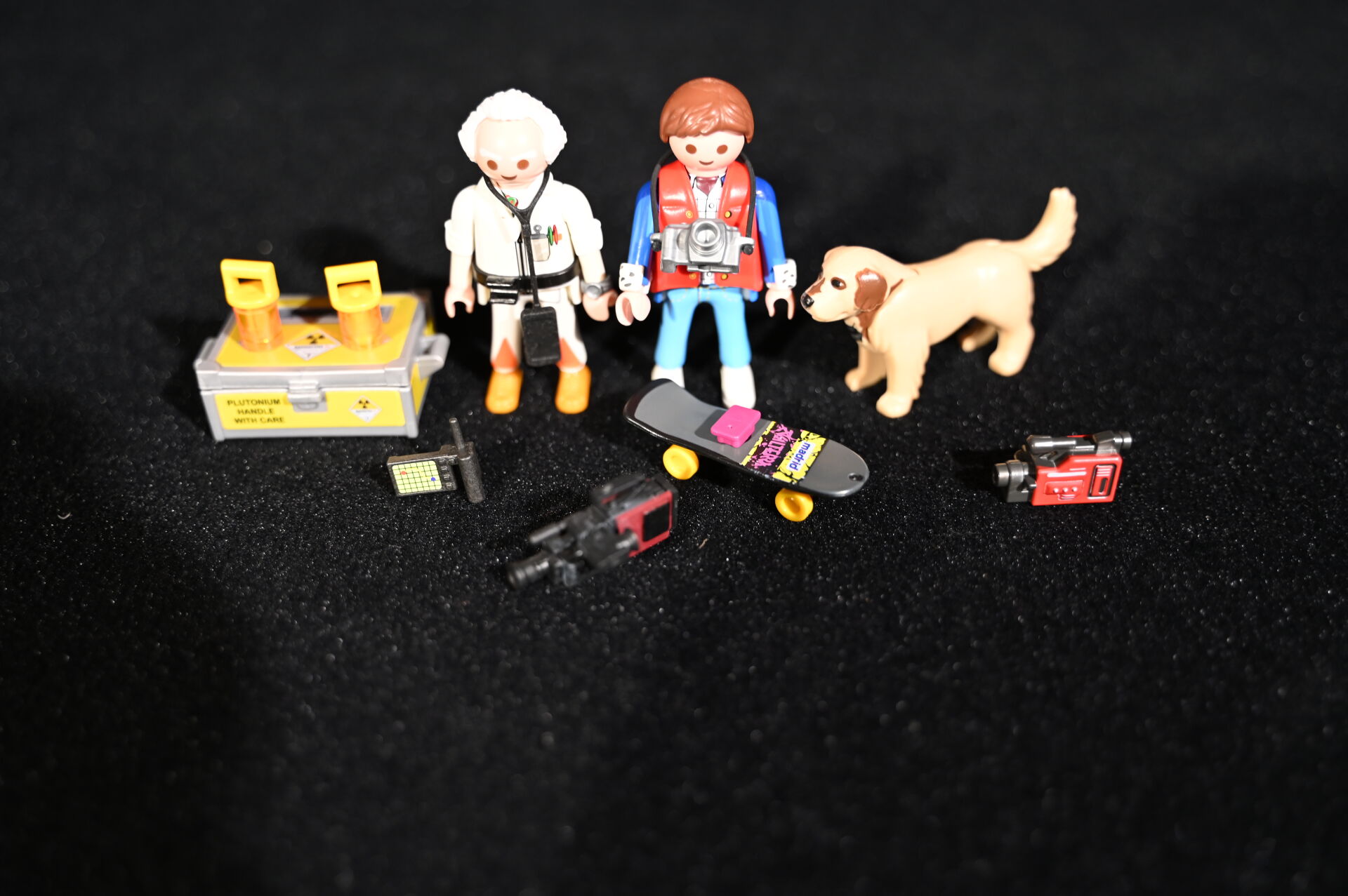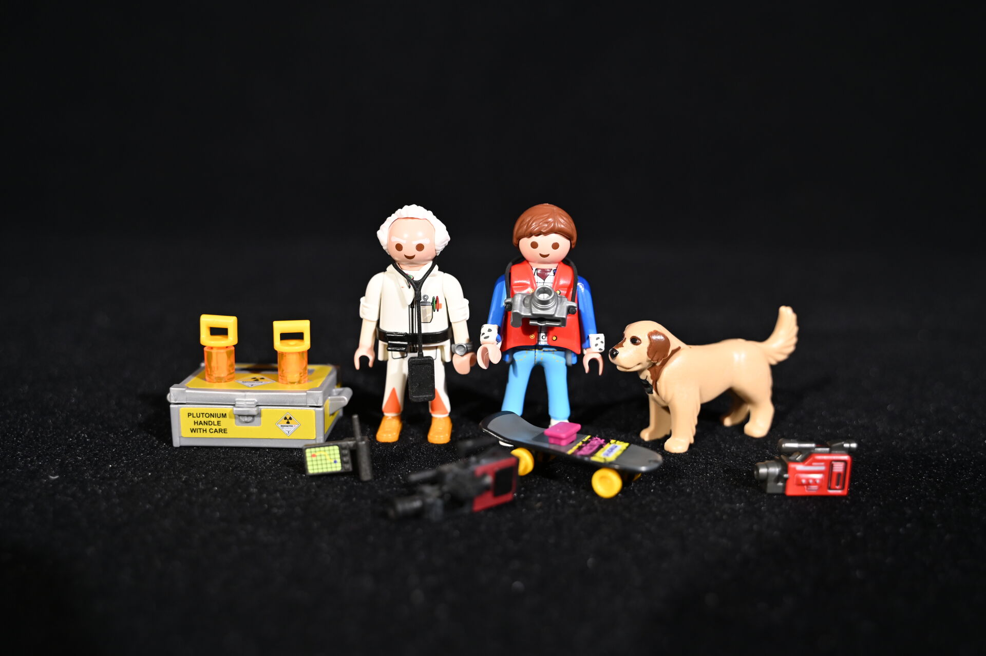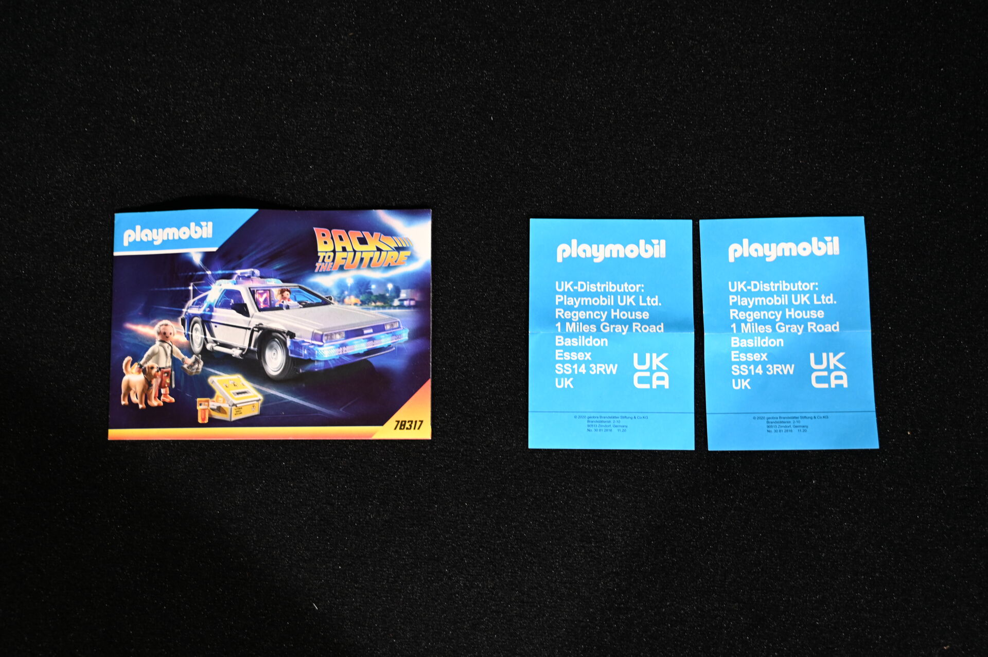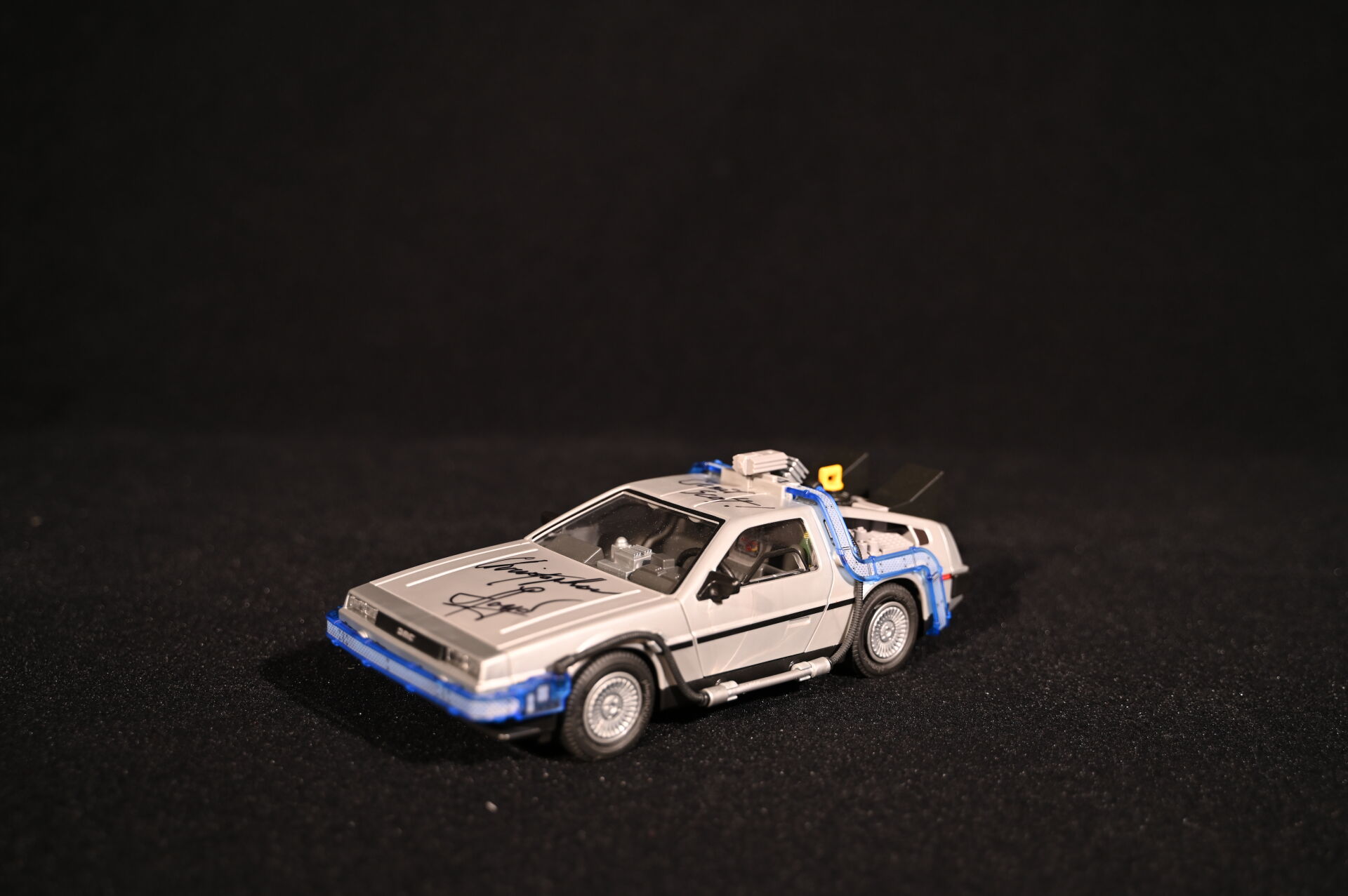 RETOUR VERS LE FUTUR – BACK TO THE FUTURE – PLAYMOBIL. Voiture modèle Delorean signée par l’acteur Christopher Lloyd et dédicacée « Great Scott ! ». Électrifiée. Référence 70317. 2020. Dim. de la vitrine en plexiglas : 15 x 35,5 x 16,5 cm. Dim. de la voiture Haut. : 8,5 cm – Long. : 25 cm – Prof. : 11,5 cm. On joint sa boîte, des accessoires Playmobil, et une réplique des clefs de la Delorean. Aucune garantie de complétude du set (ouvert).