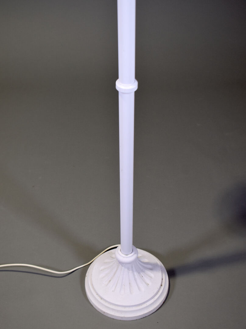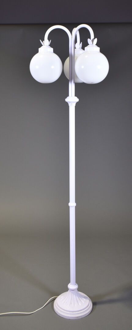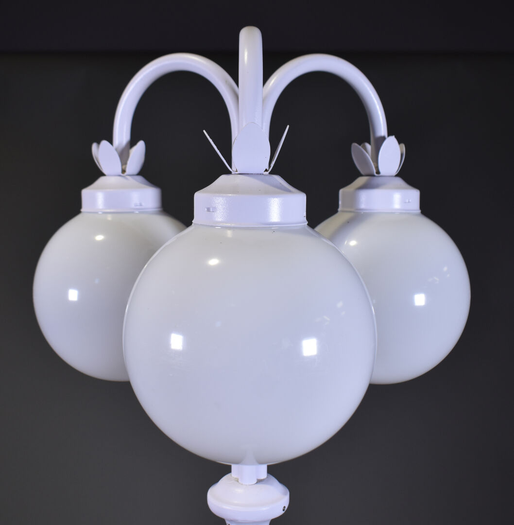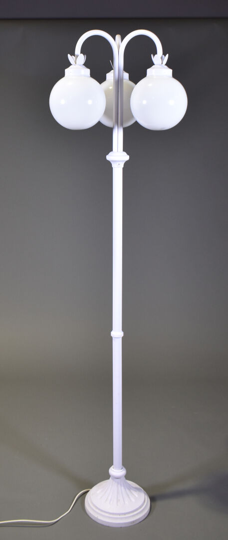 (*) Réverbère de terrasse en métal laqué crème à trois globes en plastique blanc (usures d’usage). Haut. : 190 cm.