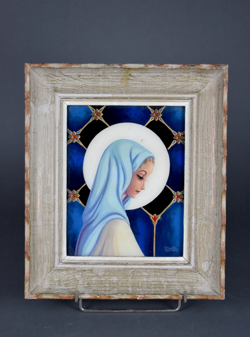 REVOLLON (XXe siècle). Figure de la vierge peinte sous verre. Signé. 22,5 x 17,8 cm (à vue).