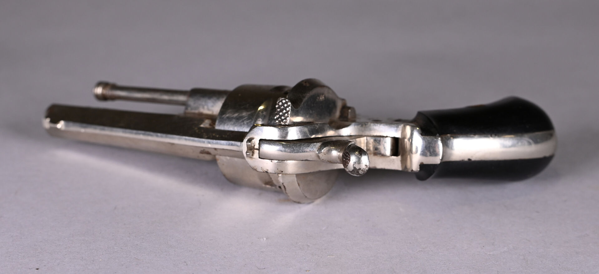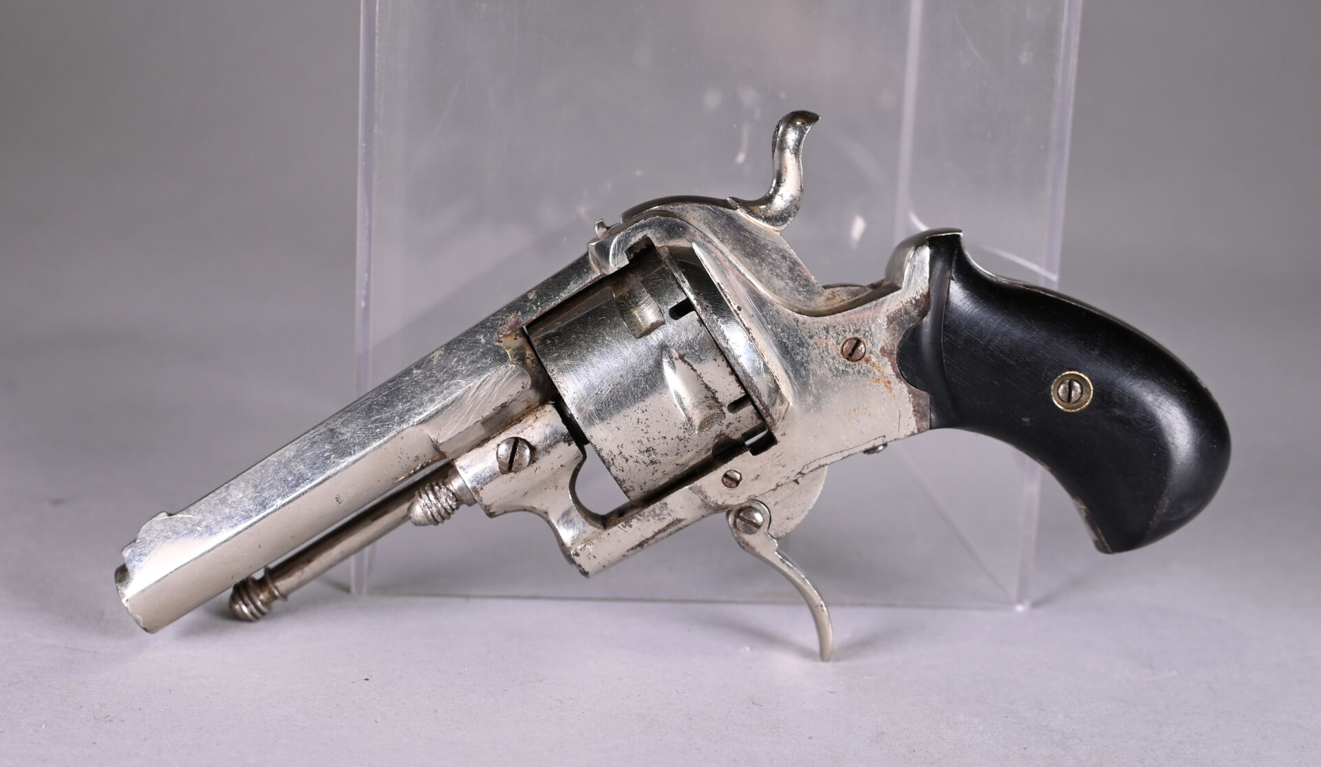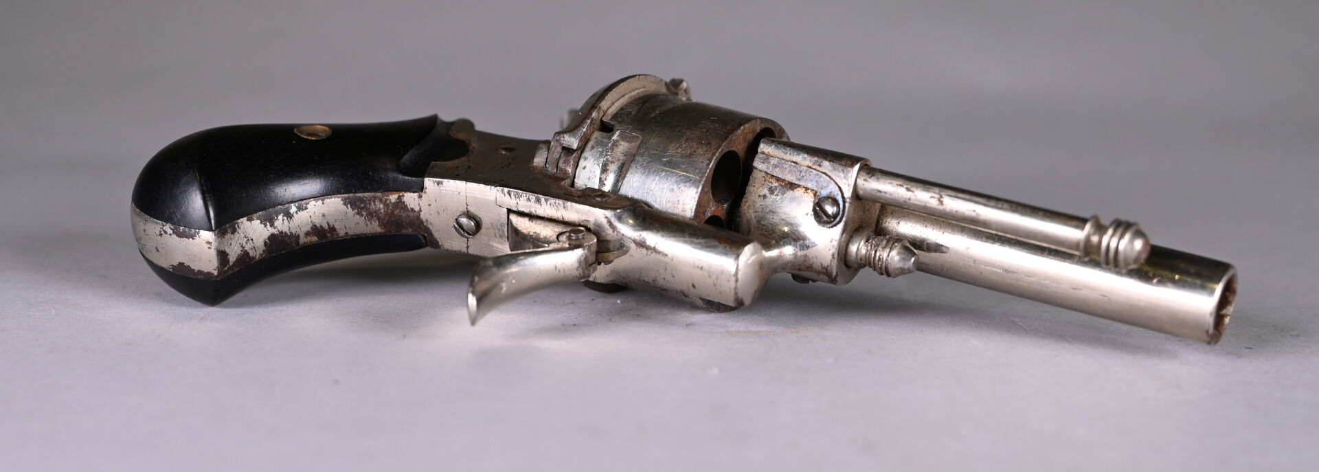 Révolver à broche type Falgnus, calibre 8 mm. à broche. Finitions nickelées. Canon de 80 mm, à trois pans plats sur le dessus et rond sur sa partie inférieure. Mécanisme fonctionnel en simple et double action. Canon rayé à nettoyer. Plaquettes ébène. Etat 2+. Cat D.