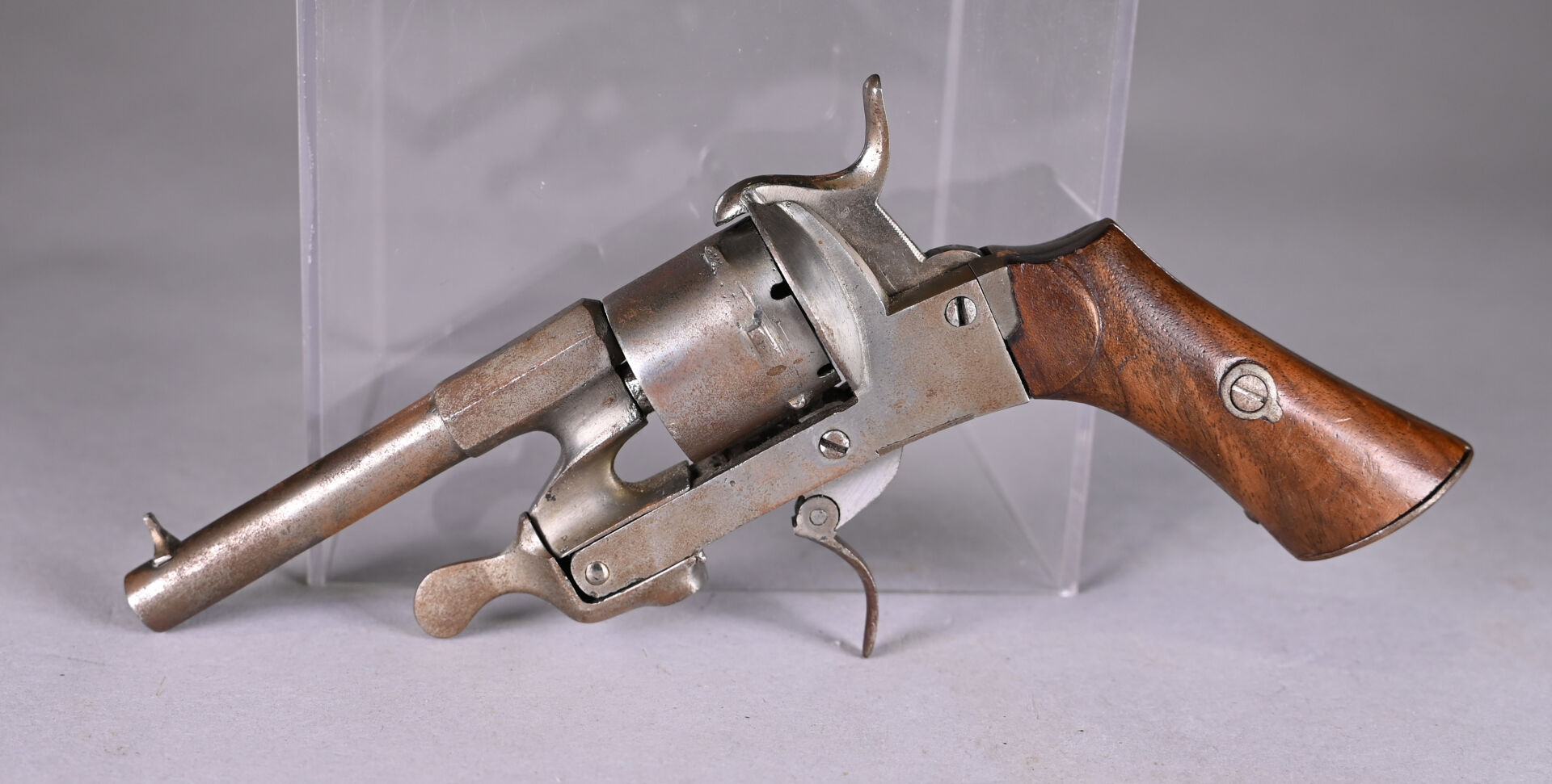 Révolver à broches type Lefaucheux calibre 7 mm, à broches, canon basculant au moyen d’une clé. Mécanisme fonctionnel. Canon octogonal puis rond de 85 mm. Piqures profondes à l’âme. Monture fer, plaquettes bois. État 2+. Cat D.
