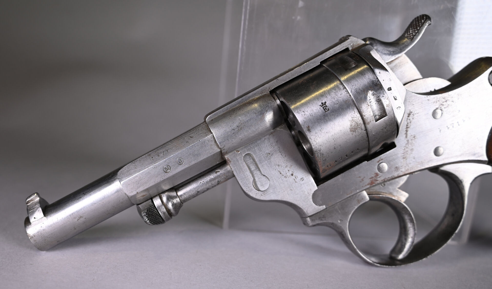 Révolver règlementaire français modèle 1873, fabrication 1877. Arme monomatricule numérotée G47144. Mécanisme fonctionnel. Très bon canon pour le tir. Plaquettes bois quadrillées. Fabrication manufacture d’armes de Saint-Etienne. État 1-. Cat D.