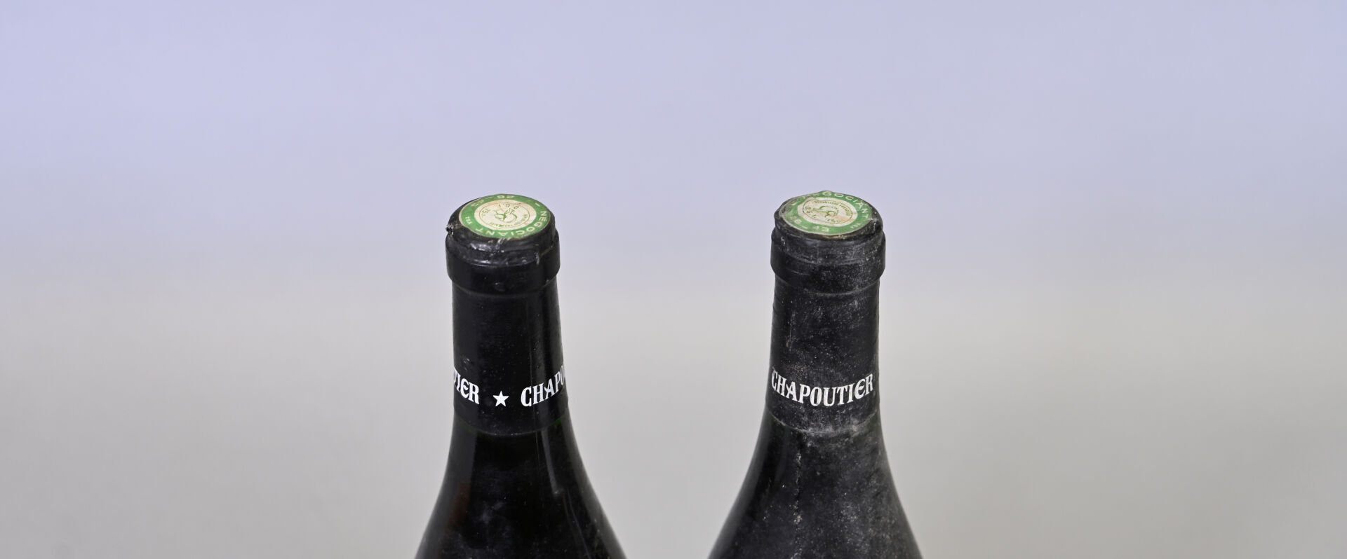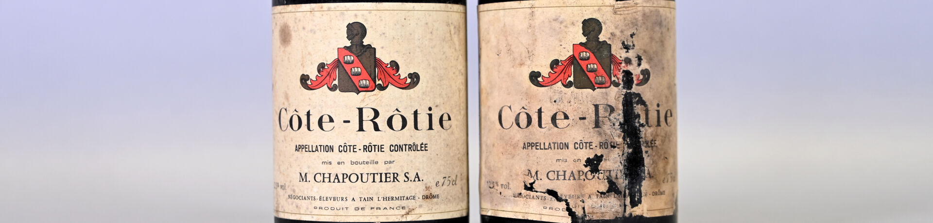 RHÔNE – 2 bouteilles, Côte Rôtie, Chapoutier, 1988 (dont une bouteille est peut-être de ce millésime). Capsules légèrement sales et déformées en leur sommet. Une collerette est très sale et dégradée, l’autre collerette est manquante. Etiquettes sales dont une est dégradée.