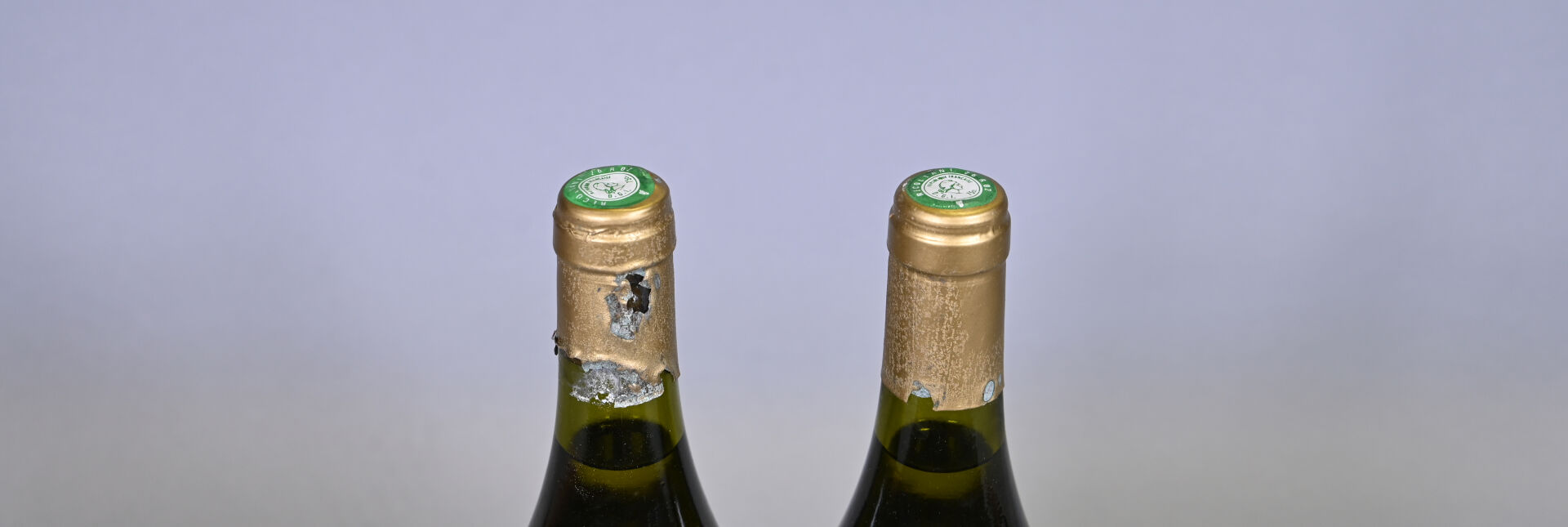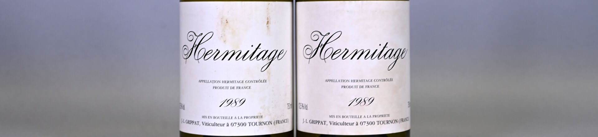 RHÔNE – 2 bouteilles, Hermitage (blanc), Jean-Louis Grippat, 1989. Capsules légèrement sales à sales et légèrement abimée pour une et très abimée pour l’autre. Etiquettes légèrement sales avec des traces d’humidité.