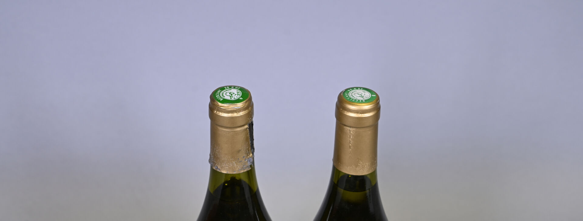 RHÔNE – 2 bouteilles, Hermitage (blanc), Jean-Louis Grippat, 1989. Capsules légèrement sales dont une est abimée et présente une déchirure ainsi qu’un manque au niveau de sa jupe. Etiquettes légèrement sales à sales avec des traces d’humidité et dont une est également légèrement abimée.