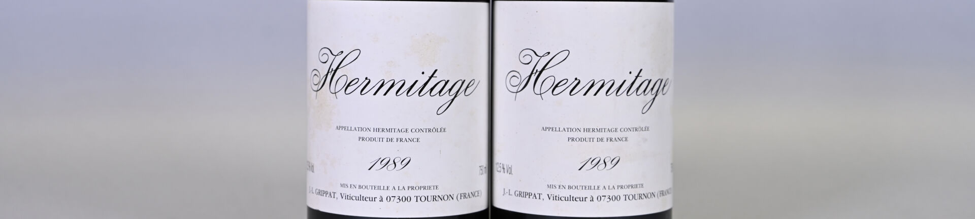 RHÔNE – 2 bouteilles, Hermitage, Jean-Louis Grippat, 1989. Un niveau à 2,4 cm. Une capsule très légèrement déformée en son sommet. Etiquettes légèrement sales et tachées.