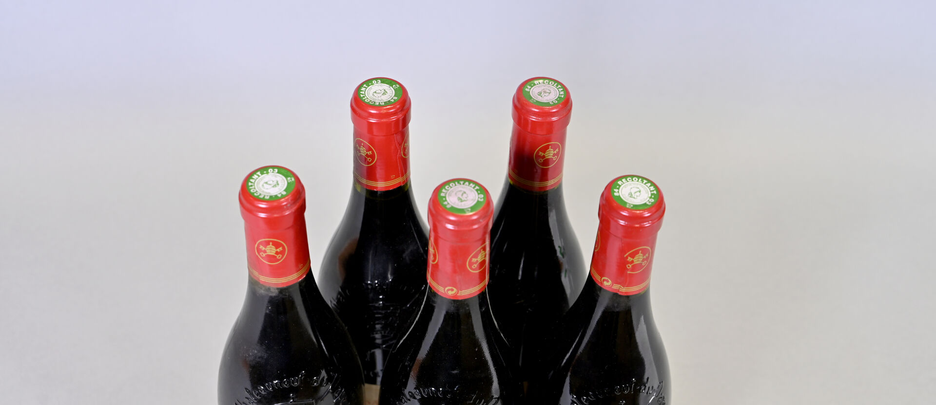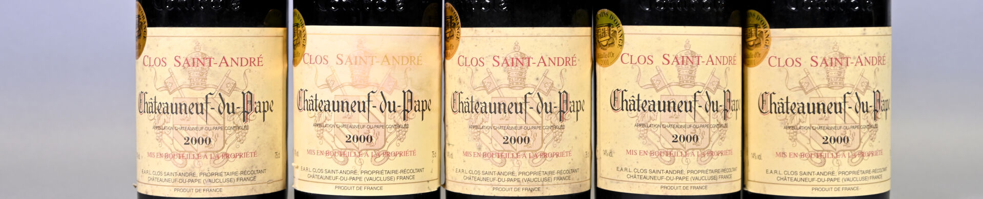 RHÔNE – 5 bouteilles, Châteauneuf-du-Pape, Clos Saint-André, 2000. Etiquettes légèrement sales à sales dont deux sont légèrement abimées. Contre-étiquettes légèrement sales et abimées.