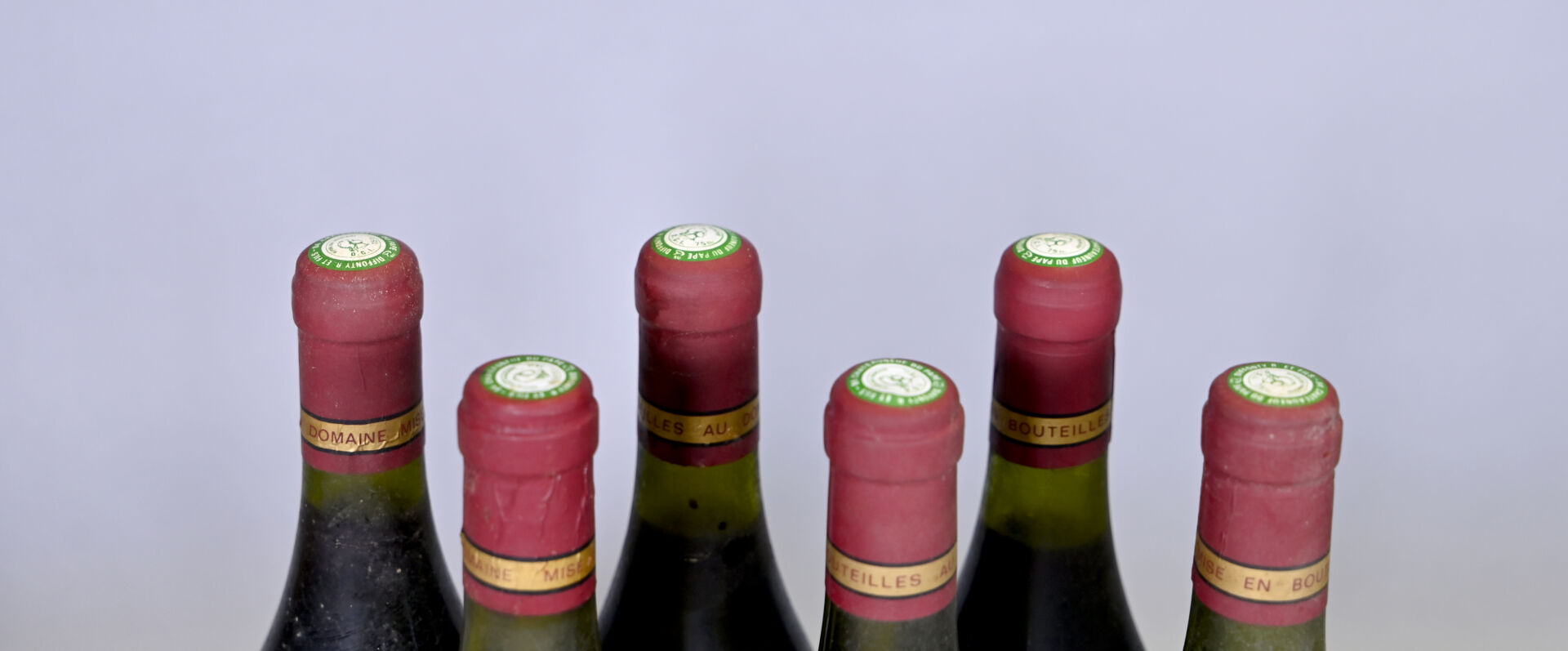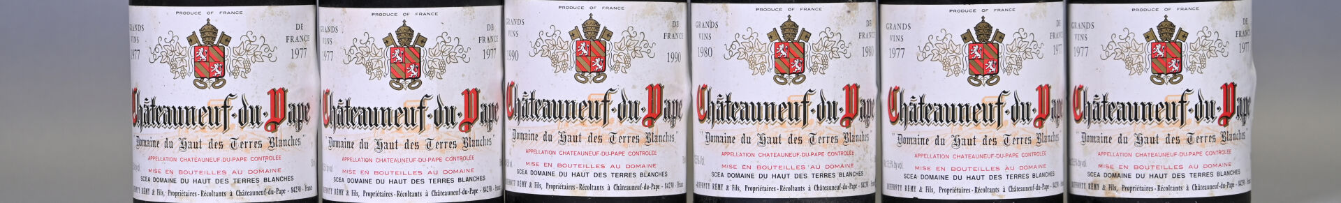 RHÔNE – 6 bouteilles, Châteauneuf-du-Pape, Domaine du Haut des Terres Blanches, 1977 (4), 1980 (1) et 1990 (1). Niveaux à 1,5 cm, 2 cm, 2,2 cm, 2,4 cm, 3,2 cm et 3,5 cm. Capsules légèrement sales et bombées. Etiquettes légèrement sales avec des plis et petits points de décollement.