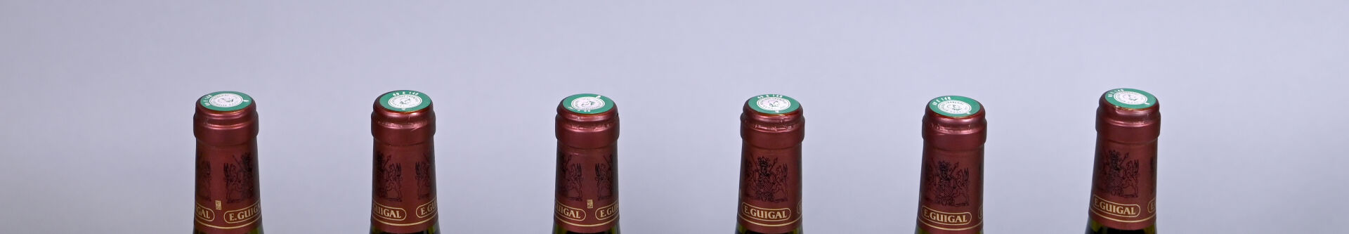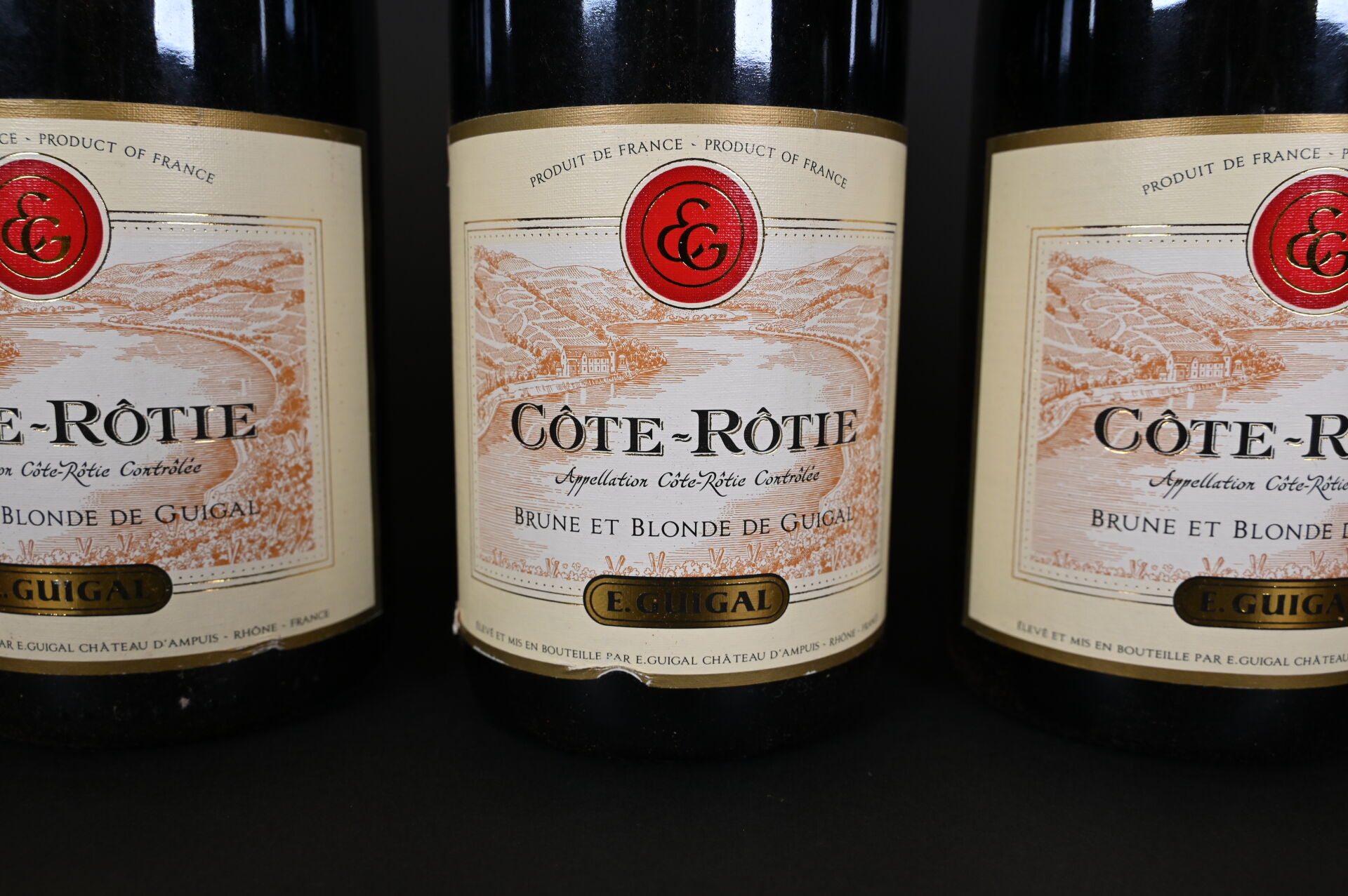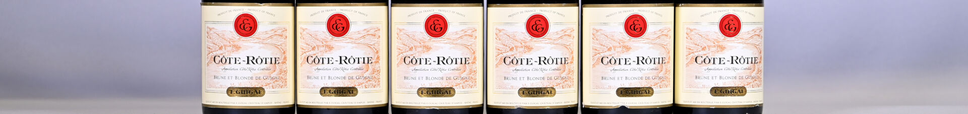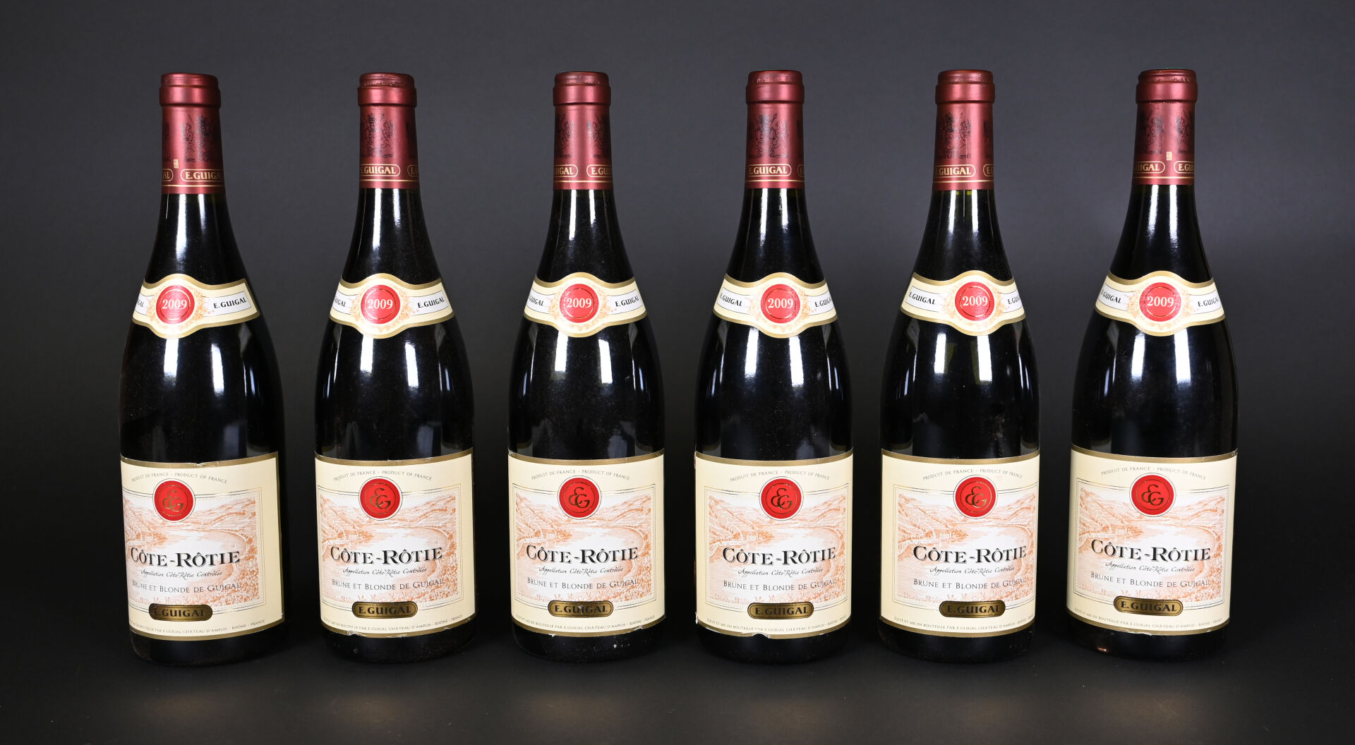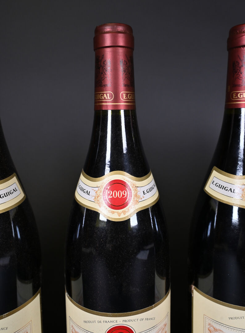 RHÔNE – 6 bouteilles, Côte-Rôtie, Guigal, Brune et Blonde de Guigal, 2009. Quatre étiquettes présentent un petit pli au niveau de leur bord inférieur.