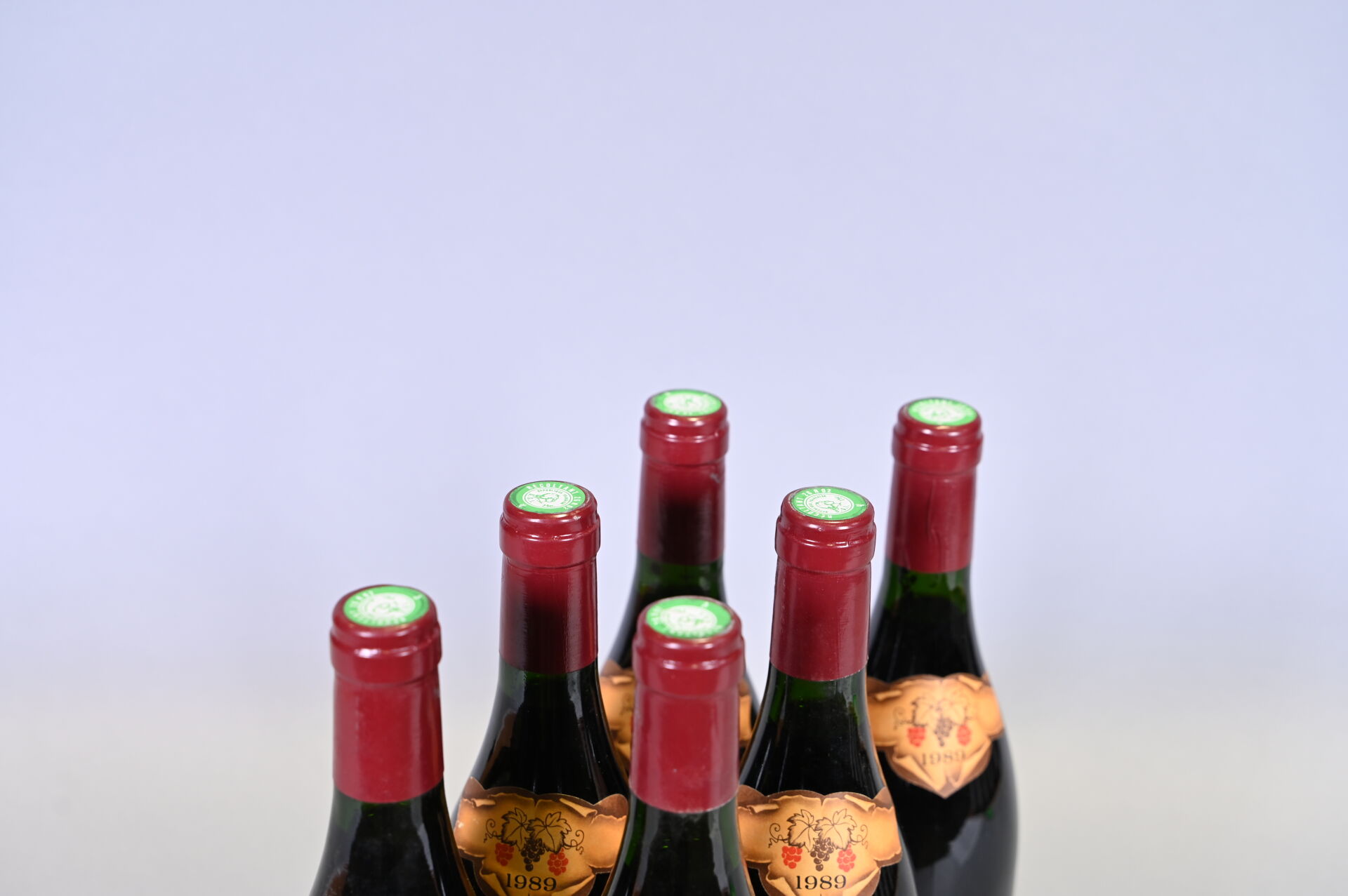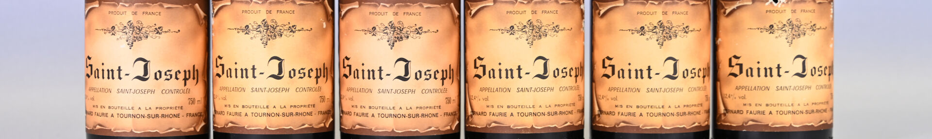 RHÔNE – 6 bouteilles, Saint-Joseph, Bernard Faurie, 1989. Un niveau à 2 cm et un niveau à 2,4 cm. Capsules avec quelques légères traces dont une est très légèrement incurvée. Collerettes avec quelques légères égratignures. Etiquettes avec quelques petits points de décollement dont trois sont légèrement abimées à abimées.