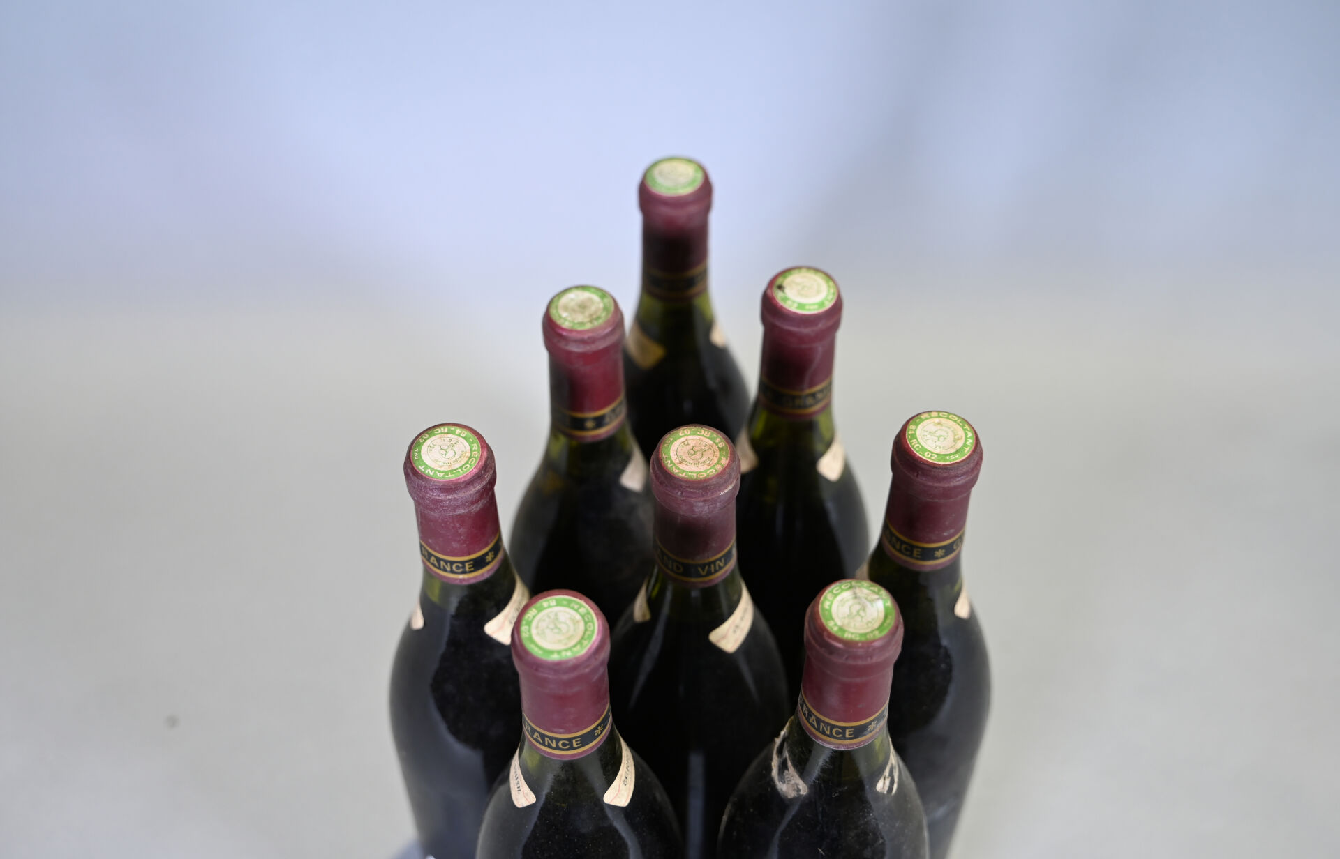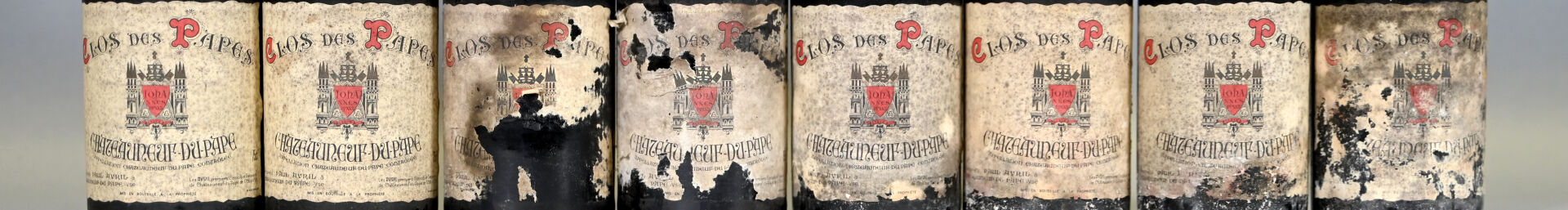 RHÔNE – 8 bouteilles, Châteauneuf-du-Pape, Clos des Papes, 1982. Niveaux à 1,8 cm, 2 cm (2), 2,3 cm, 2,8 cm, 3 cm, 4 cm et 4,8 cm. Capsules sales et déformées en leur sommet. Collerettes sales. Etiquettes sales à très sales et légèrement abimées à très dégradées.