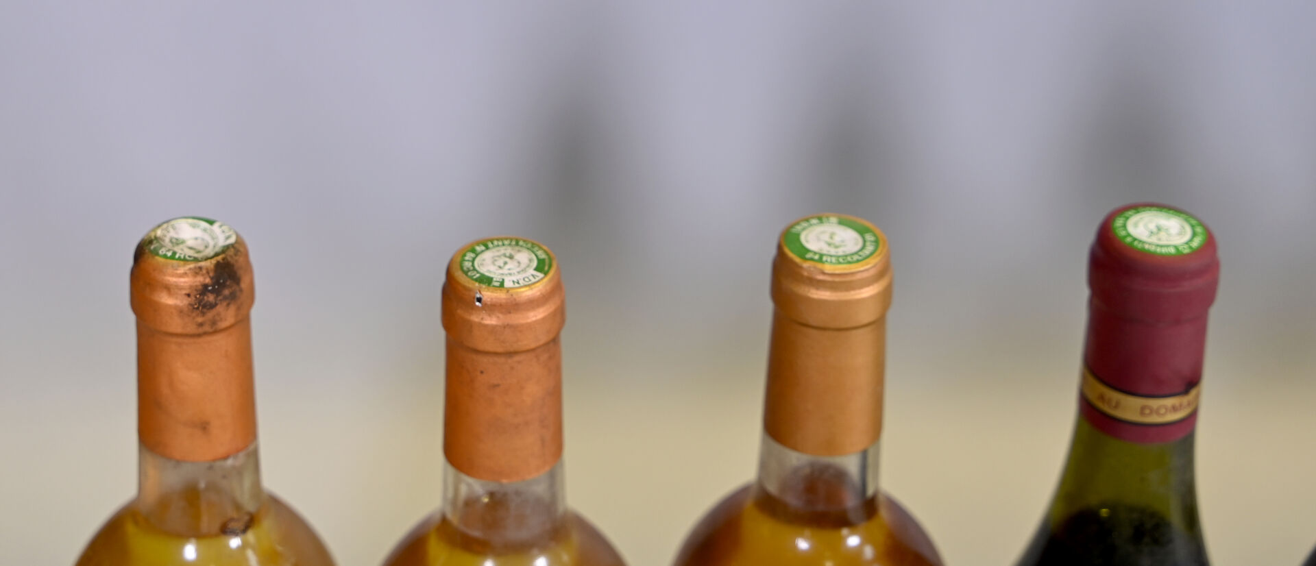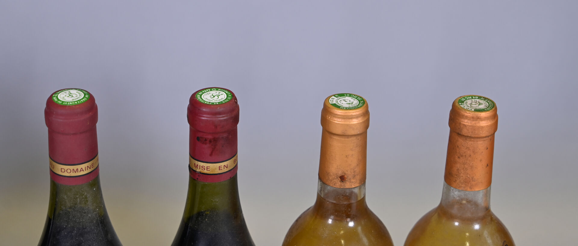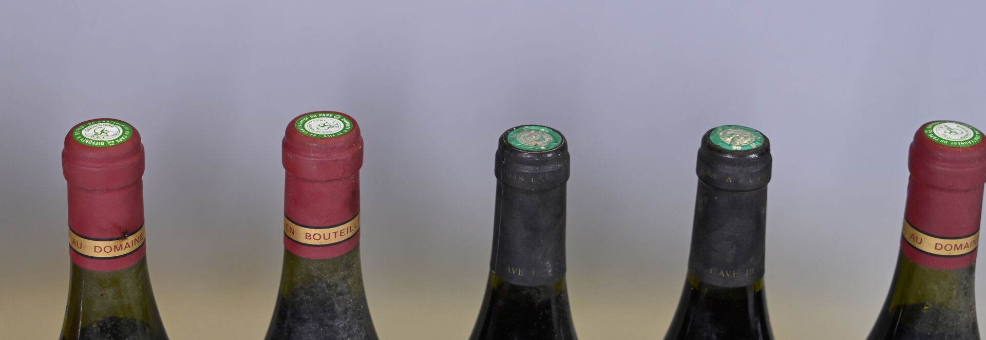 4 bouteilles, Châteauneuf-du-Pape, Domaine du Haut des Terres Blanches, 1980. Niveaux à 2,3 cm, 3 cm, 3,5 cm et 3,7 cm. Capsules légèrement sales. Etiquettes légèrement sales à sales dont une est également abimée.