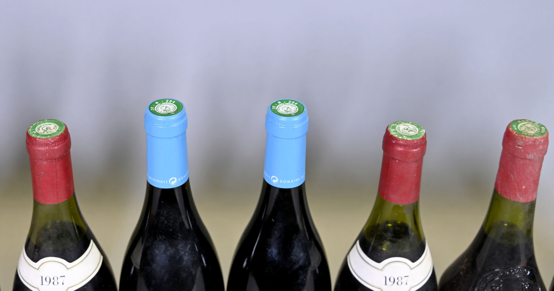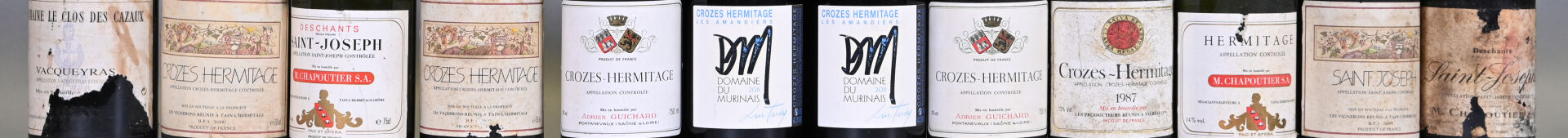 2 bouteilles, Crozes-Hermitage, Adrien Guichard, 1987. 3,7 cm et 3,8 cm. Capsules, collerettes et étiquettes avec des traces.