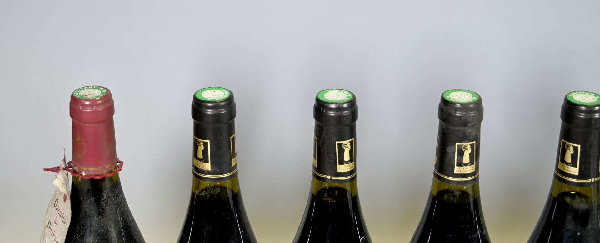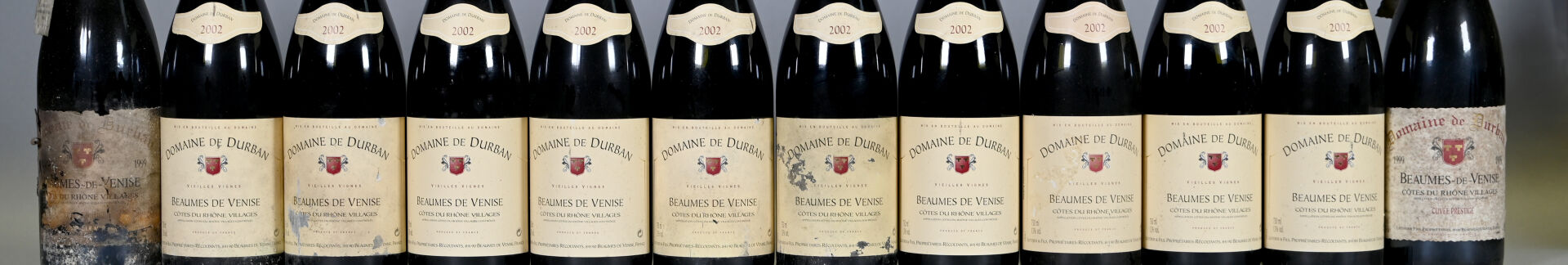 10 bouteilles, Côtes du Rhône Villages ‘Beaumes de Venise’, Domaine de Durban, Vieilles Vignes, 2002. Collerettes avec des traces. Etiquettes légèrement sales dont quatre sont légèrement abimées à abimées.