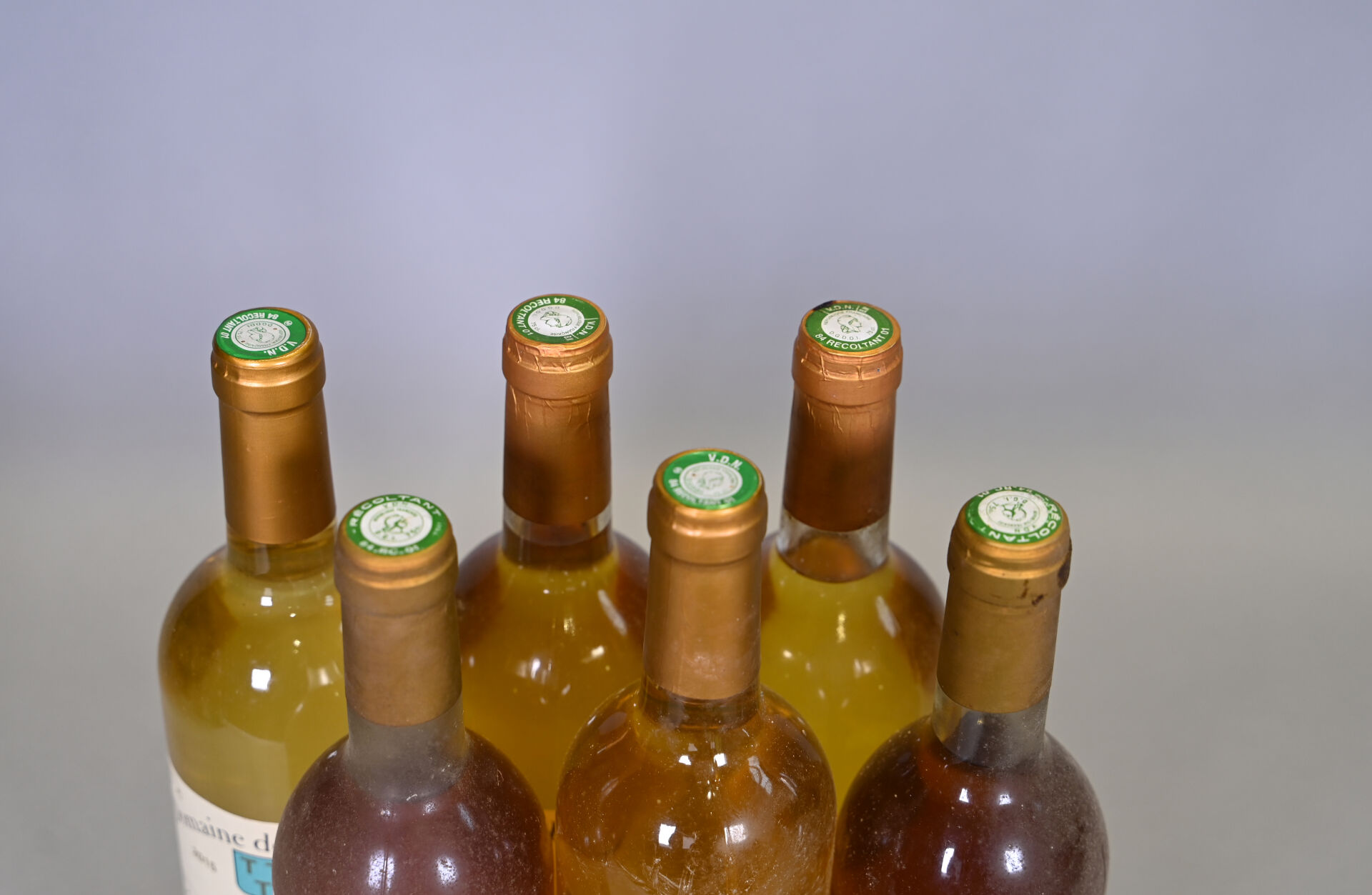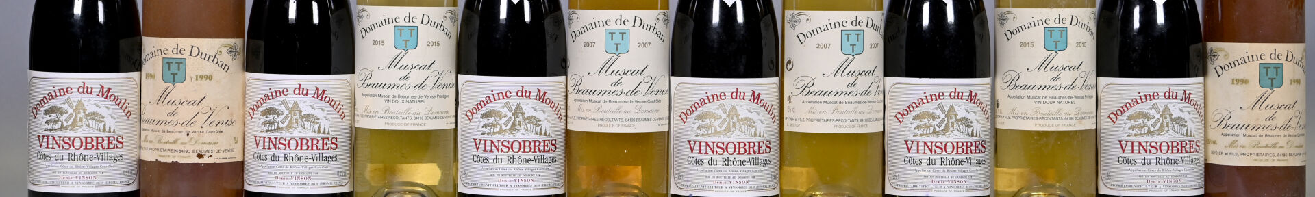 6 bouteilles, Muscat de Beaumes-de-Venise, Domaine de Durban, 1990 (2), 2007 (2) et 2015 (2). 1 BG et 1 TLB (+). Capsules légèrement sales. Etiquettes légèrement sales dont une est légèrement abimée.